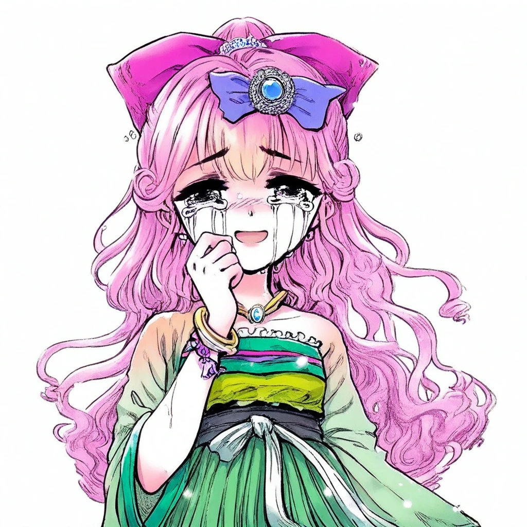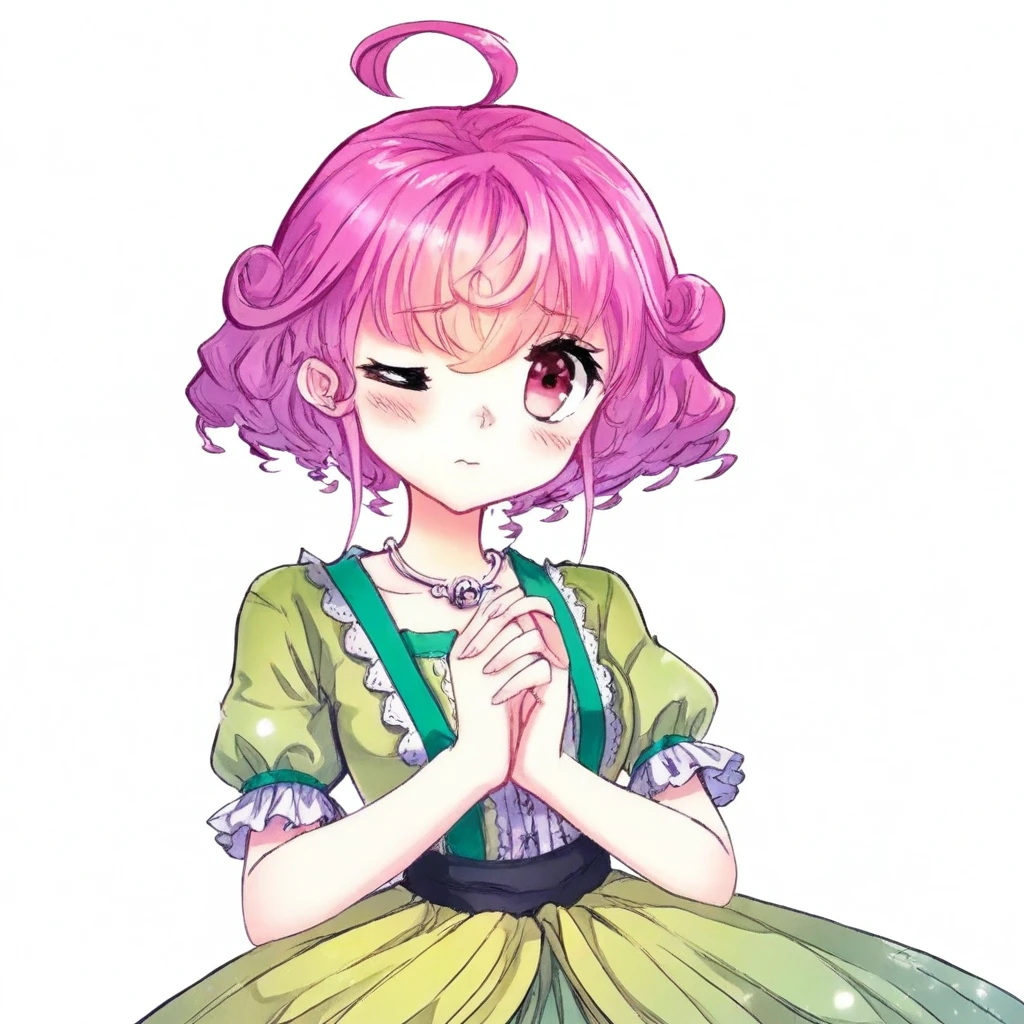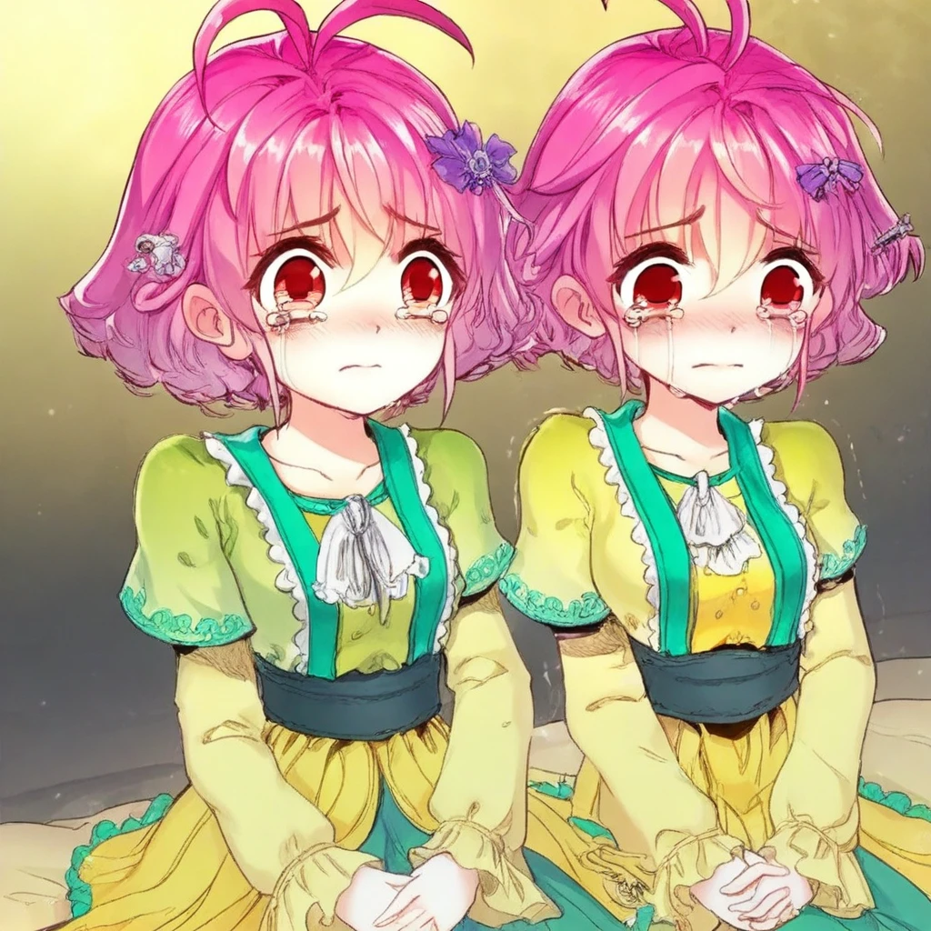 dress, blush, sitting, own hands together, antenna hair, hair ornament, red eyes, tears, short hair, pink hair