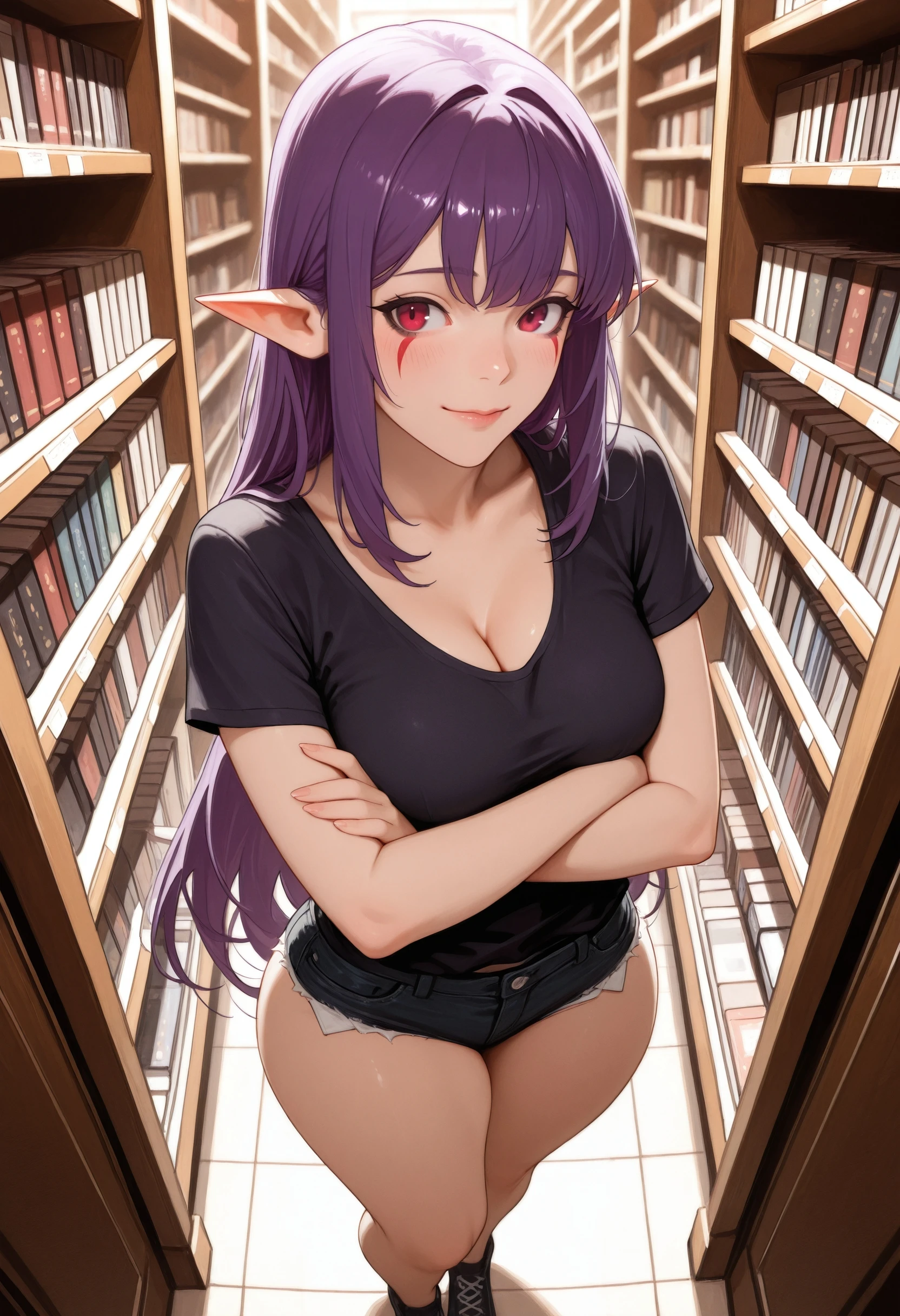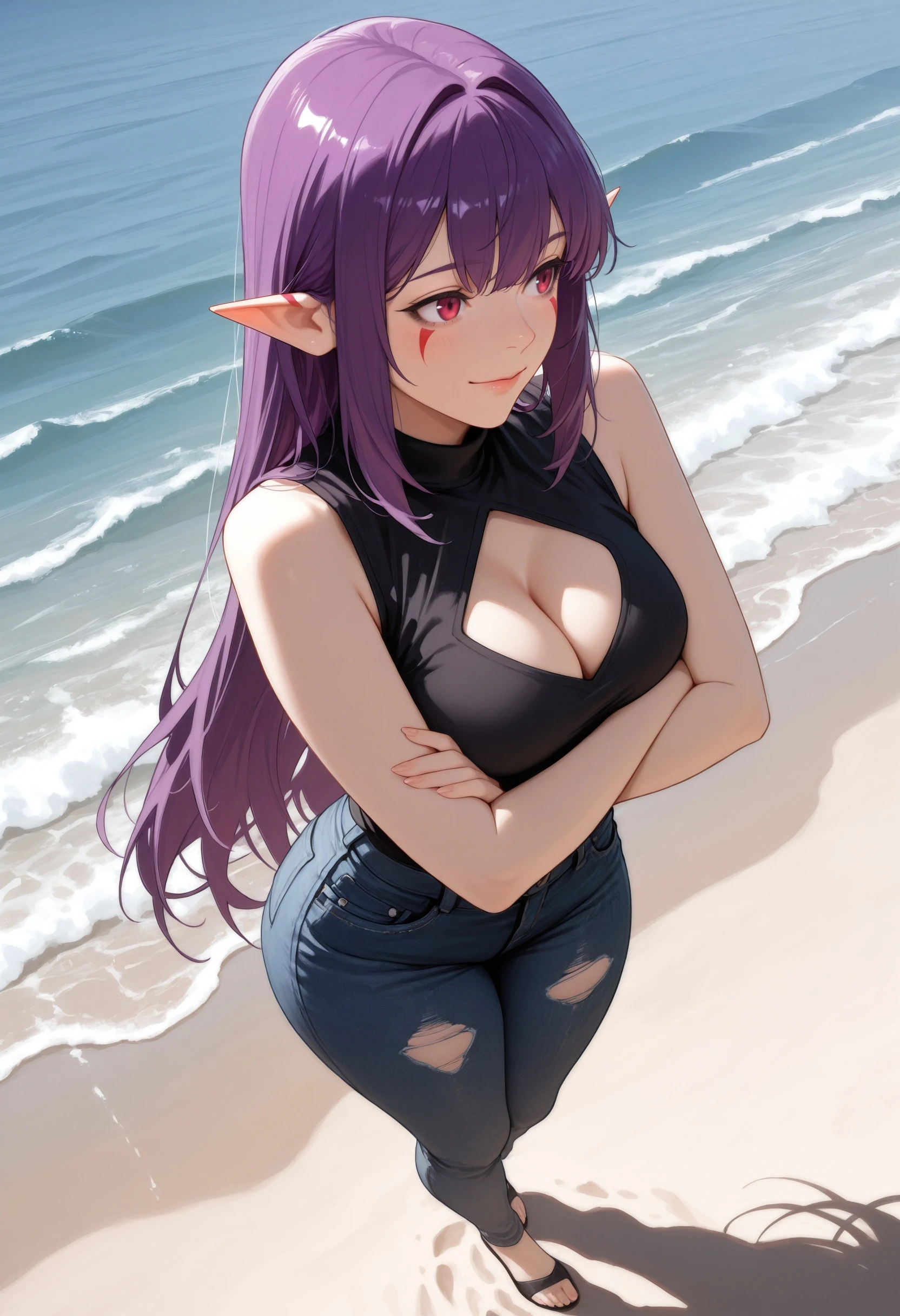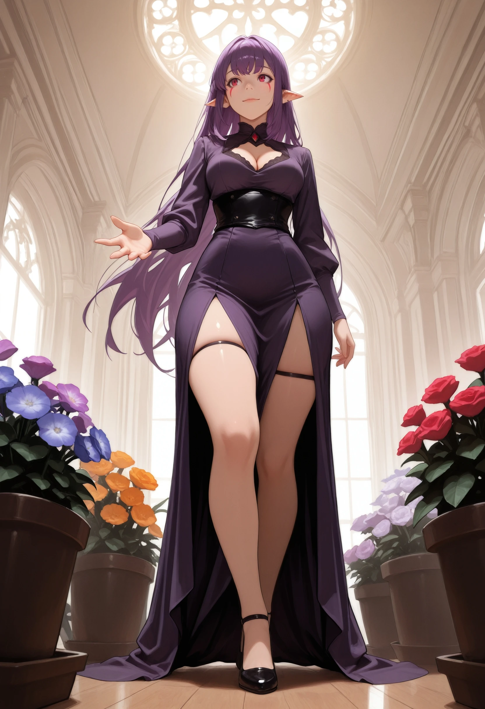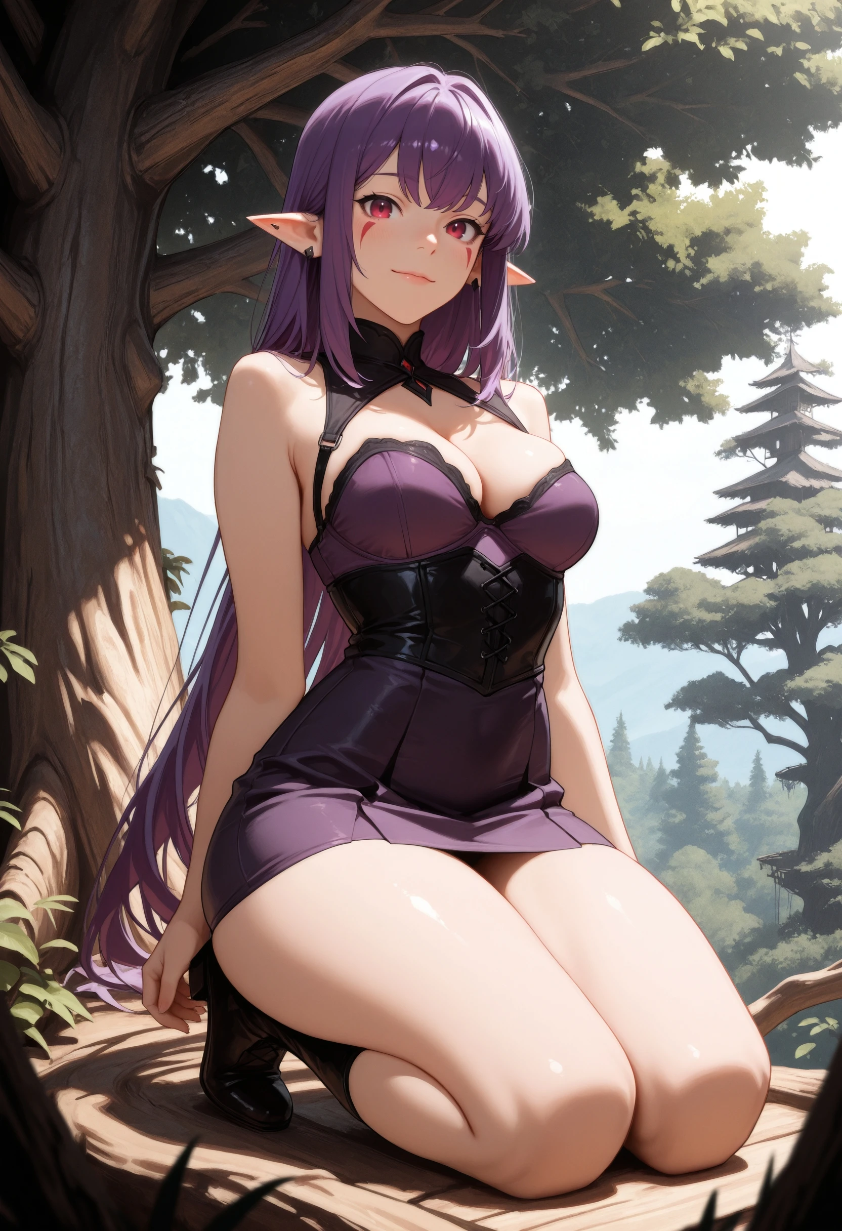 (Positive Prompts) esil radiru, pointy ears, red eyes, red mark, very long hair, sidelocks, purple hair, black eyeliner,