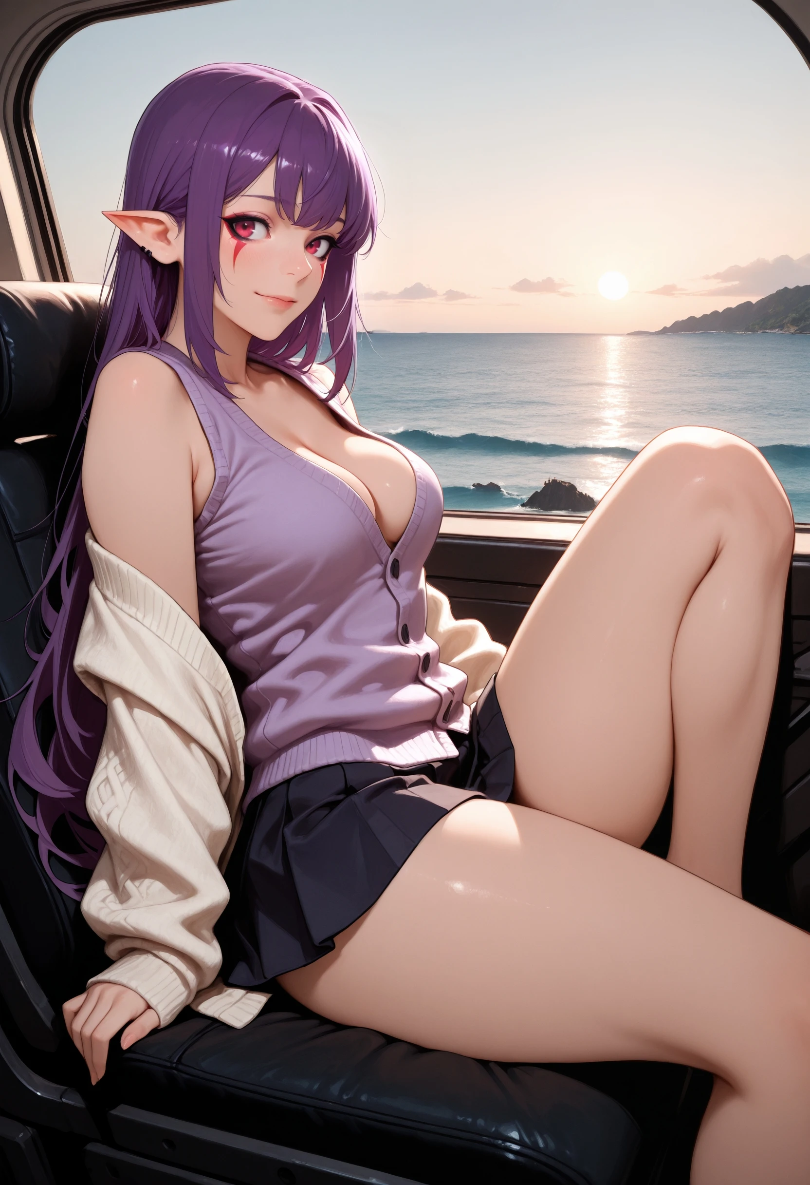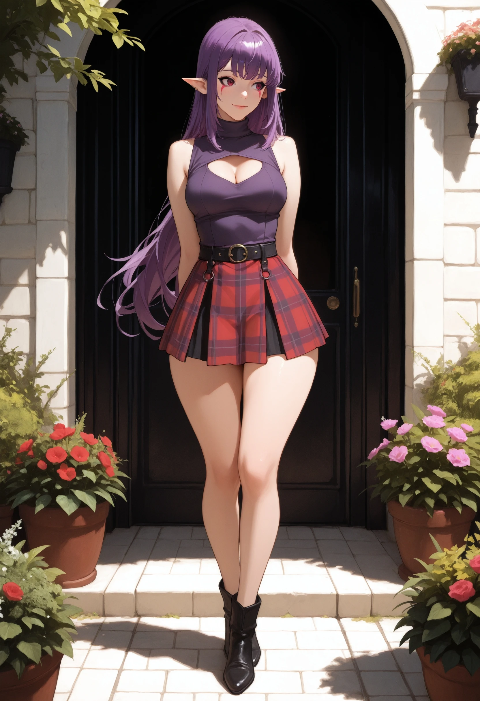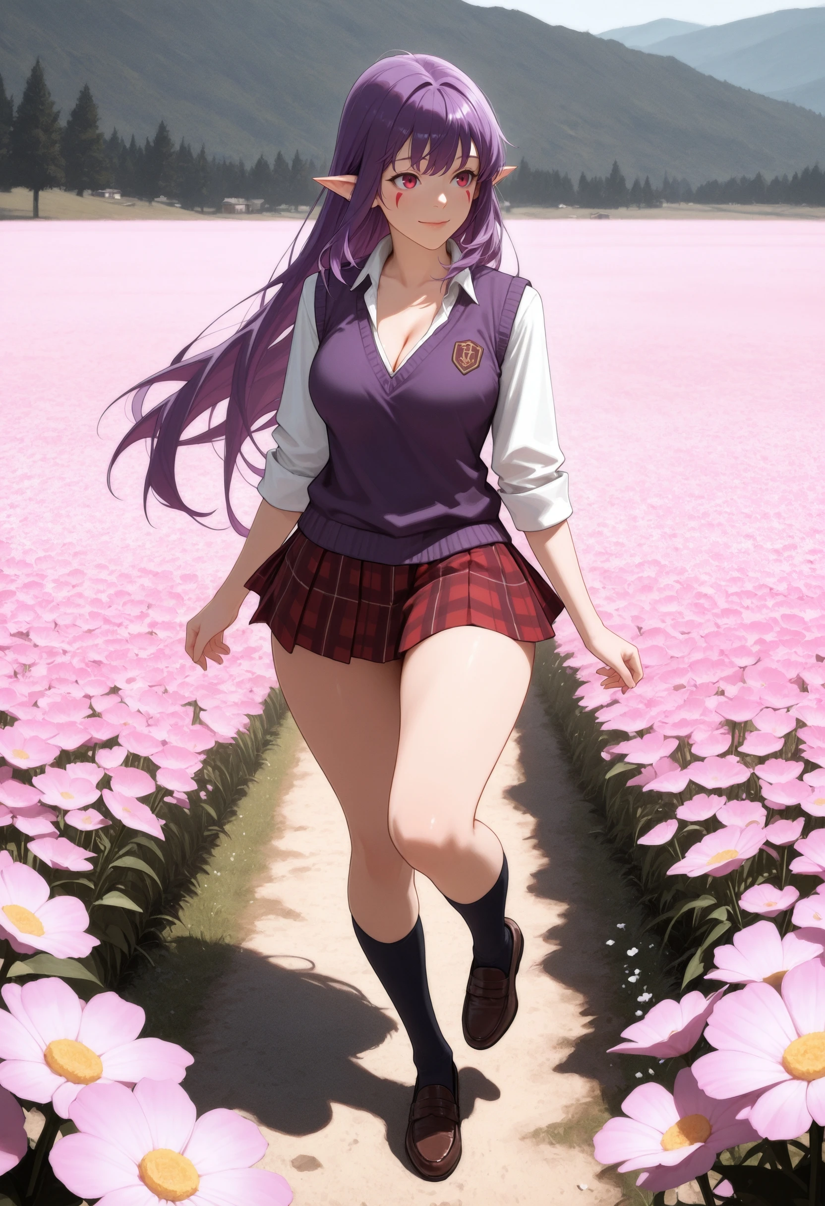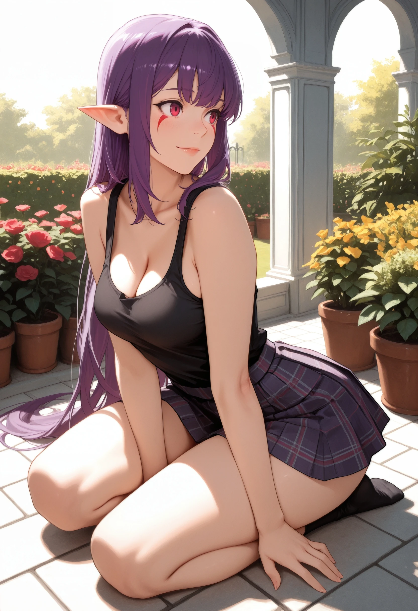 (Positive Prompts) esil radiru, pointy ears, red eyes, red mark, very long hair, sidelocks, purple hair, black eyeliner,