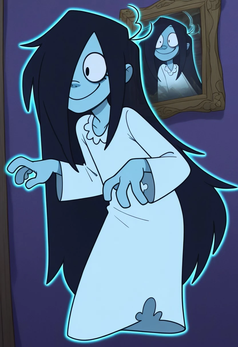 Prompt: Emilia V, solo, 1girl, ghost, blue skin, blue outline, see-through body, intangible, black eyes, bags under eyes, blue hair, long fringe hair, hair over one eye, white dress, no legs, floating,