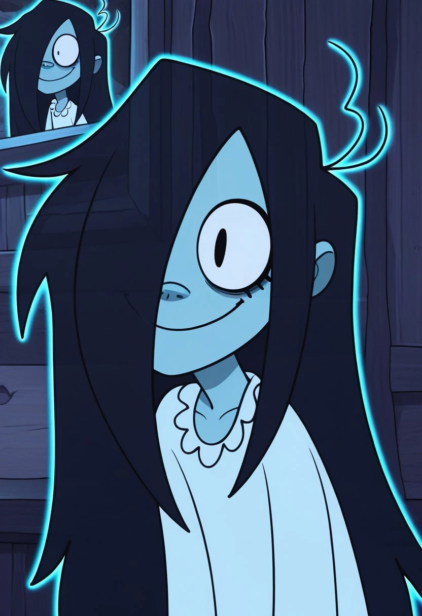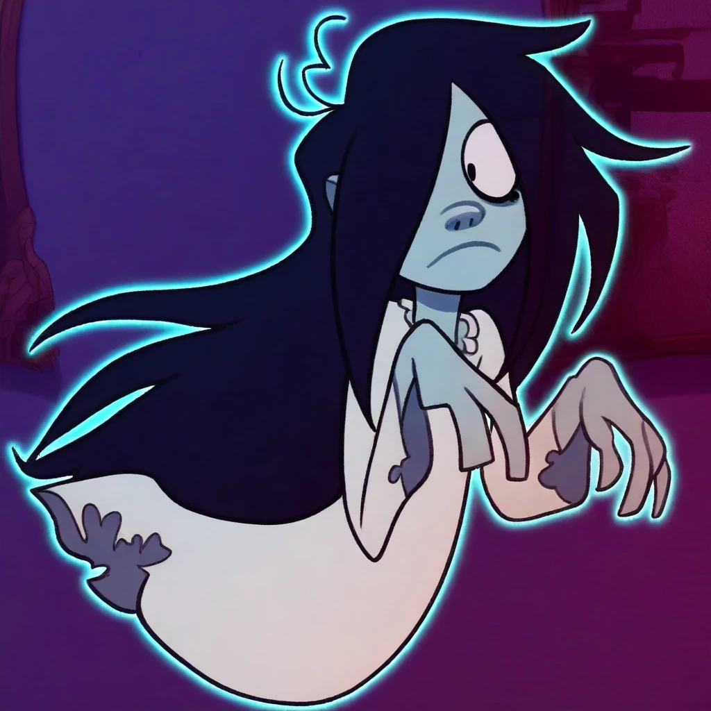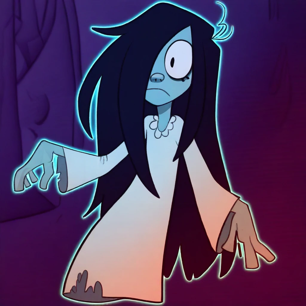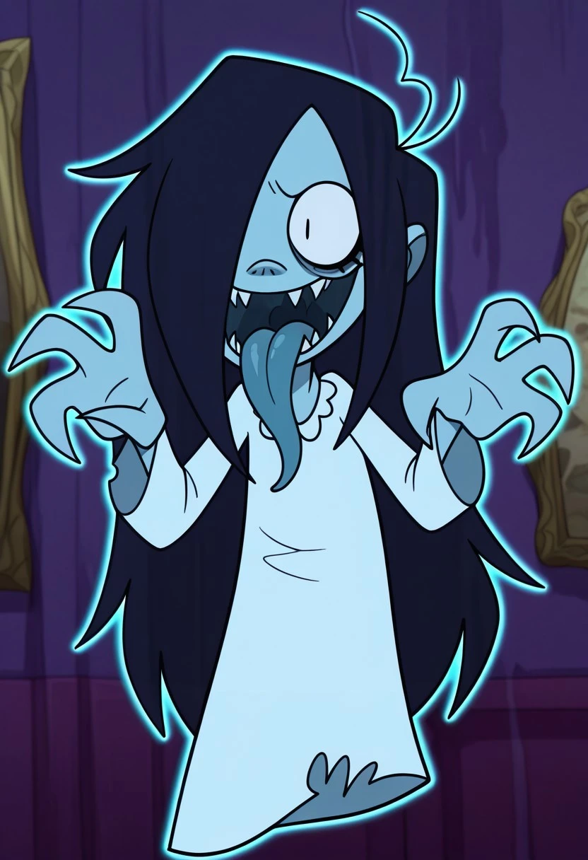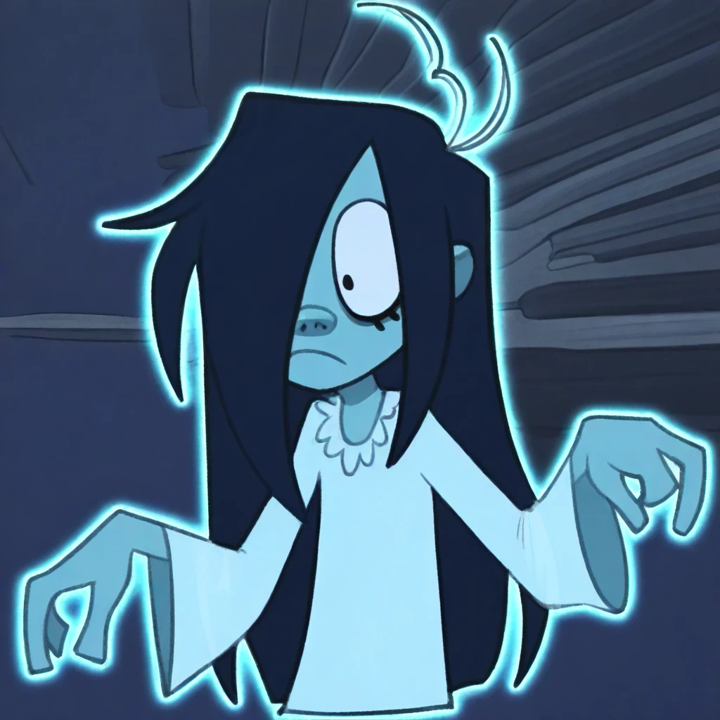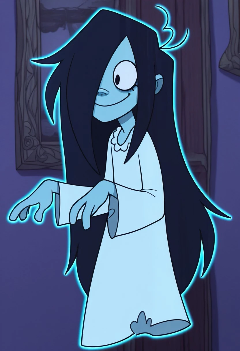 Emilia from the CN show Villainous. She is the leader of a group of ghost children that protect their home, a haunted house.