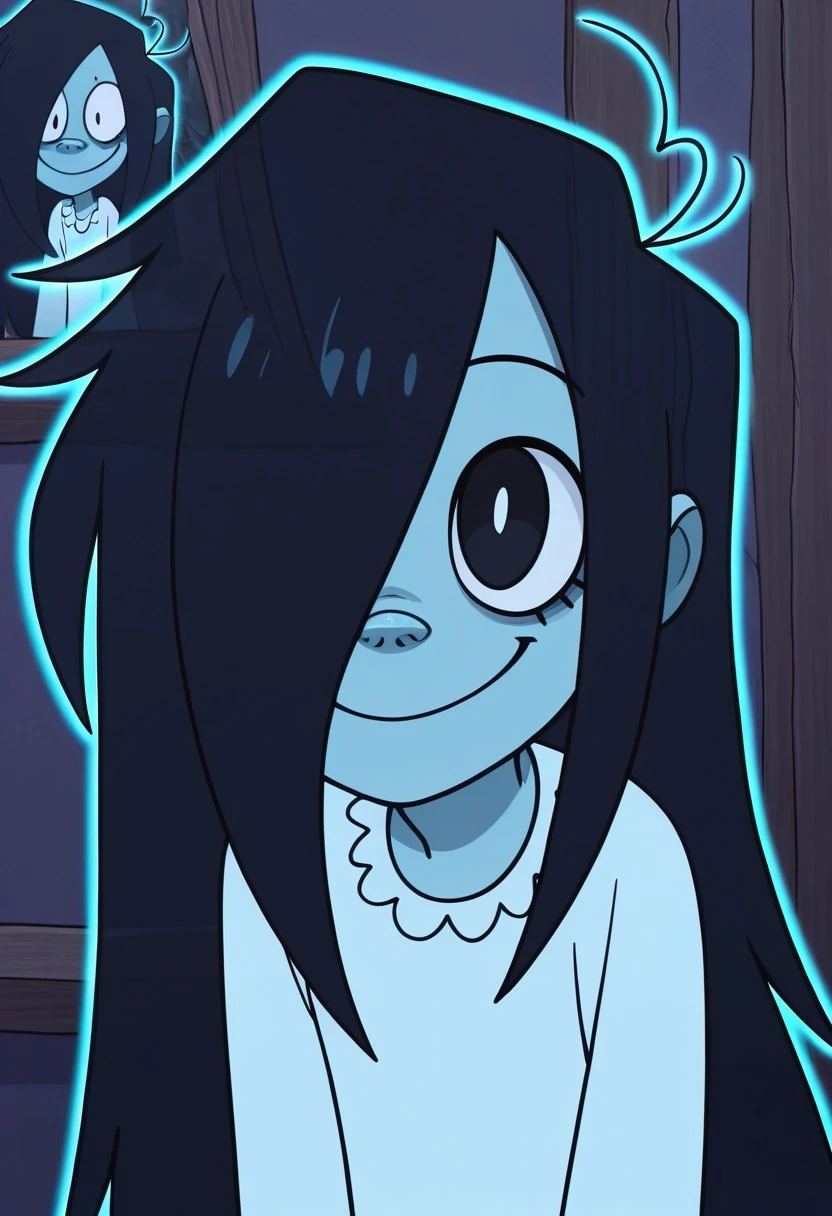 Emilia V, solo, 1girl, ghost, blue skin, blue outline, see-through body, intangible, black eyes, bags under eyes, blue hair, long fringe hair, hair over one eye