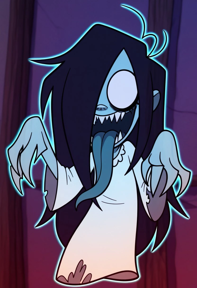 Emilia V, solo, 1girl, ghost, blue skin, blue outline, see-through body, intangible, bags under eyes, blue hair, long fringe hair, hair over one eye, no legs, floating, monster look, scary face, long tongue, blue tongue, no pupils, white sclera, sharp fingers