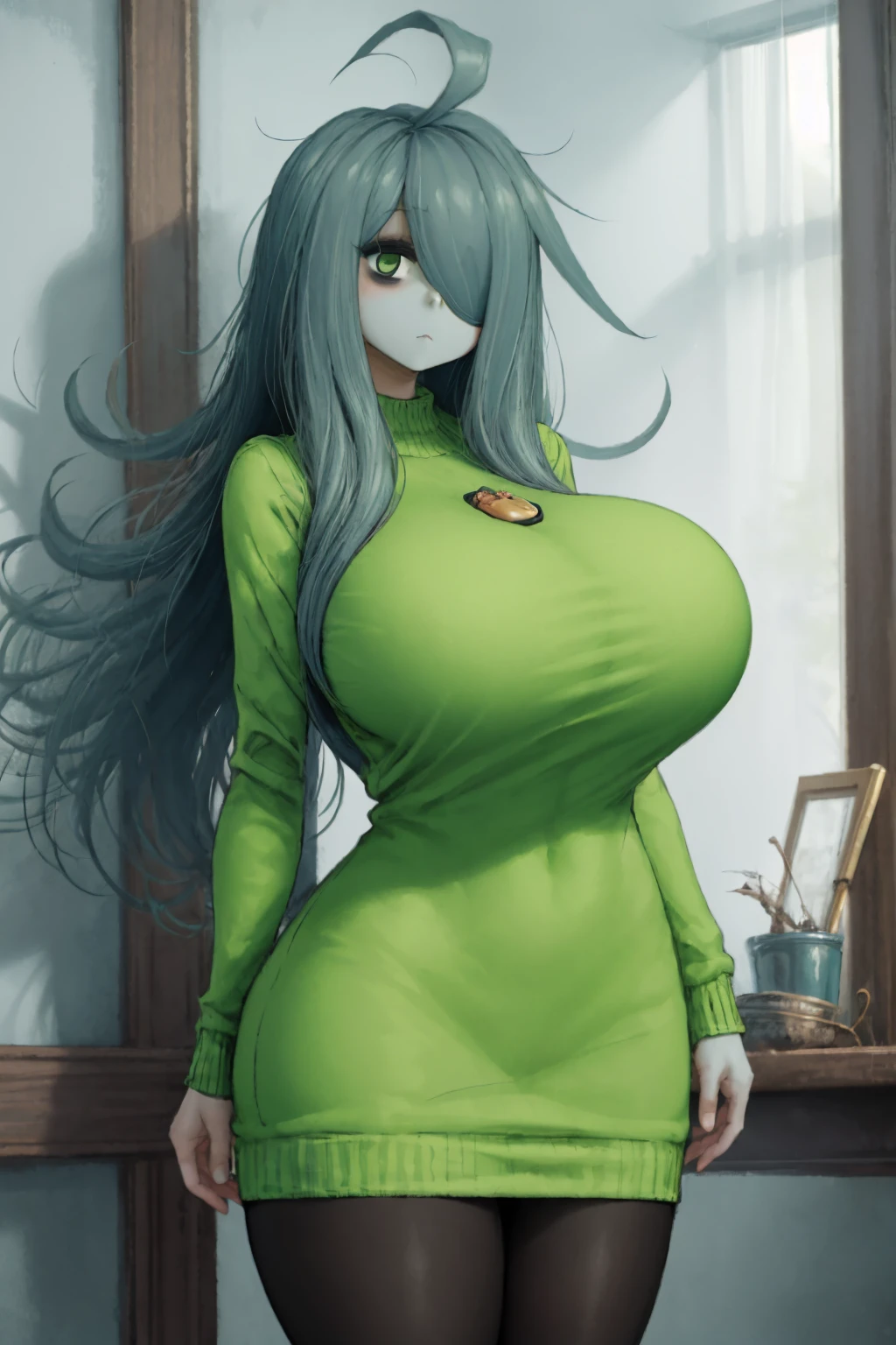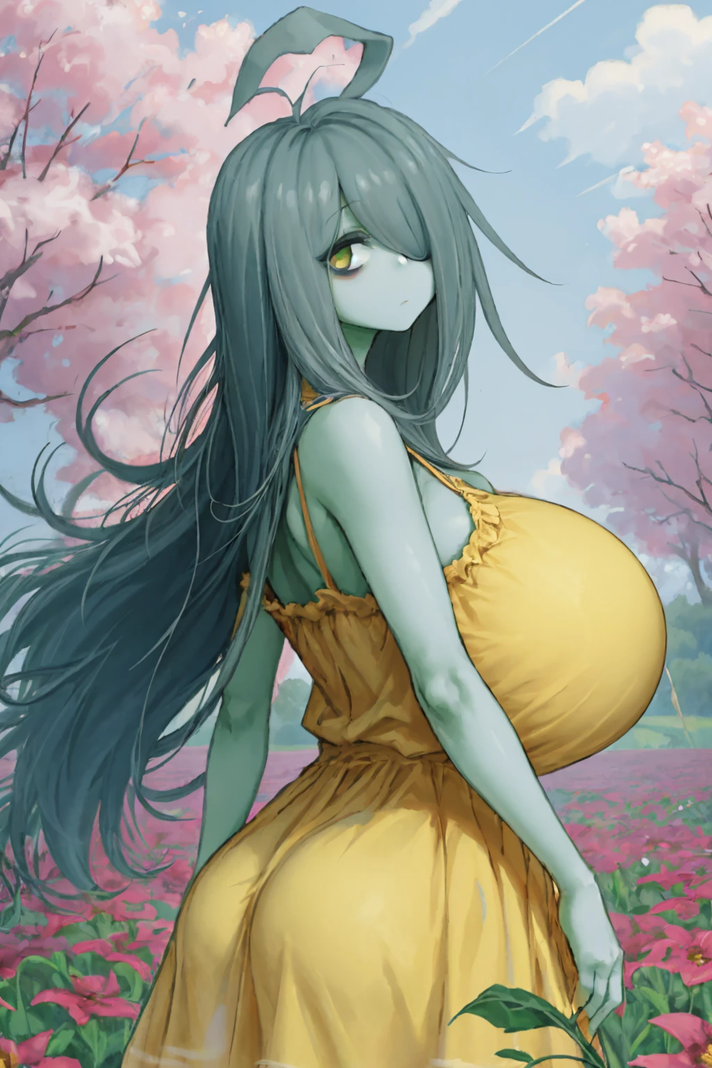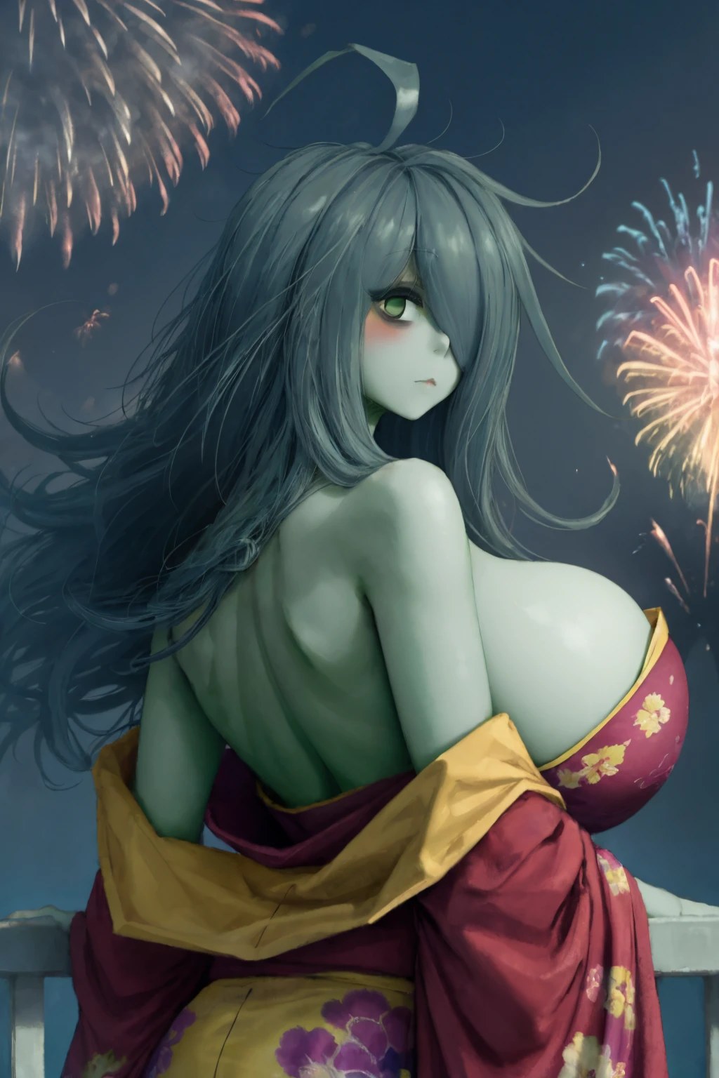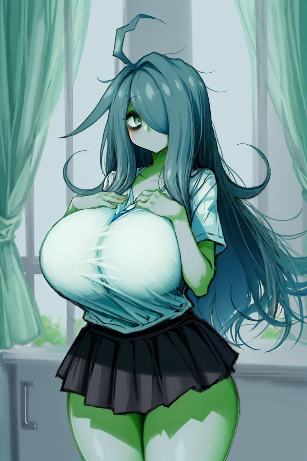 Trigger + Appearance: 2b-gemei, green skin, ahoge, hair over one eye, huge breasts