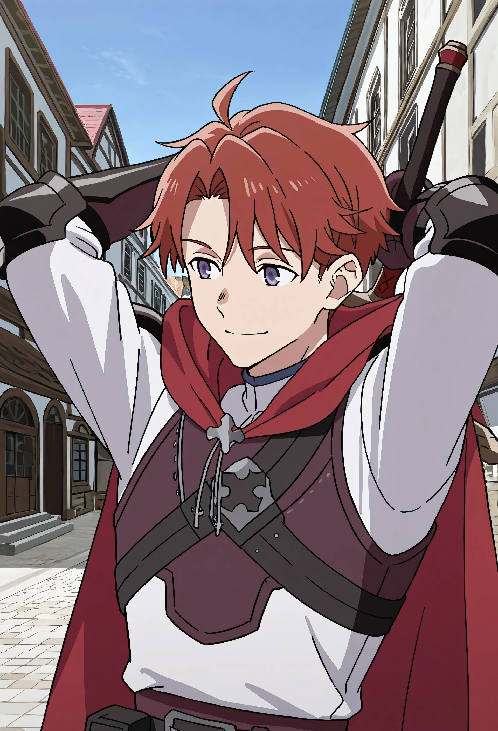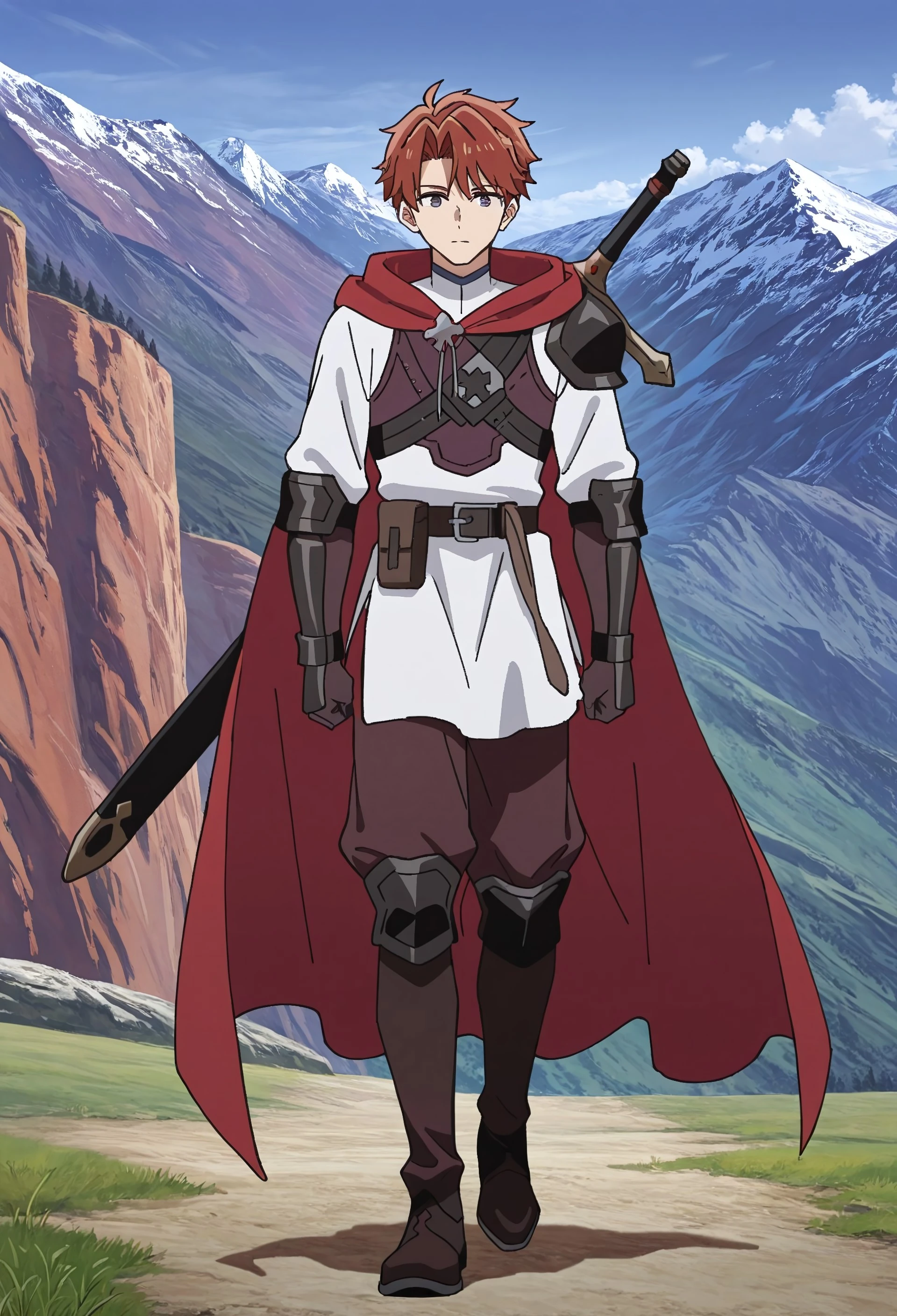 Abel_WM, Red hair, Brown Eyes, Red Cape, White Shirt, Leather Cuirass, Leather gauntlets, brown pants, leather boots, sword on back