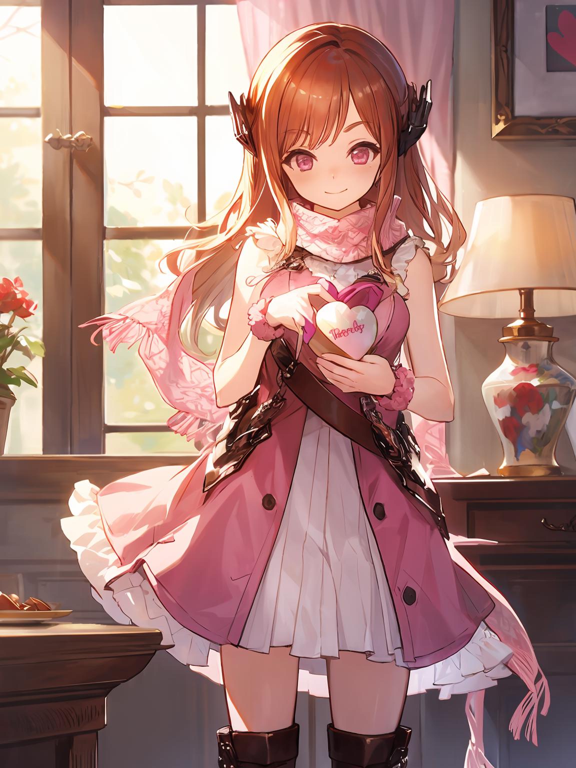 • Lucille:Brown hair,pink eyes,long hair,hair ornament,bare shoulders,wristband,feathers,pink dress,scarf,(turtleneck),high boots