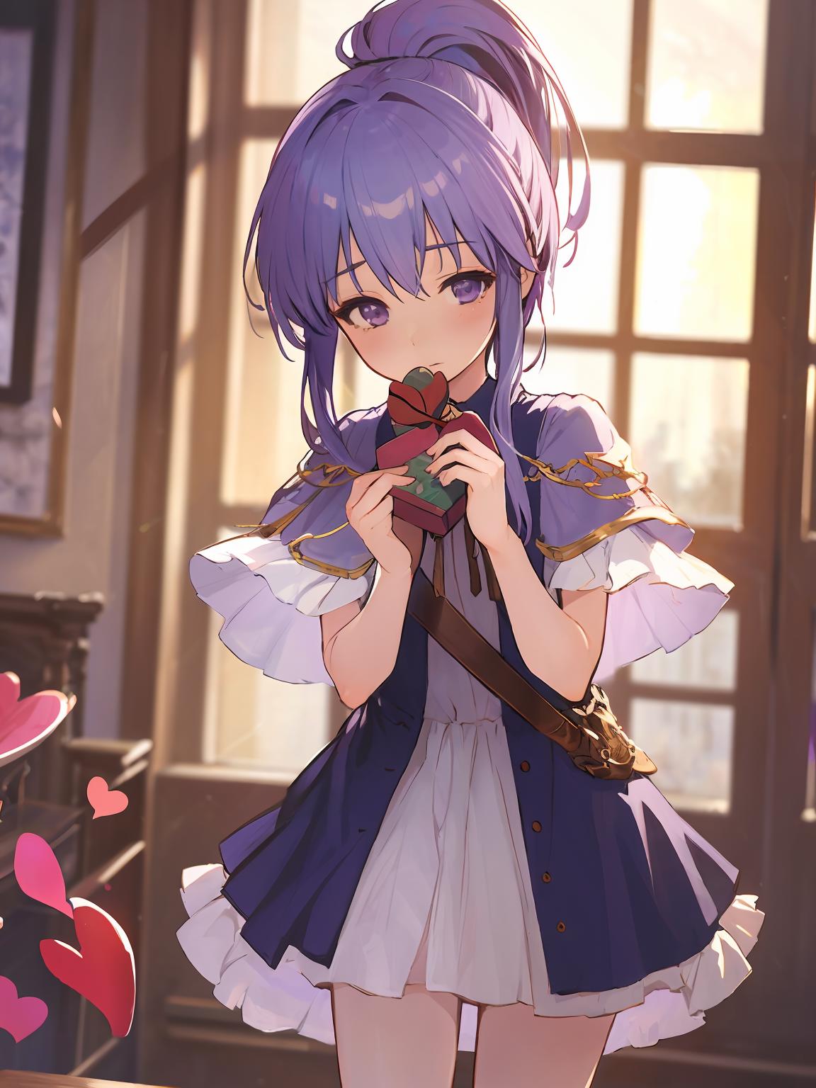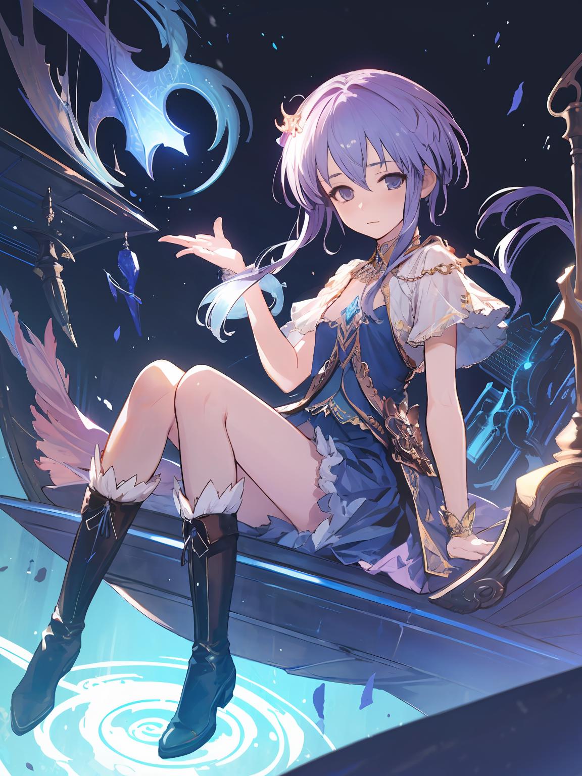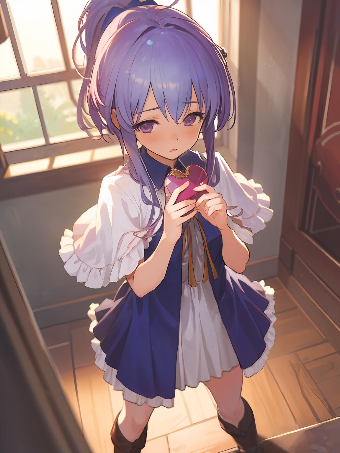 • Spinaria:Puprle hair,blue eyes,short hair,(ponytail),hair ornament,capelet,blue dress,frills,boots