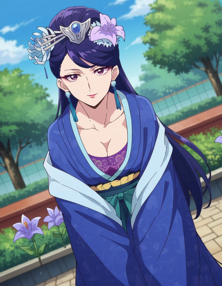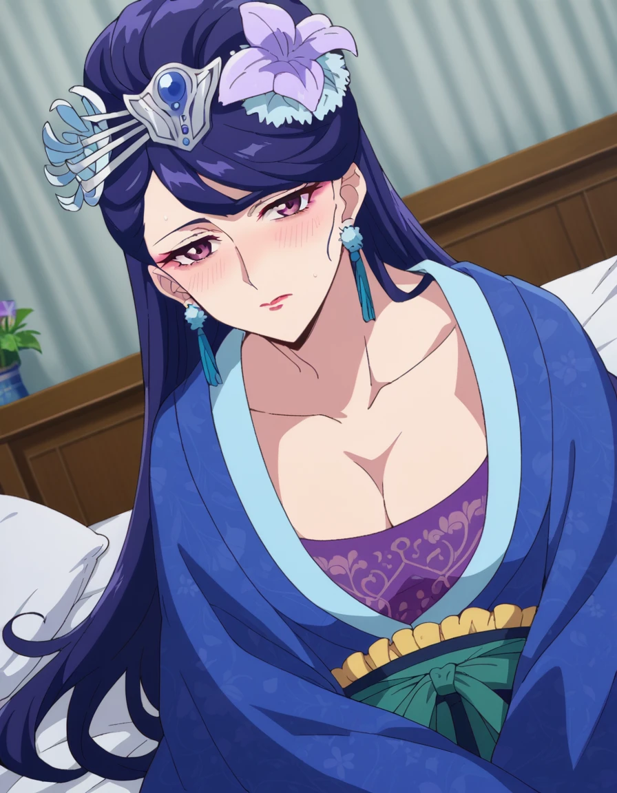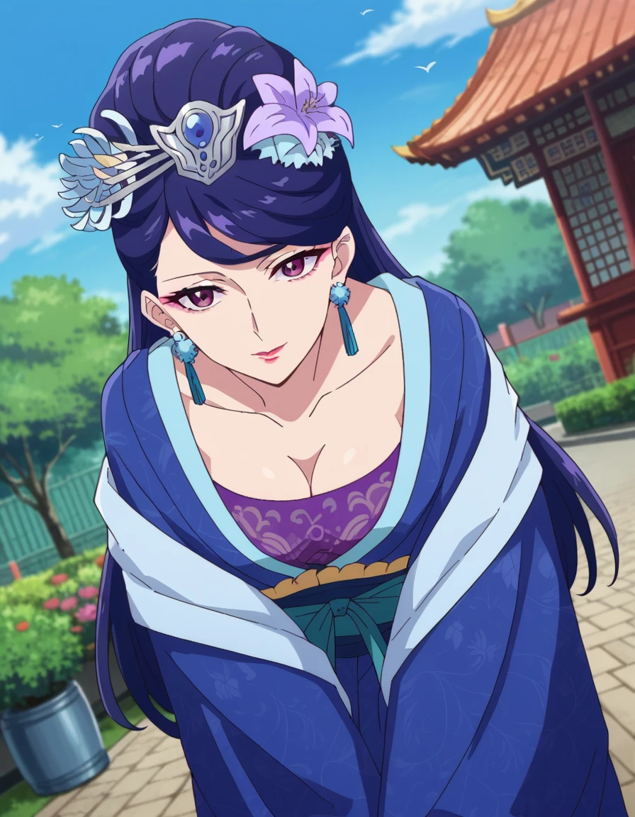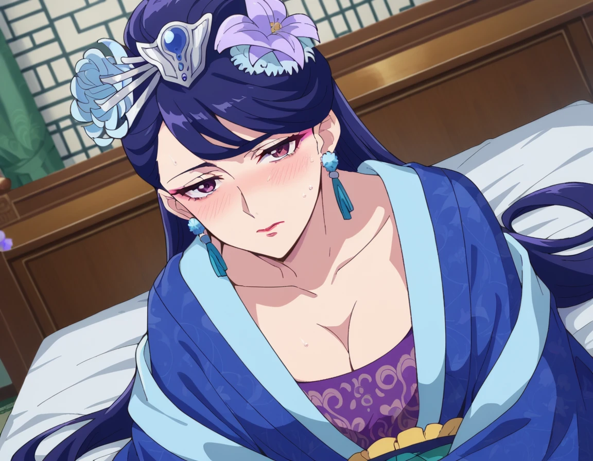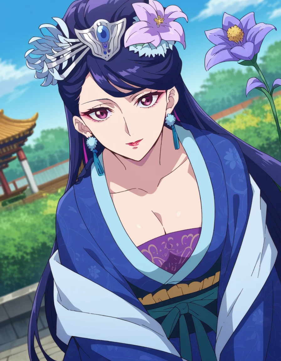 lihua, long hair, purple eyes, purple hair, flower, earrings, hair flower, makeup, lipstick,