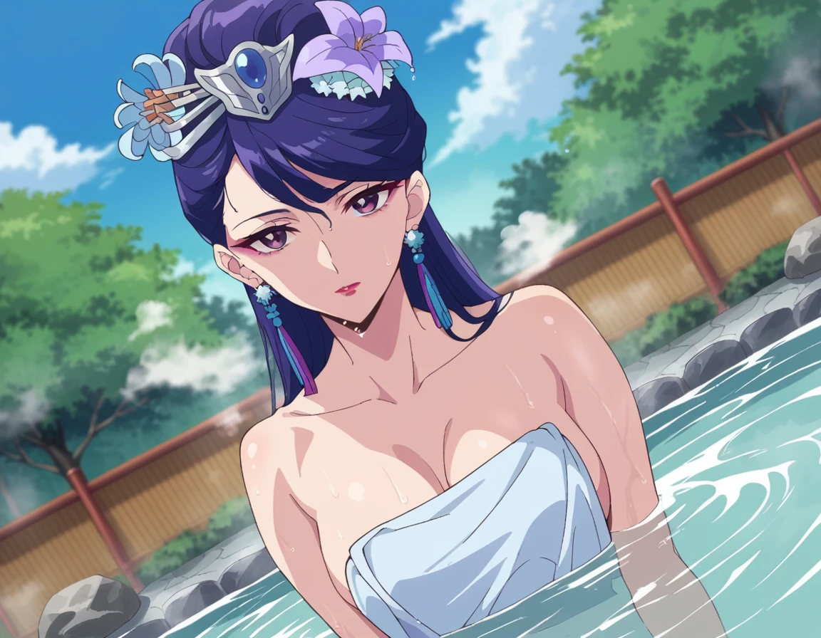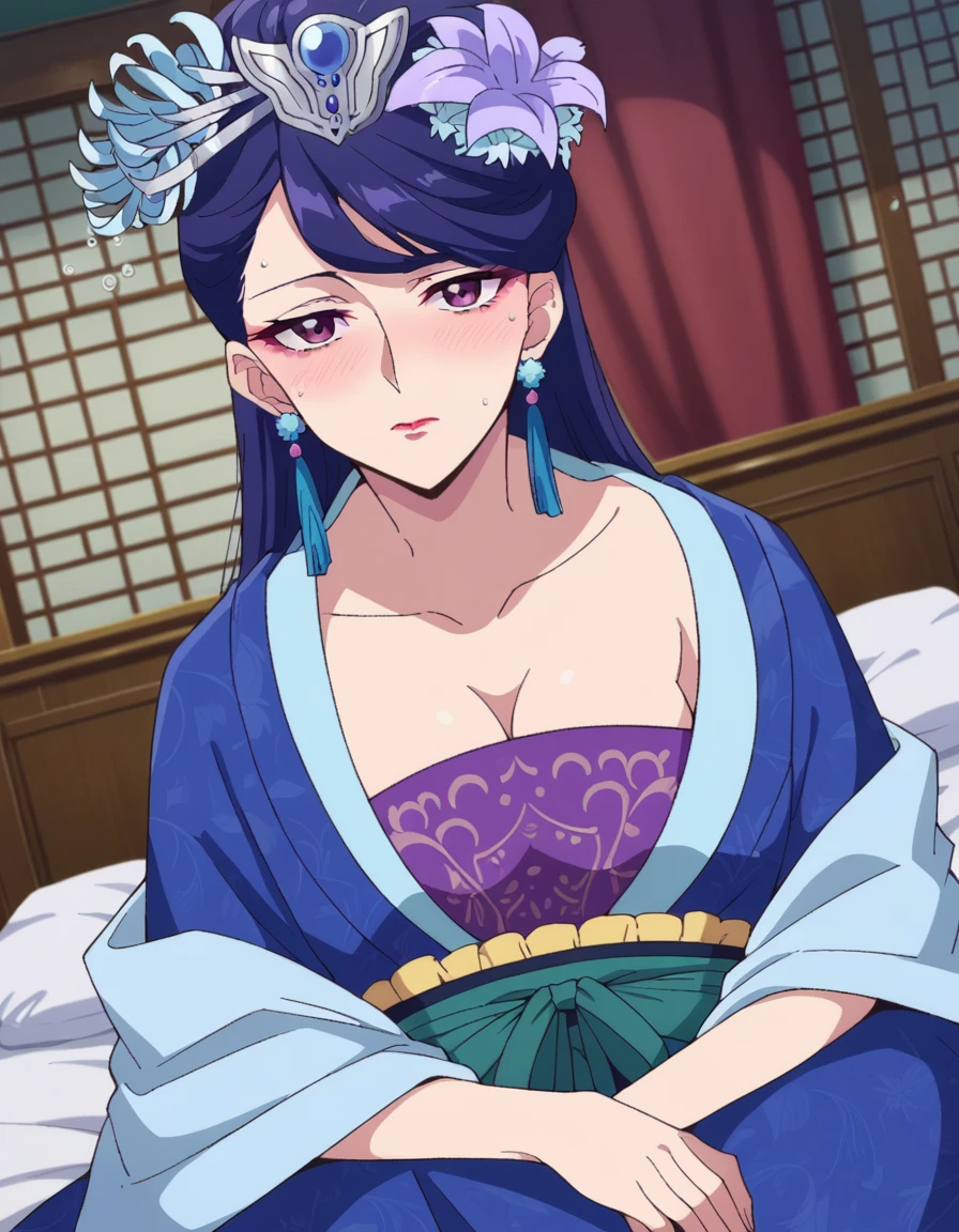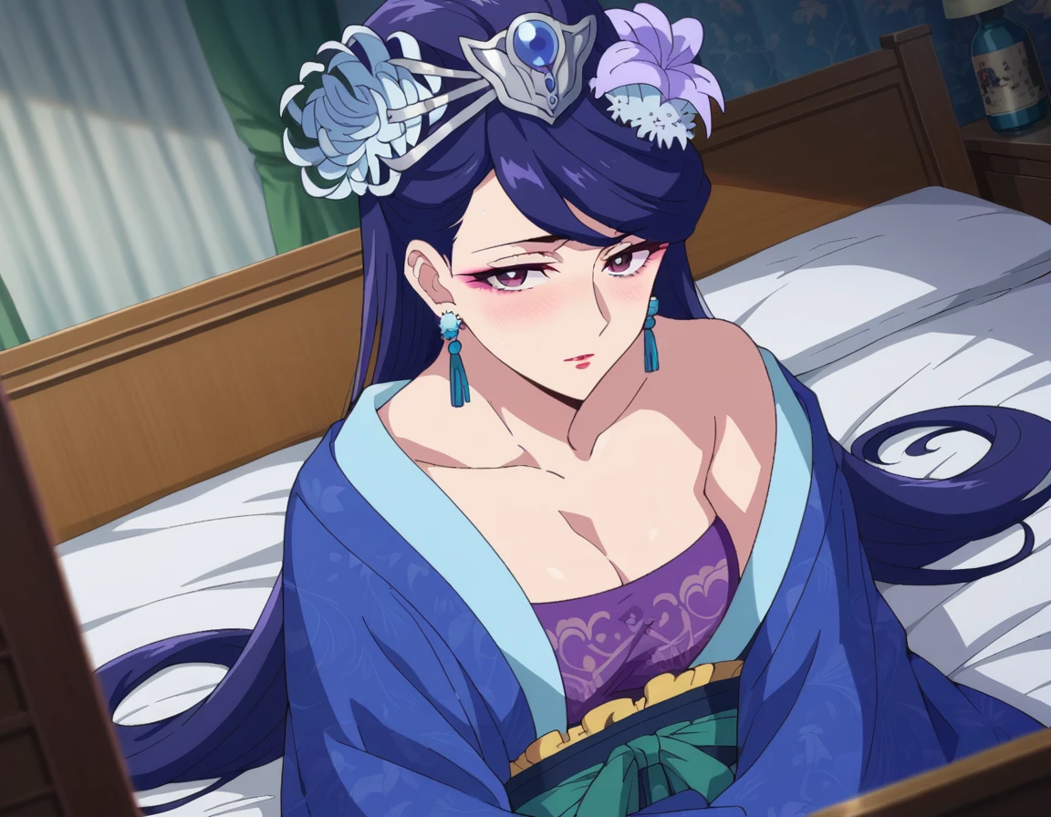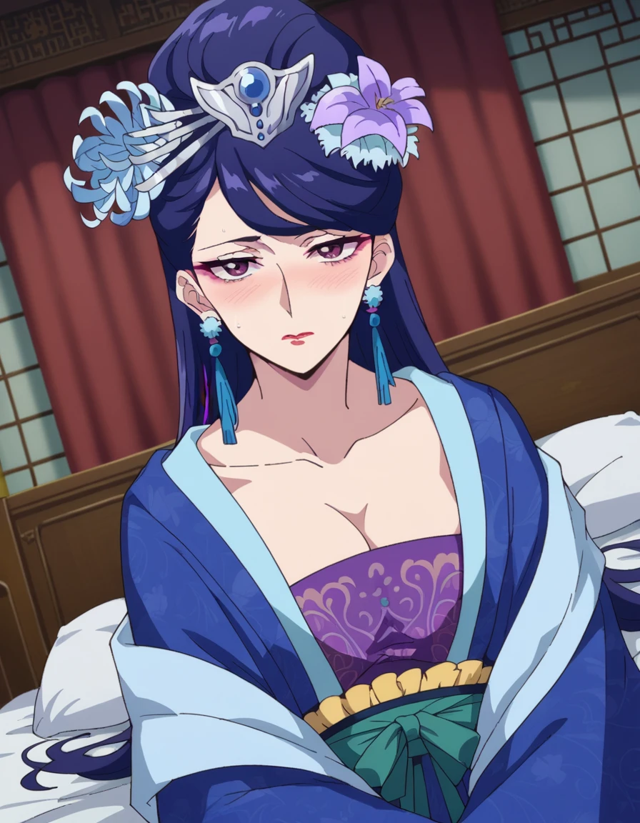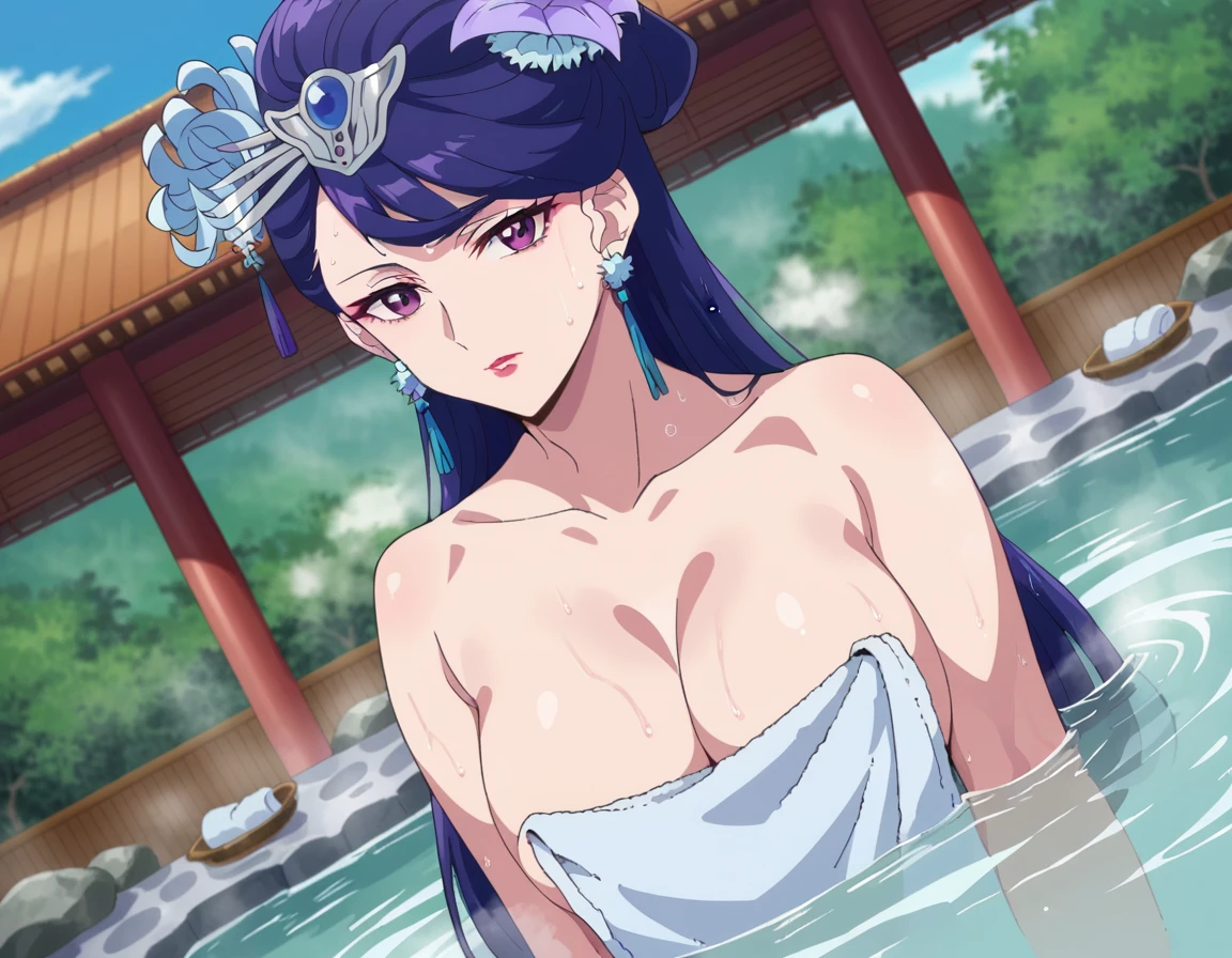 lihua, long hair, purple eyes, purple hair, flower, earrings, hair flower, makeup, lipstick,