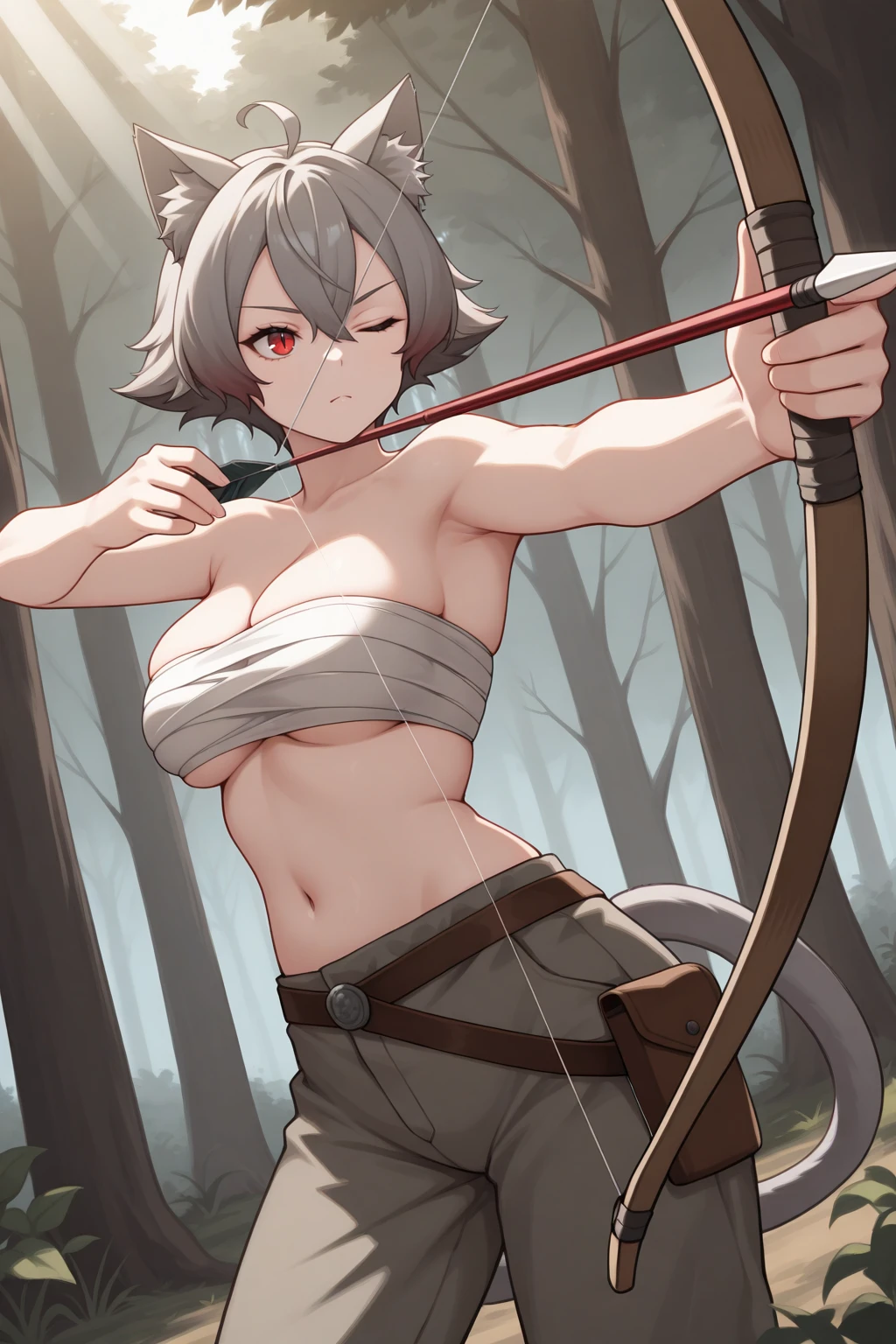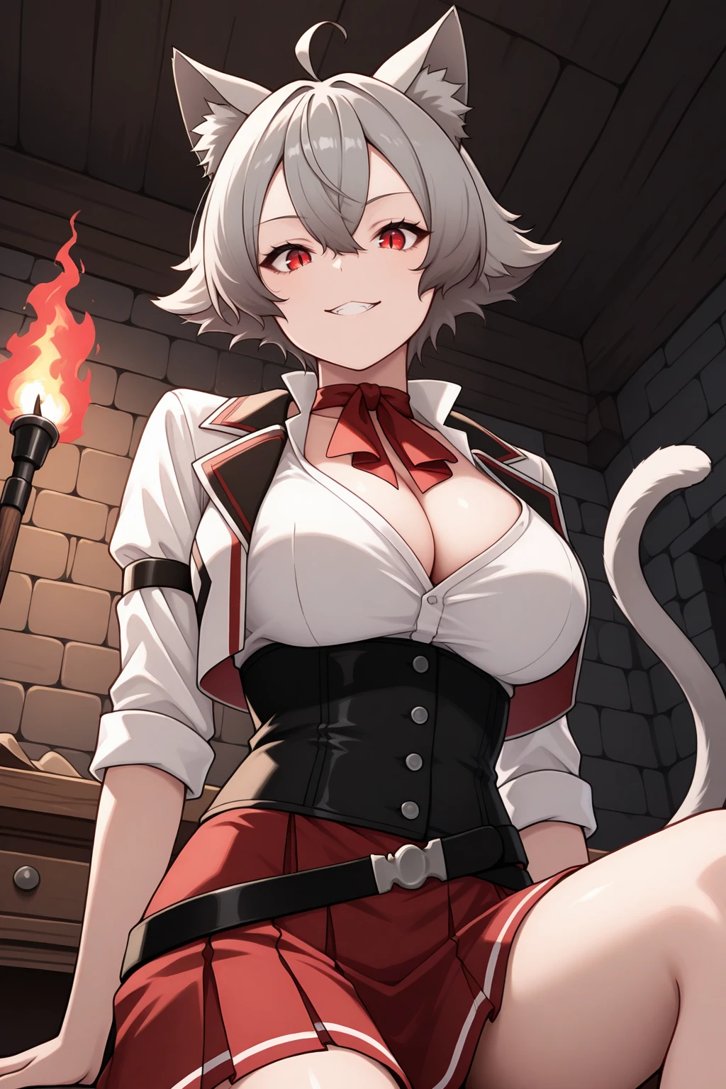 l1n1a, large breasts, cat ears, animal ear fluff, cat tail, red eyes, slit pupils, short hair, grey hair, hair between eyes, ahoge