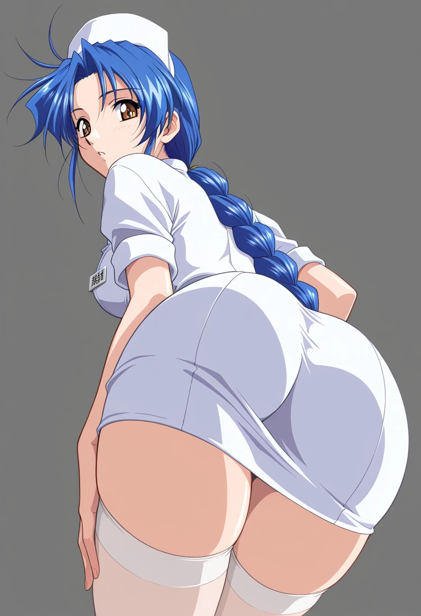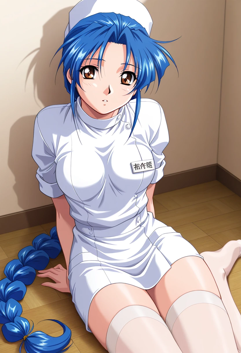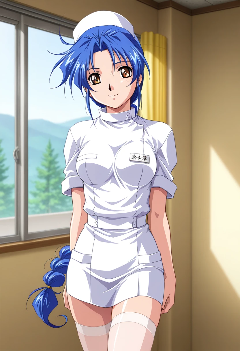 nurse, nurse cap, white short dress, name tag, short sleeves, white thighhighs,