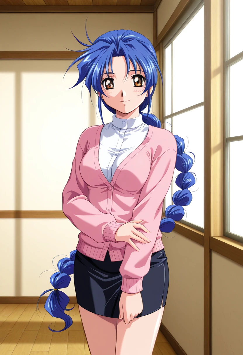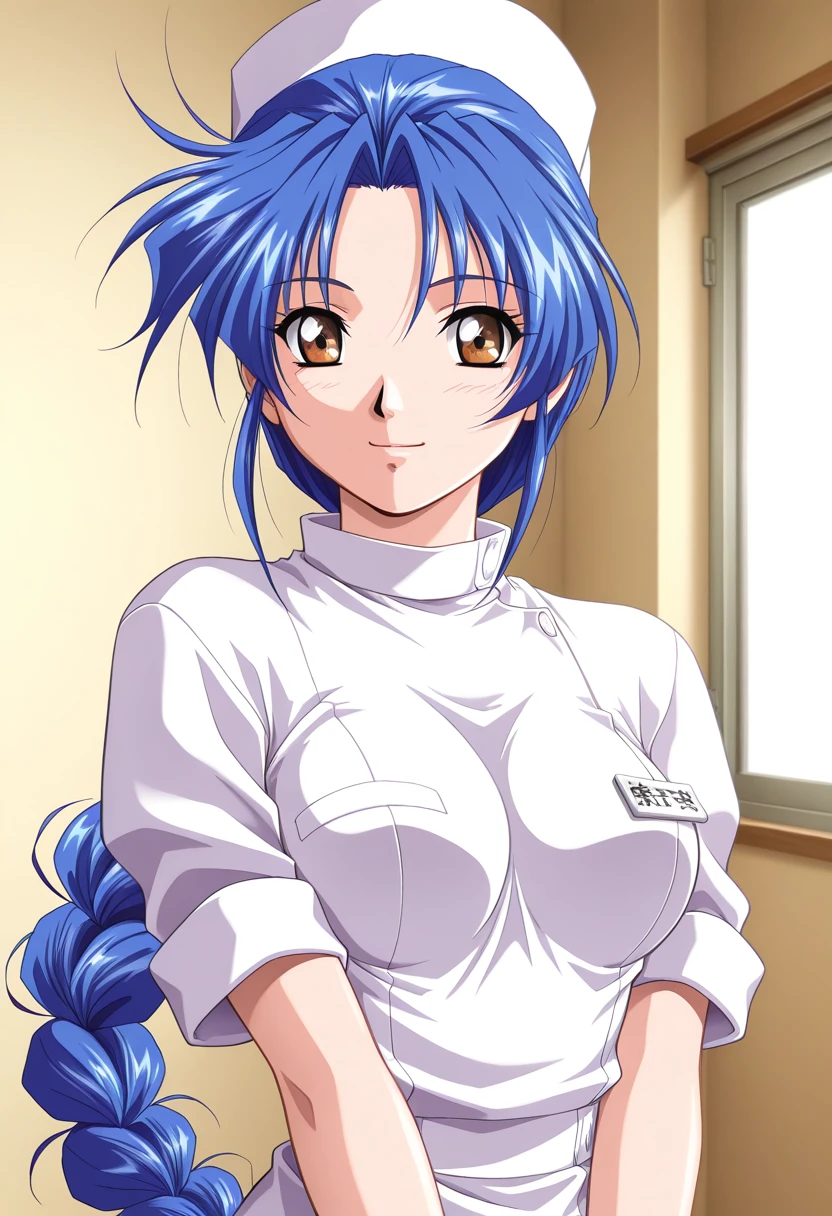 hirokoww, brown eyes, blue hair, long hair, very long hair, parted bangs, single braid, medium breasts,
