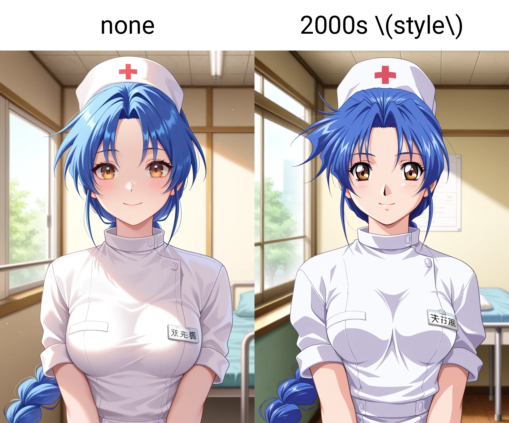 プロンプトに "2000s (style)" を使った方が、ゲームの雰囲気に近くなります。