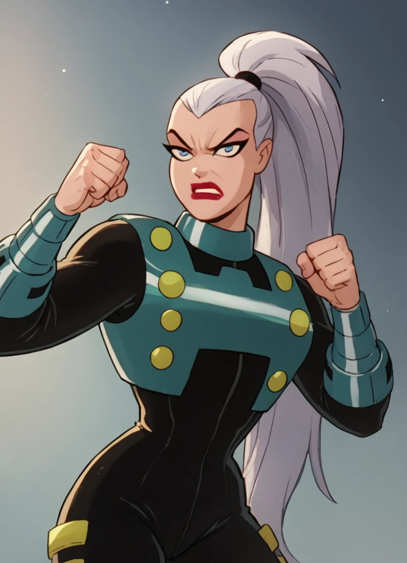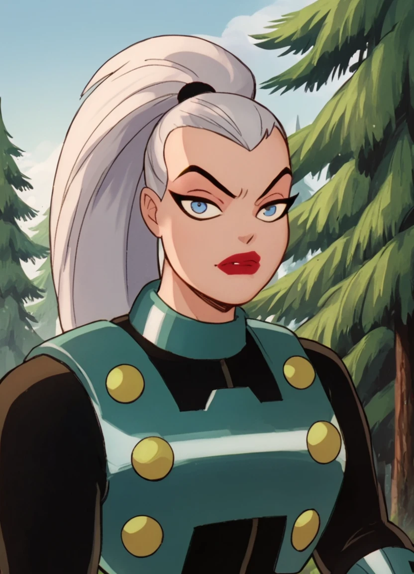 mala, ponytail, 1girl, breastplate, solo, black bodysuit, white hair, lipstick, blue eyes, bracer