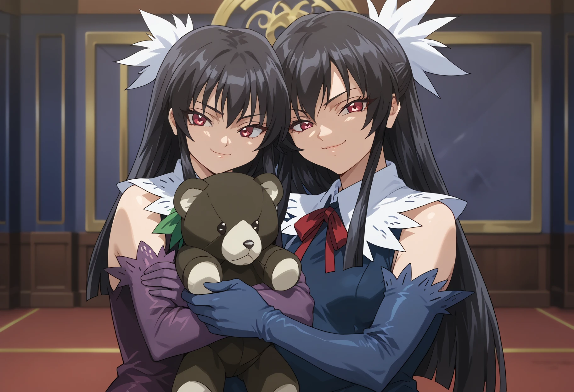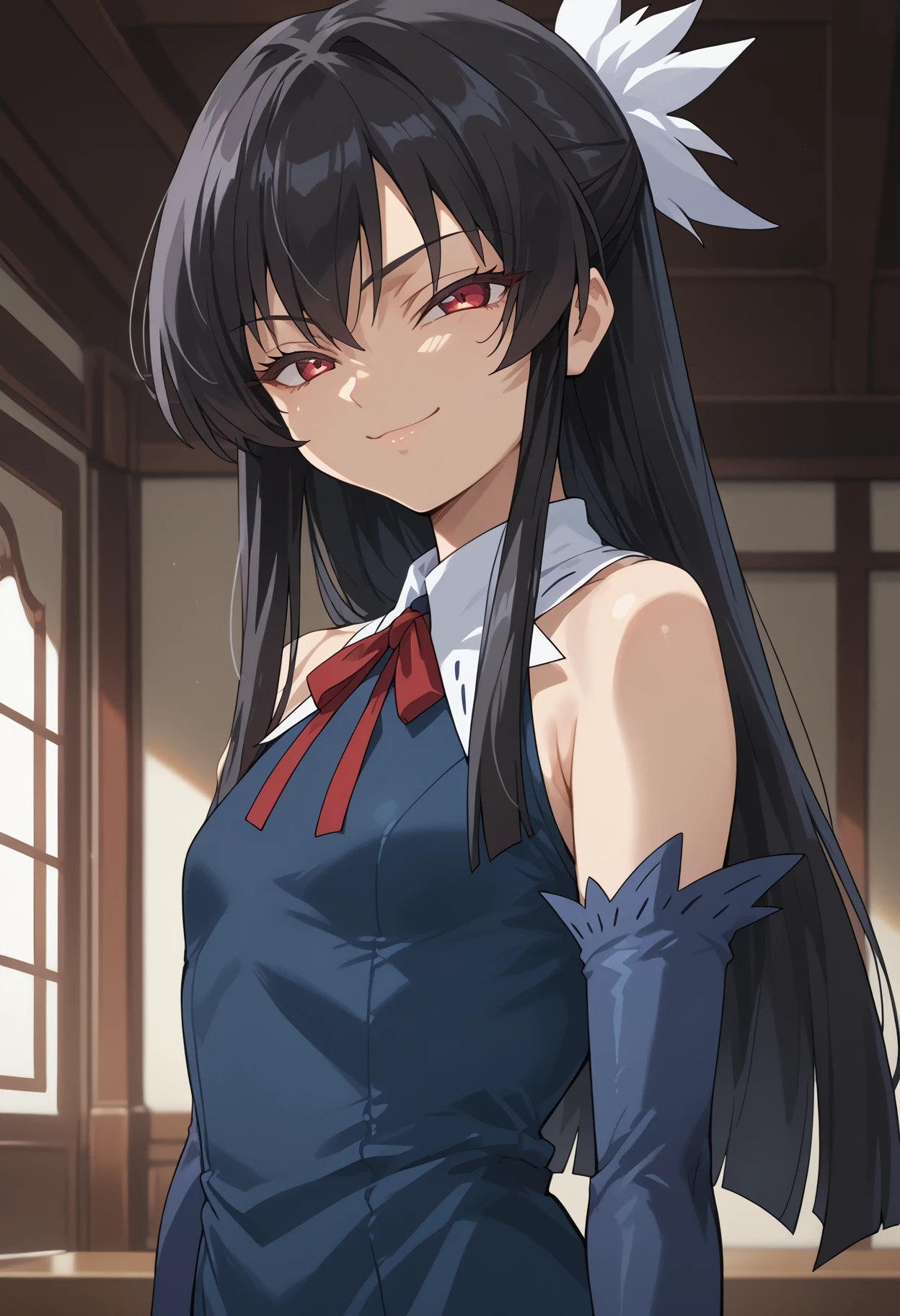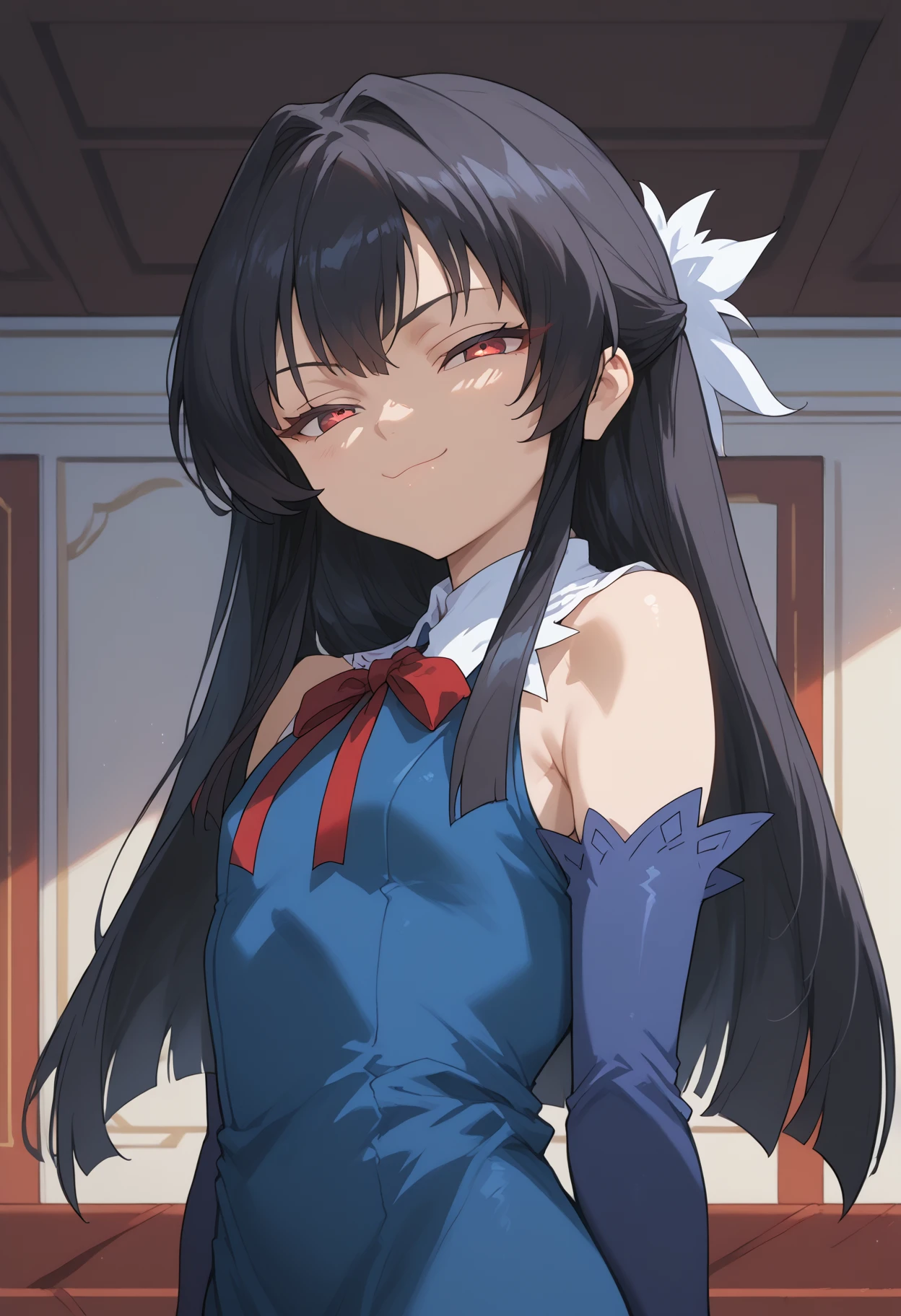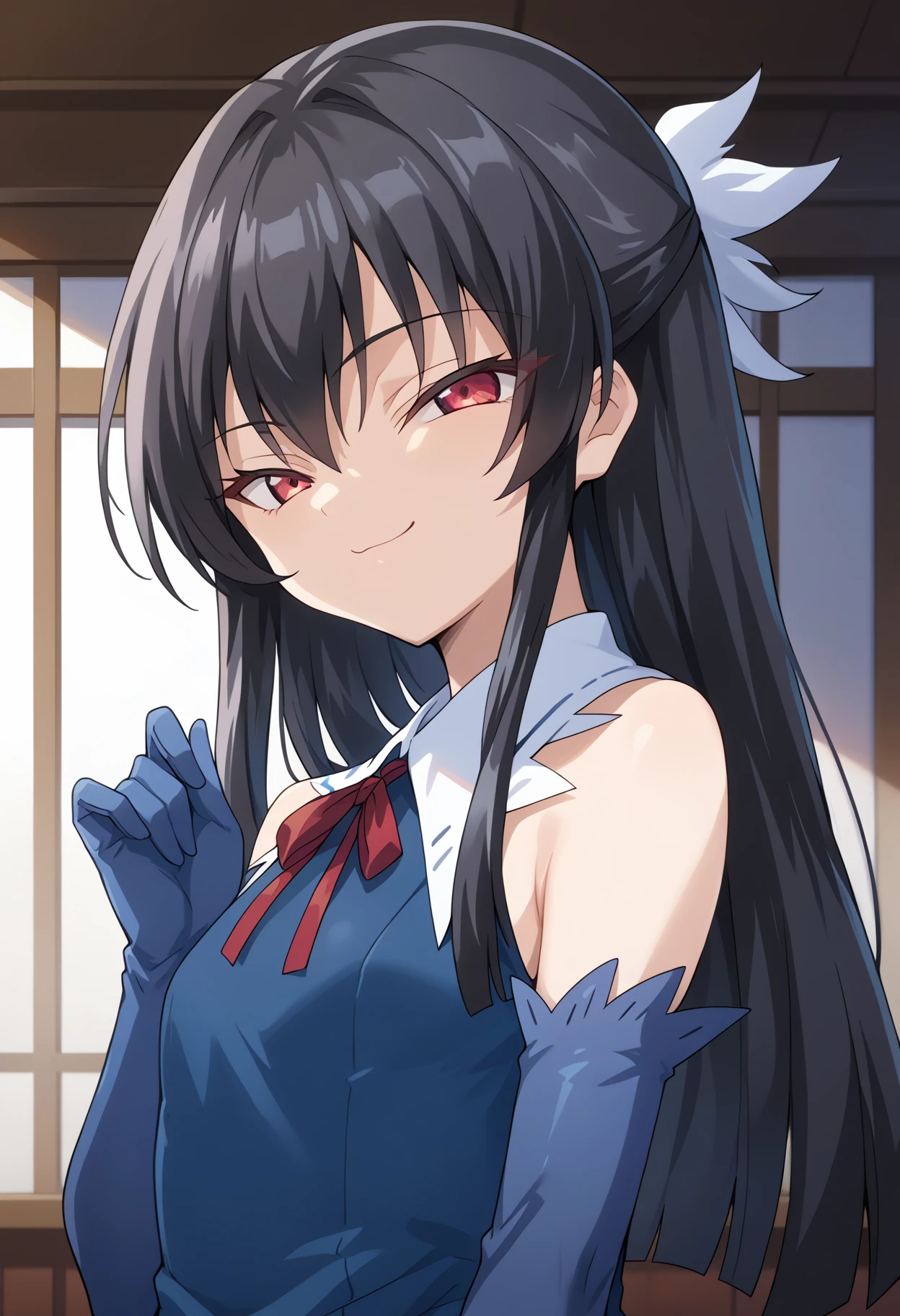 Karin: vongielentwin, black hair, long hair, blue clothes, red ribbon, bare shoulders, long gloves, red eyes