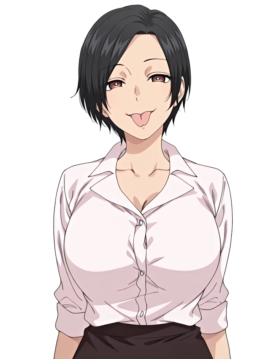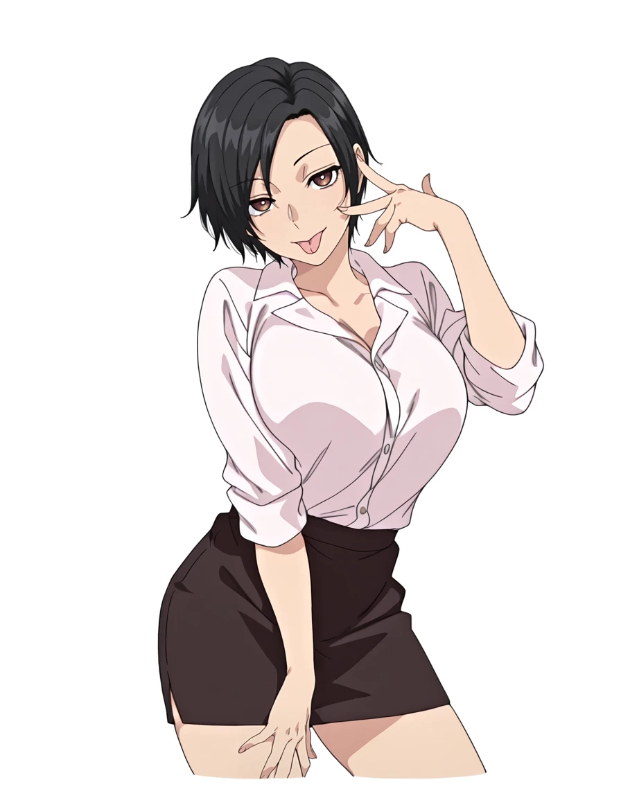 mur4m4t4k43d3, 1girl, short hair, black hair, brown eyes, split tongue, shirt, collared shirt, white shirt, large breasts, shirt tucked in, sleeves rolled up, pencil skirt, black skirt