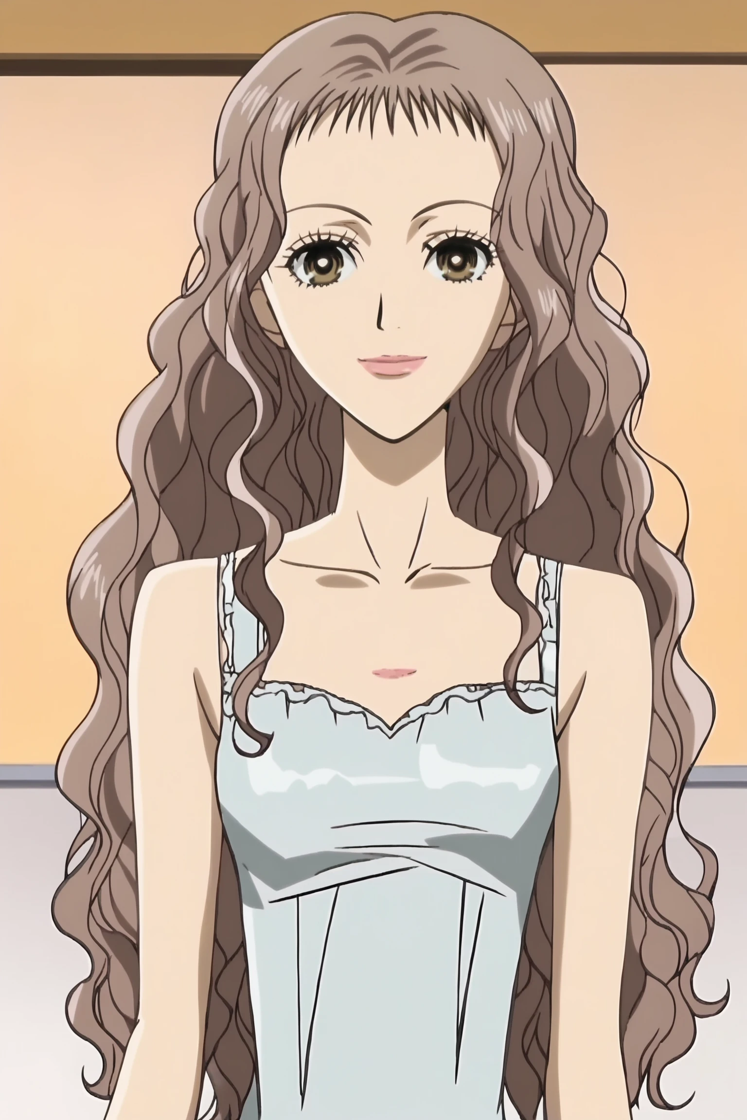 1girl, solo, long hair, wavy hair, brown hair, brown eyes, breasts
