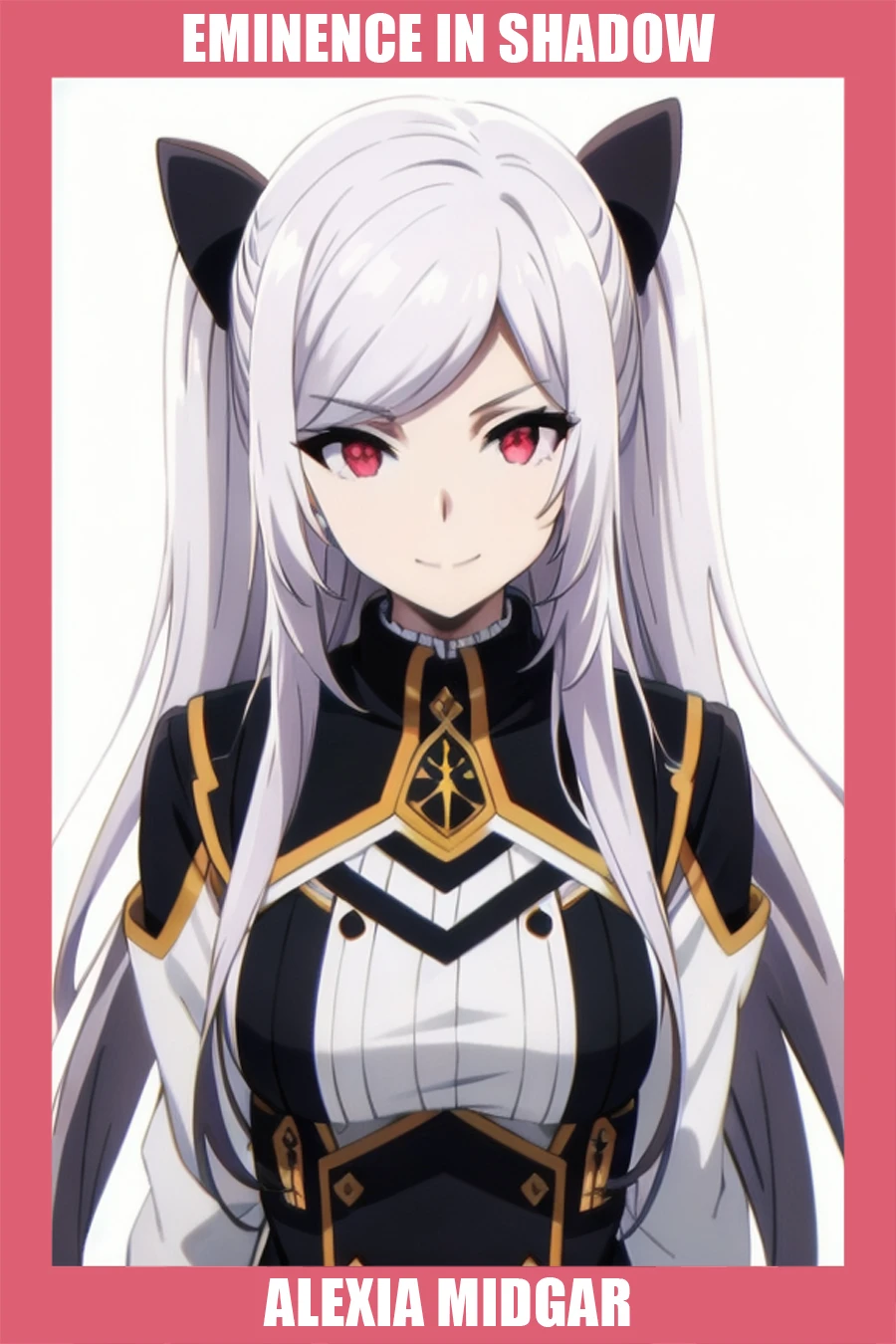 Character: alexia midgar, white hair, swept bangs, red eyes, very long hair, sidelocks, medium breasts, hair ornament, twintails,