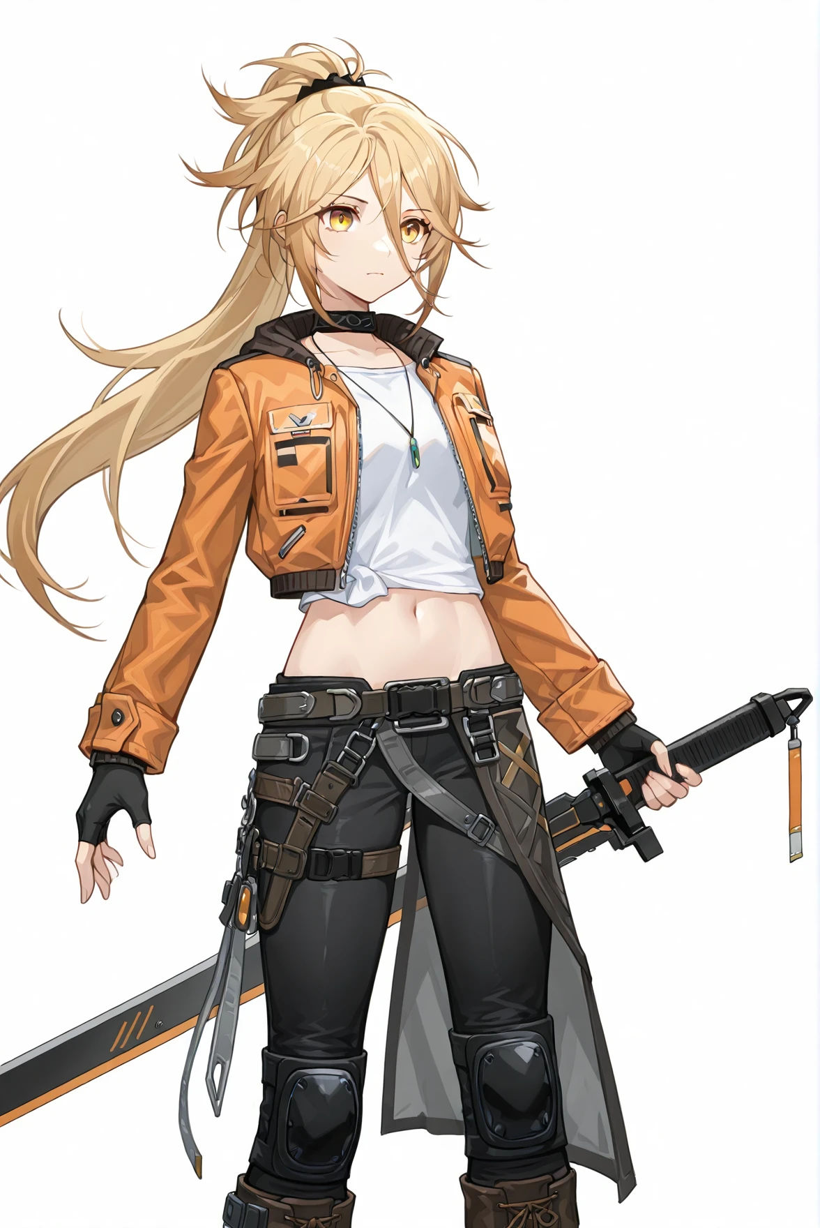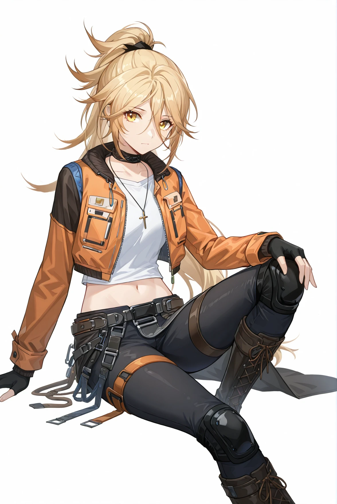 outfit: necklace, choker, white shirt, orange cropped jacket, long sleeves, fingerless gloves, midriff, navel, belt, pants, asymmetrical skirt, waist cape, thigh strap, knee pads, knee boots, cross-laced footwear,