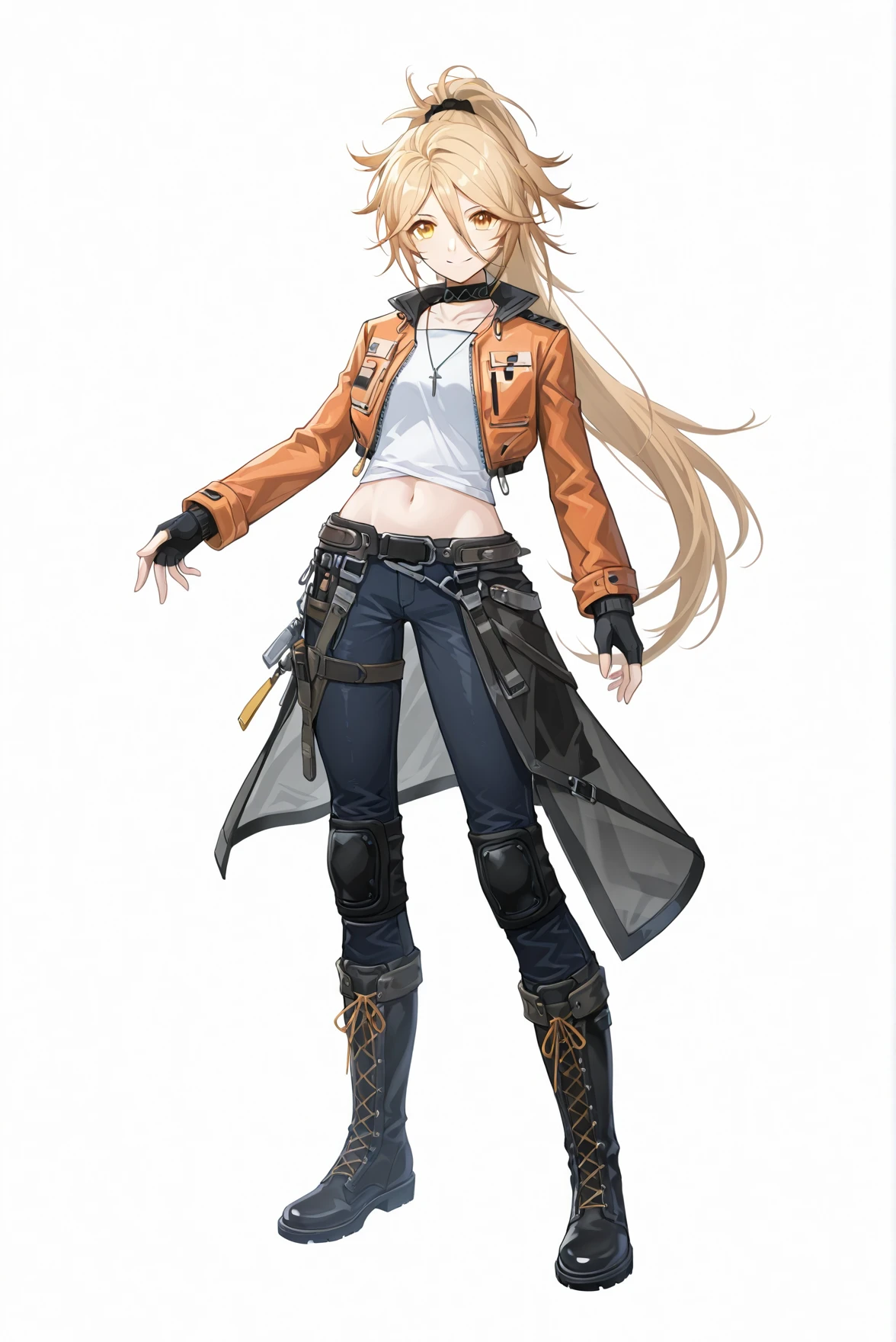 necklace, choker, white shirt, orange cropped jacket, long sleeves, fingerless gloves, midriff, navel, belt, pants, asymmetrical skirt, waist cape, thigh strap, knee pads, knee boots, cross-laced footwear