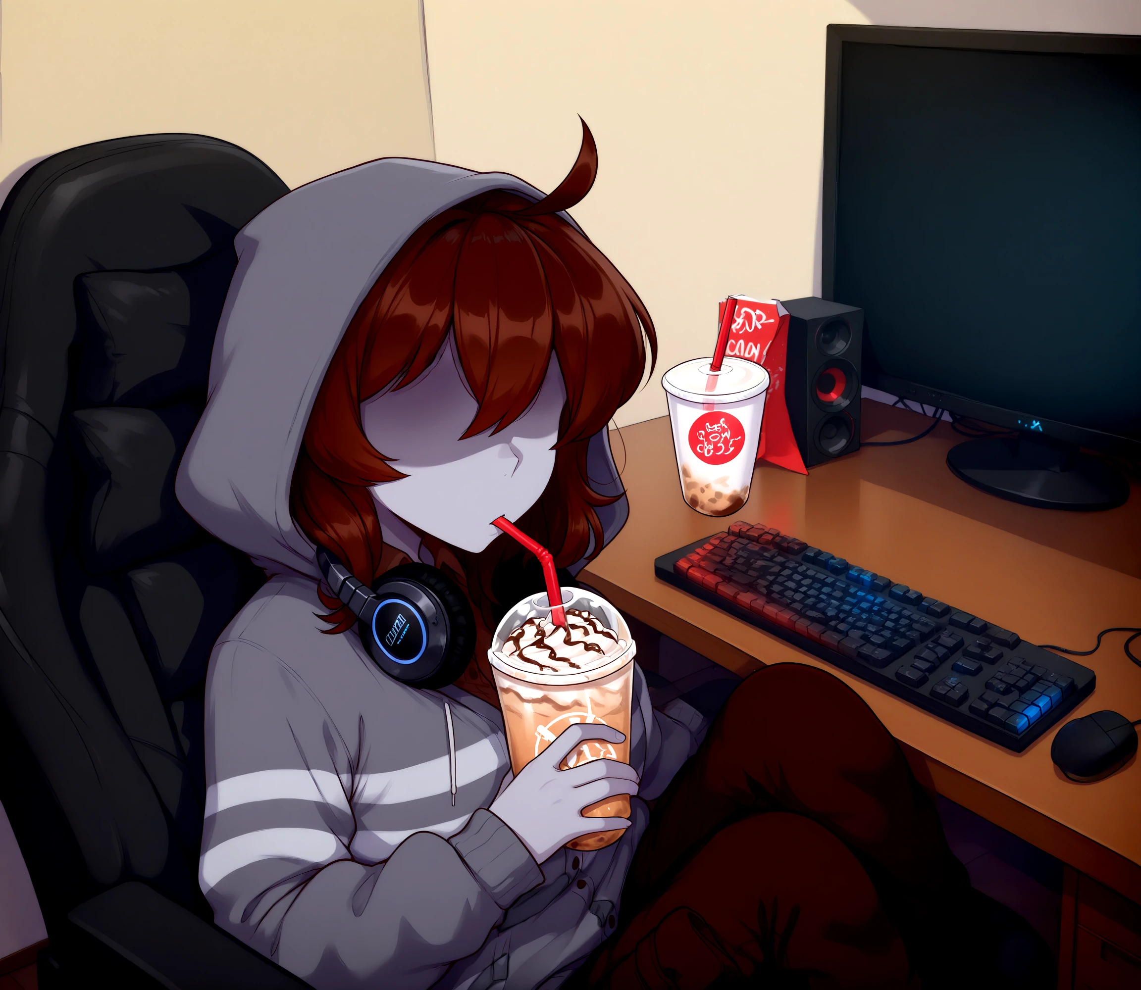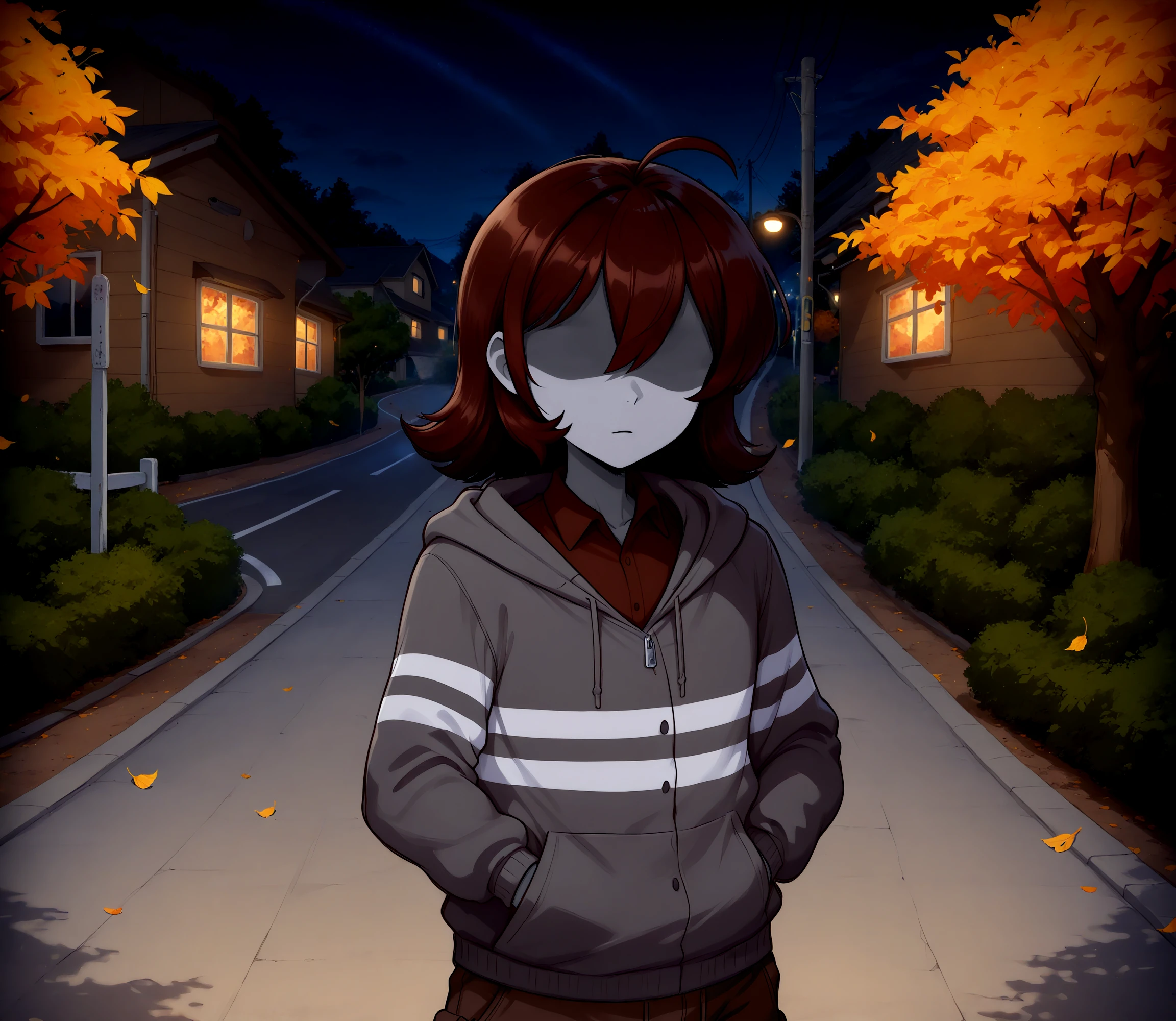 brown hair, medium hair, mullet, single sidelock, hair between eyes, no eyes, ahoge, wavy hair, grey skin, shaded face, no eyebrows, striped hooded cardigan, brown collared shirt, cargo pants,