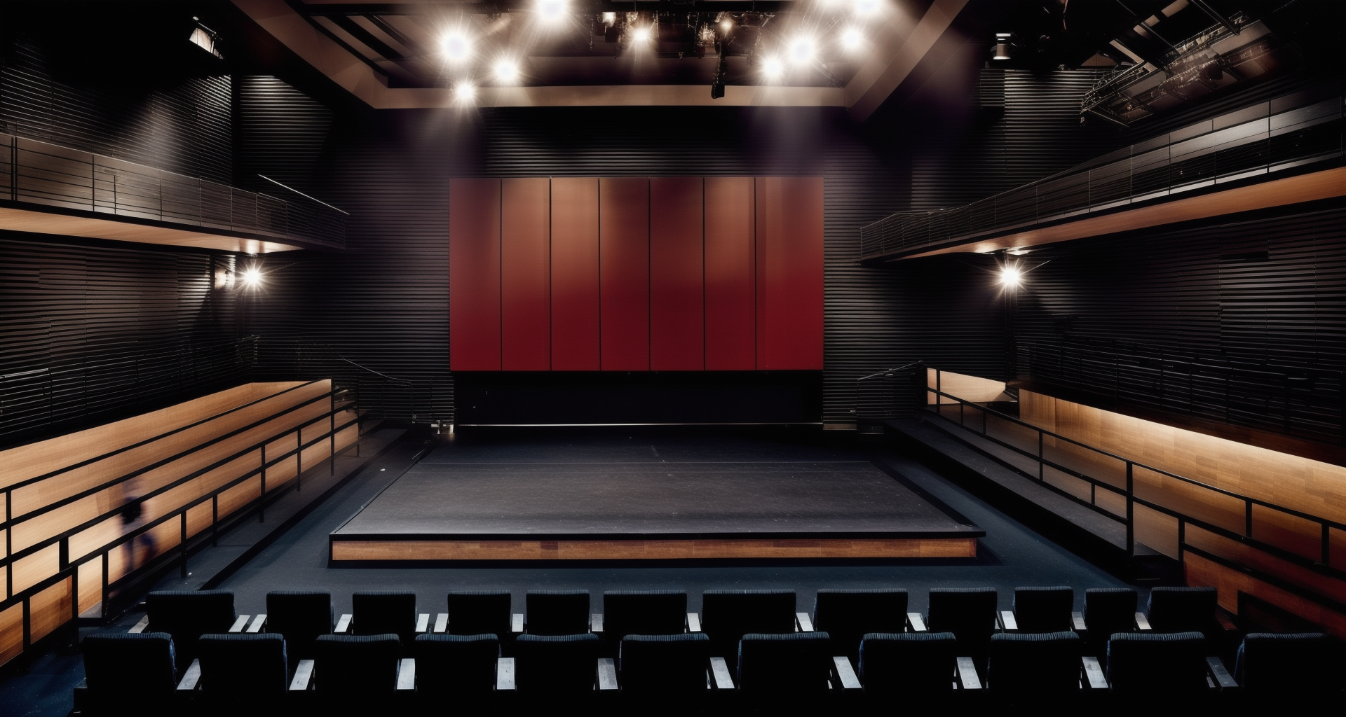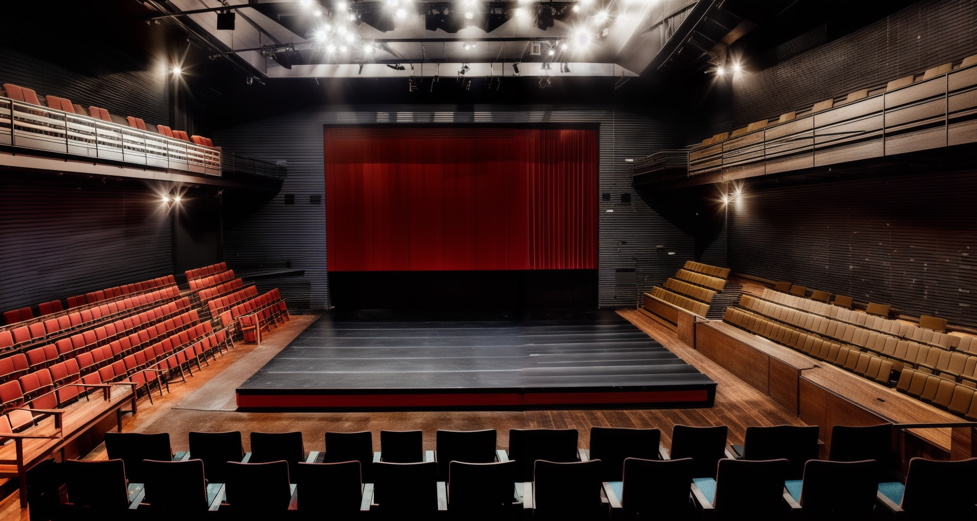 Tirrger tag is auditorium, Use prompts like view to stage, view to seat, side view, blue chairs, end stage/central stage/black box theatre, cool/warm/dark/light colors, dark colored flooring, stripe ceiling, hanging equipment, light, spotlight.... to guild this lora.