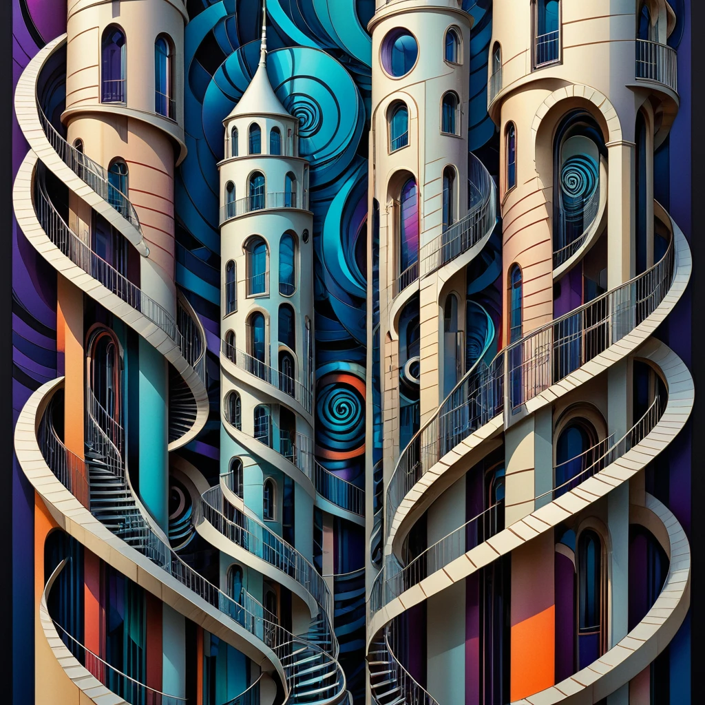 Architectural Marvels: Inspired by Escher’s staircases and Bachelier’s Gothic aesthetic, the architectural elements of this LoRA range from grand castles and twisted spires to abstract structures wrapped in labyrinthine paths. The result is a visually striking, almost hypnotic blend of structure and chaos.
