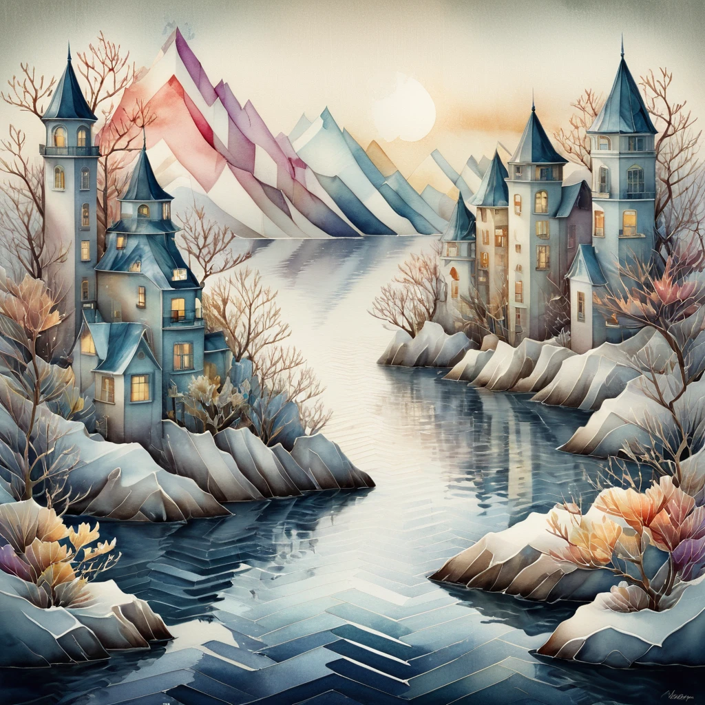 The images created with Echelier2 showcase surreal landscapes and unique, otherworldly architecture that evokes both mystery and grandeur. Imagine soaring cities that appear suspended in the cosmos, castles nestled among misty, layered mountains, and dreamlike environments that feel both ethereal and grounded in intricate detail. The LoRA takes inspiration from Bachelier’s rich storytelling visual style and Escher’s fascination with impossible shapes and geometric patterns, merging them to give life to hauntingly beautiful environments.