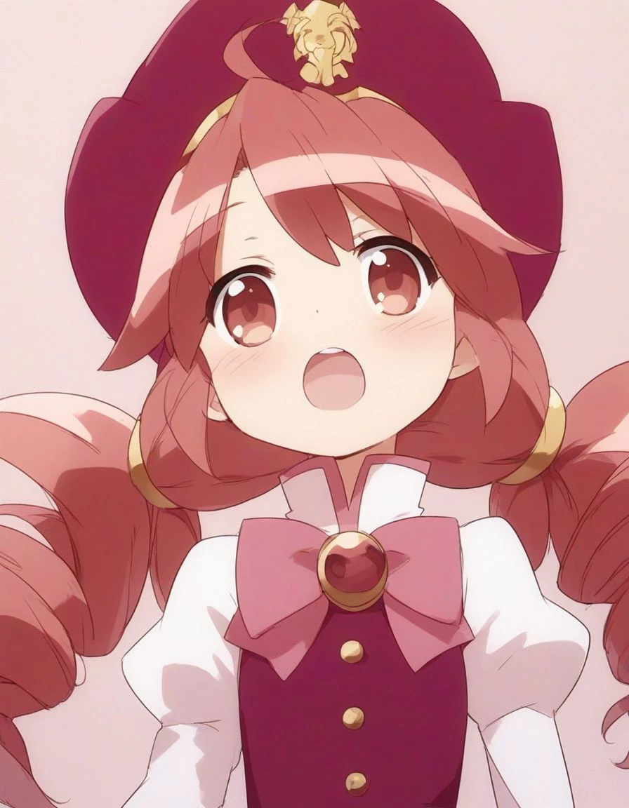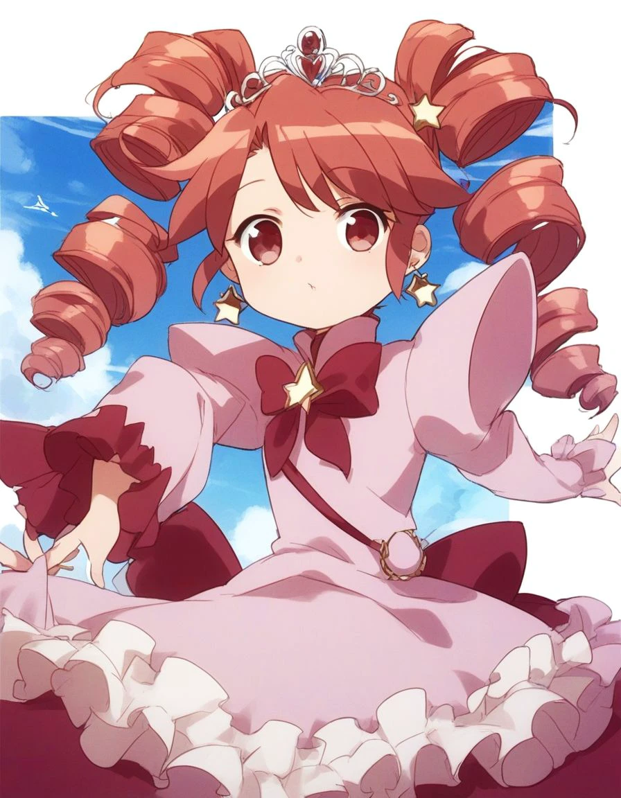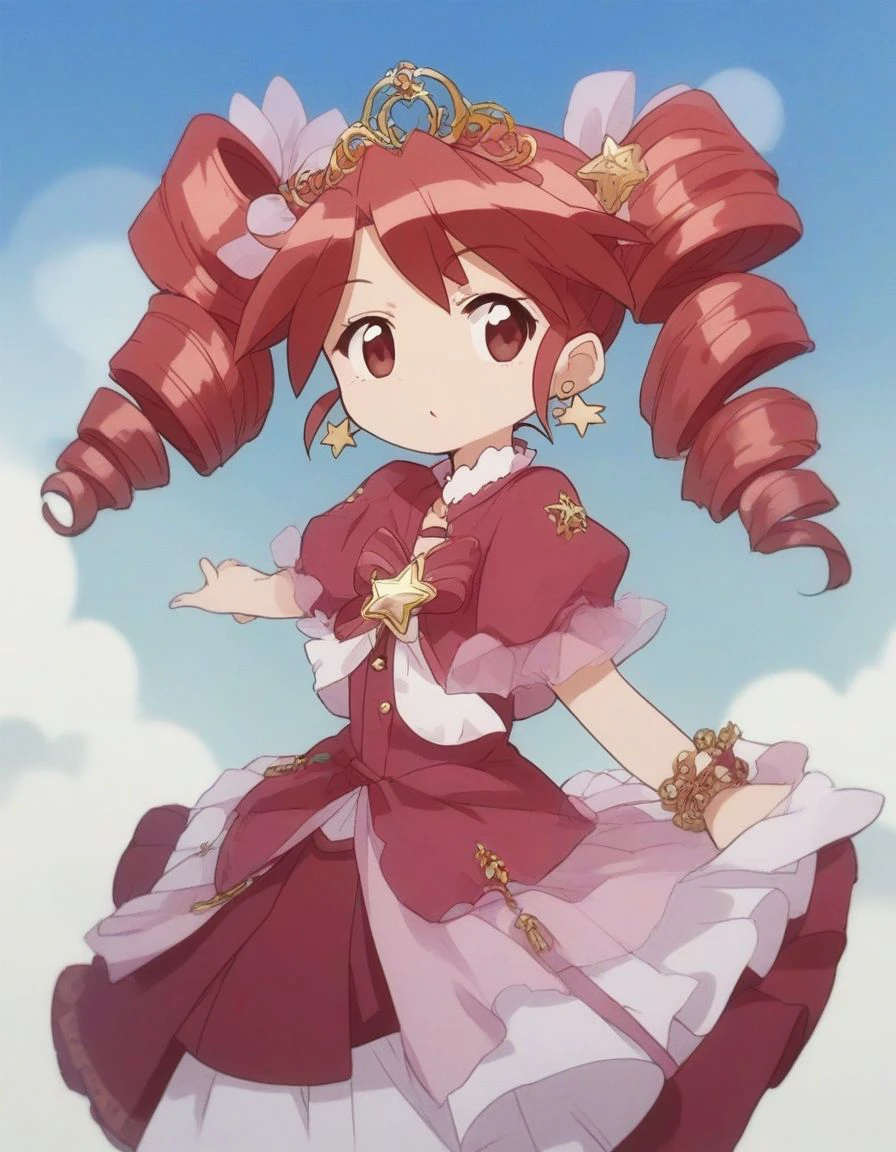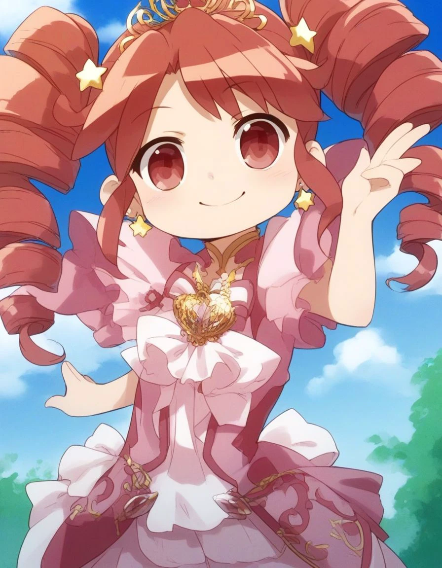 Fine, 1girl, solo, red eyes, drill hair, twin drills, red hair, twintails,