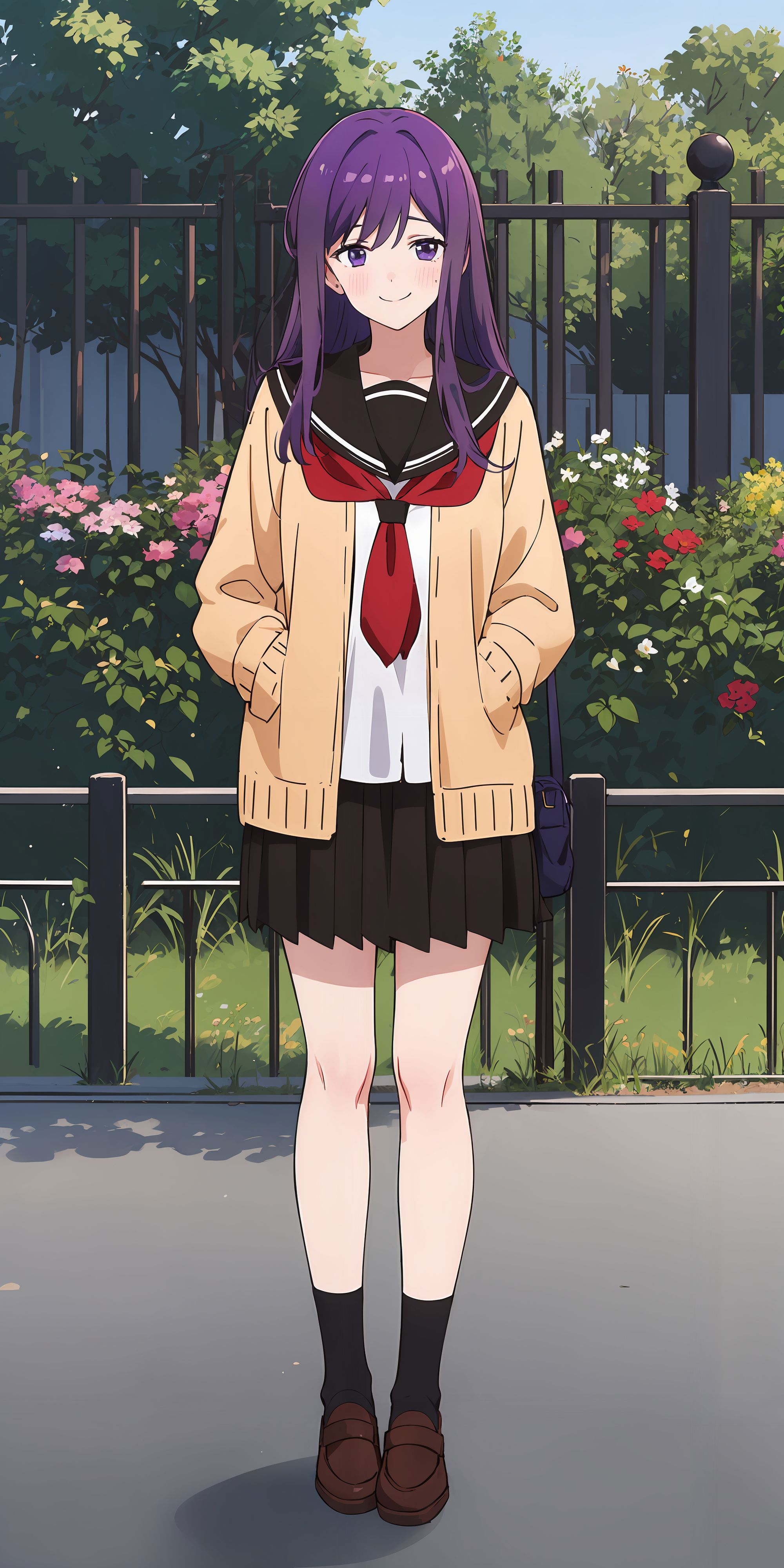本命服装:white serafuku, black sailor collar, red neckerchief, yellow cardigan, black socks, black school short skirt, brown shoes,