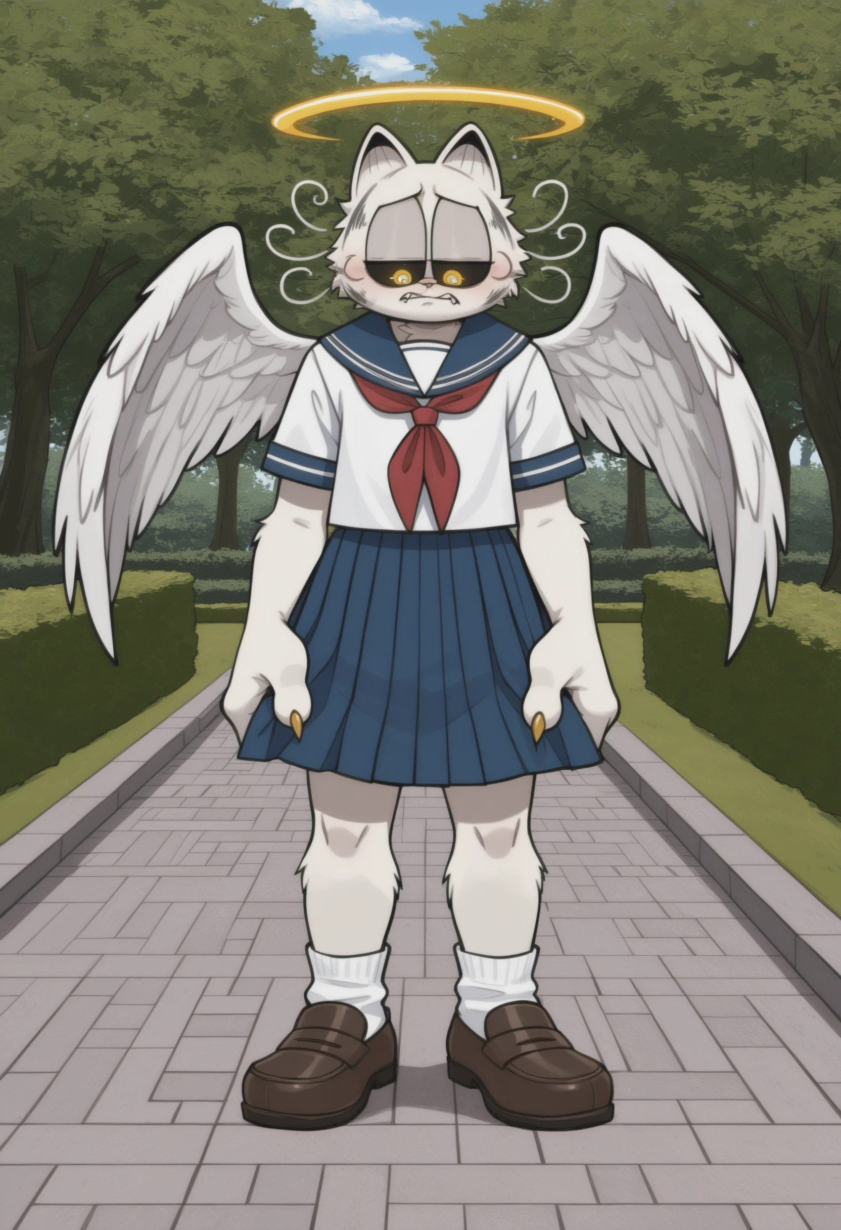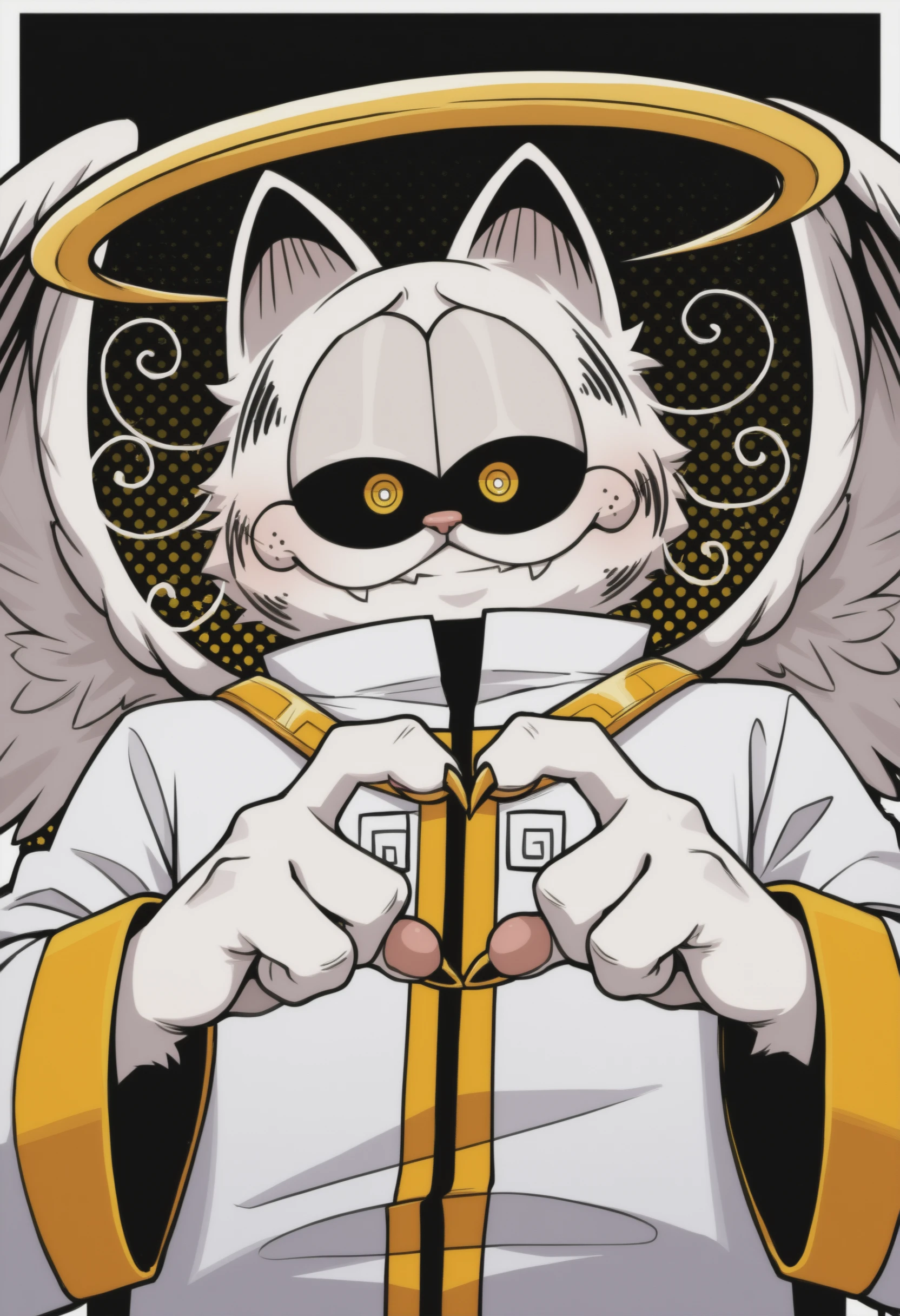1boy, godfield, garfield_\(series\), black sclera, yellow eyes, halo, white fur, wings, white wings, yellow accents