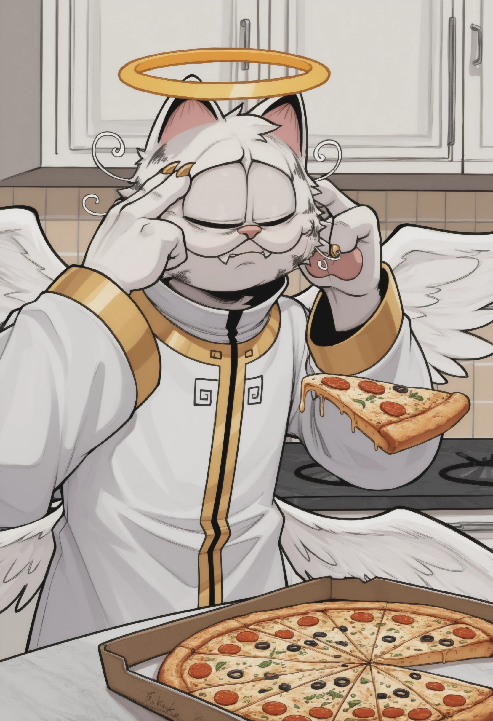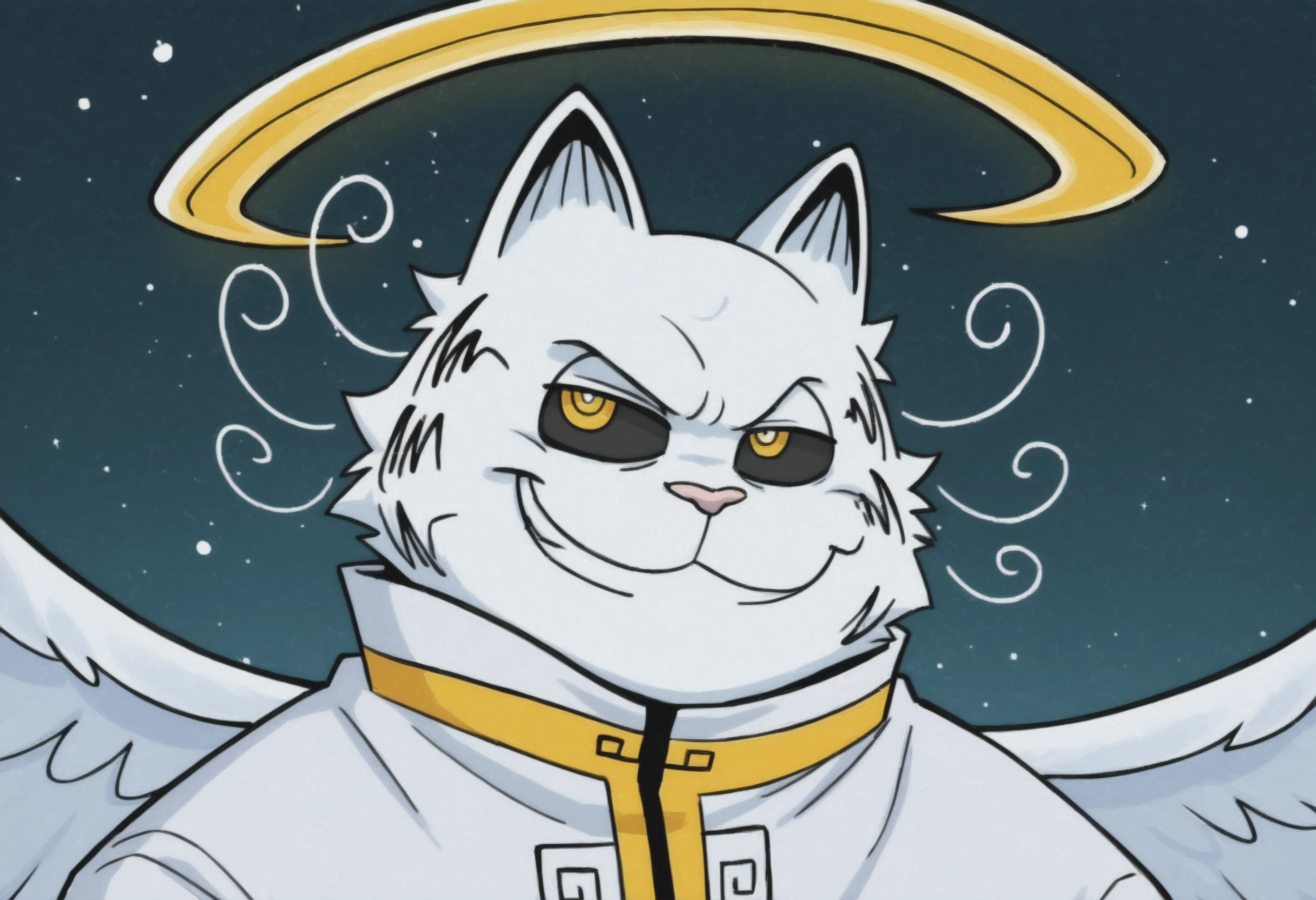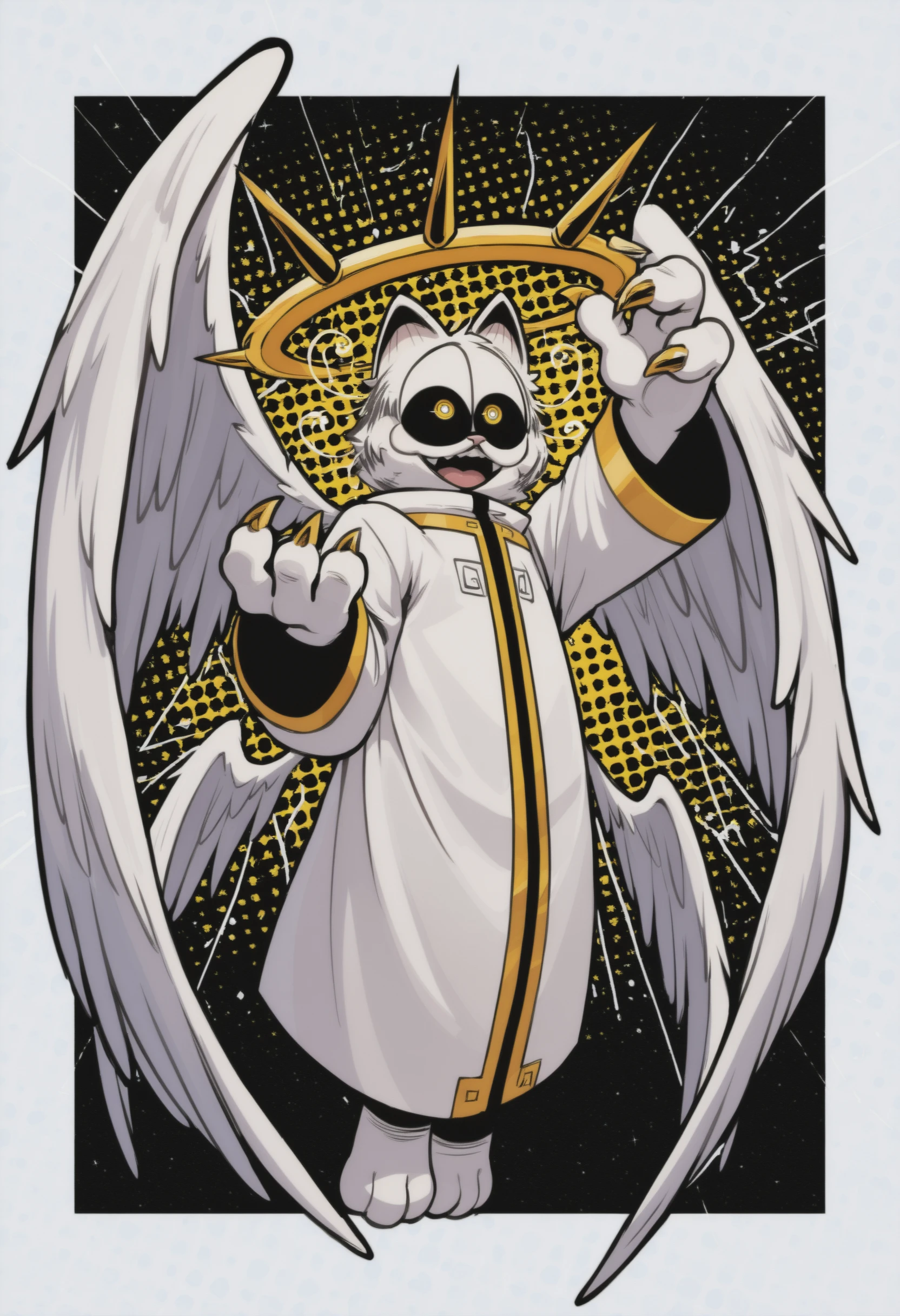 1boy, male, godfield, halo, white fur, facial tuft, cat ears, white nose, black sclera, yellow eyes, white pupils, whiskers, wings, seraph, white wings