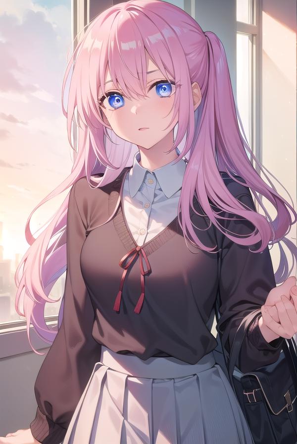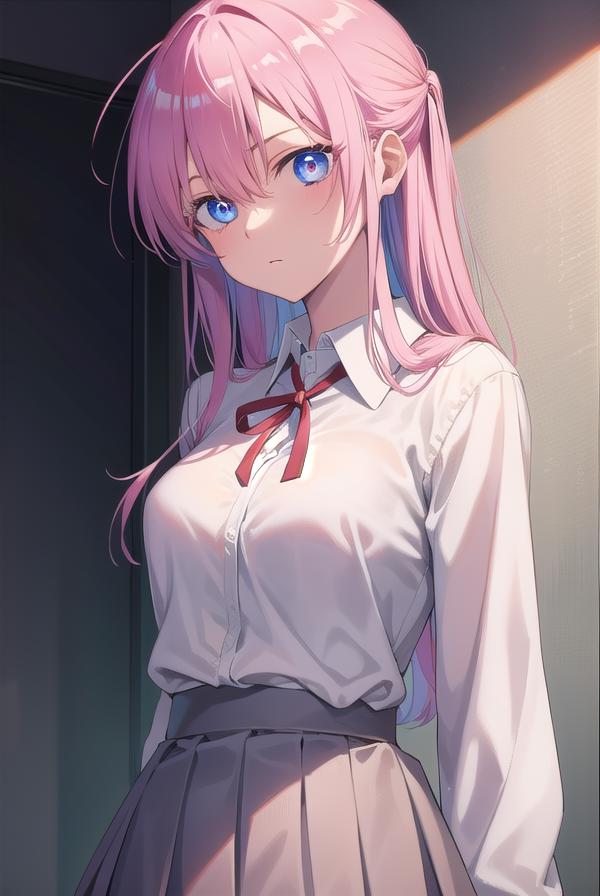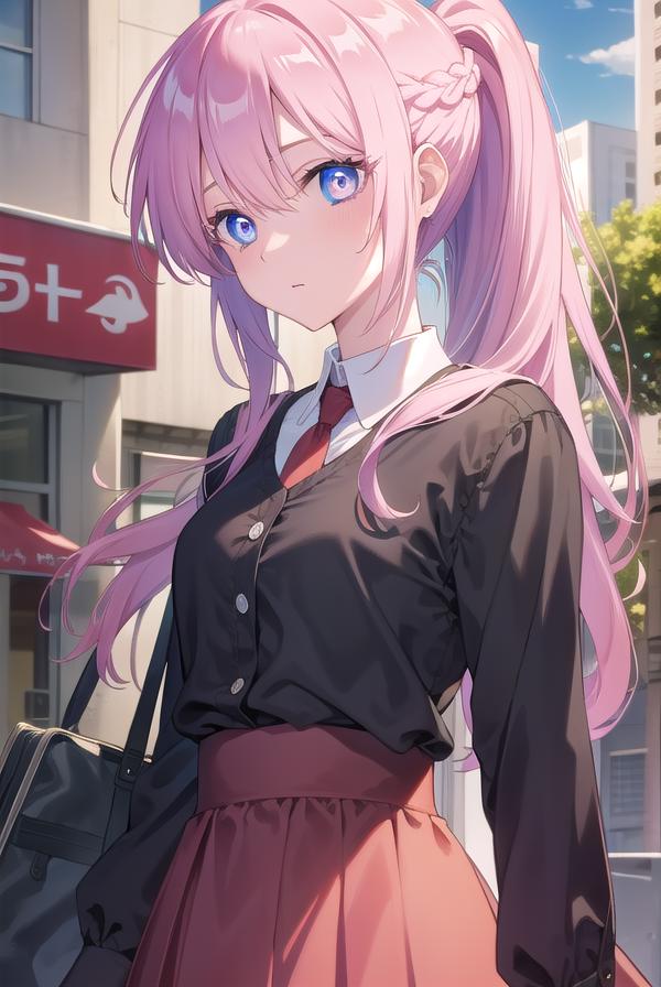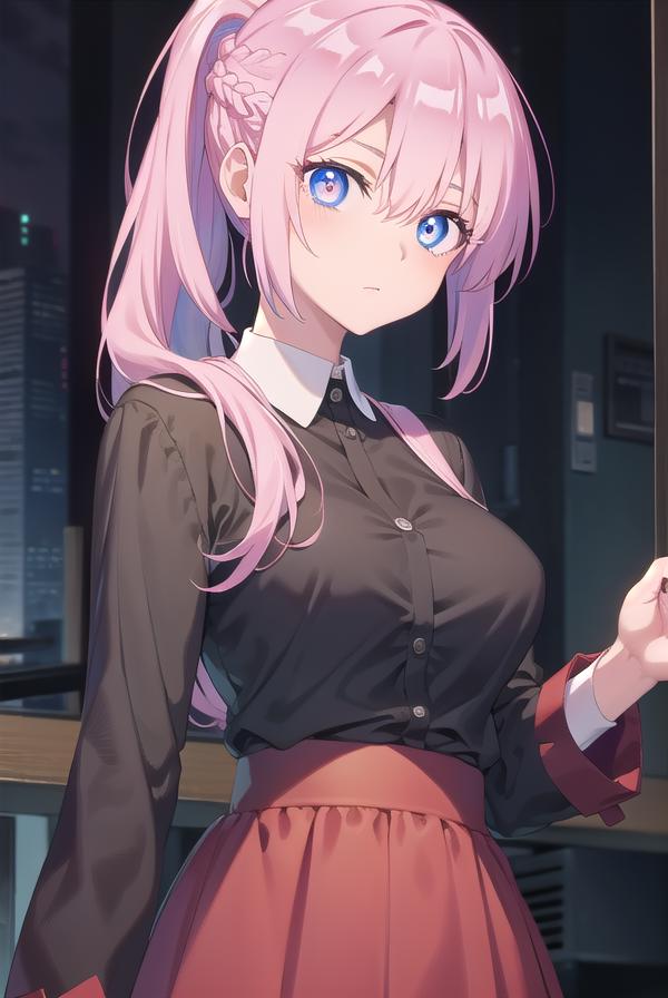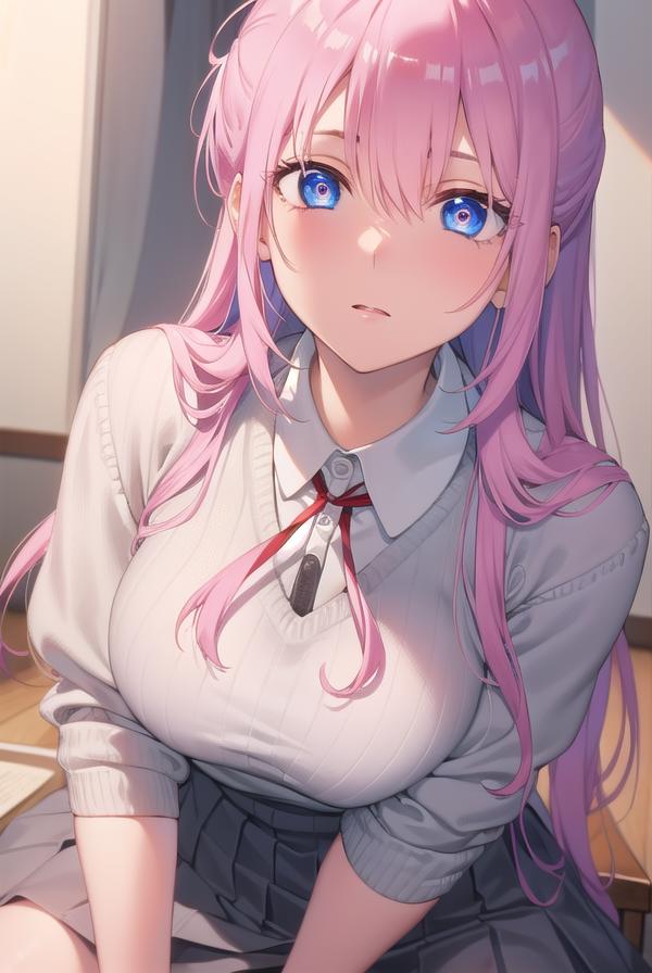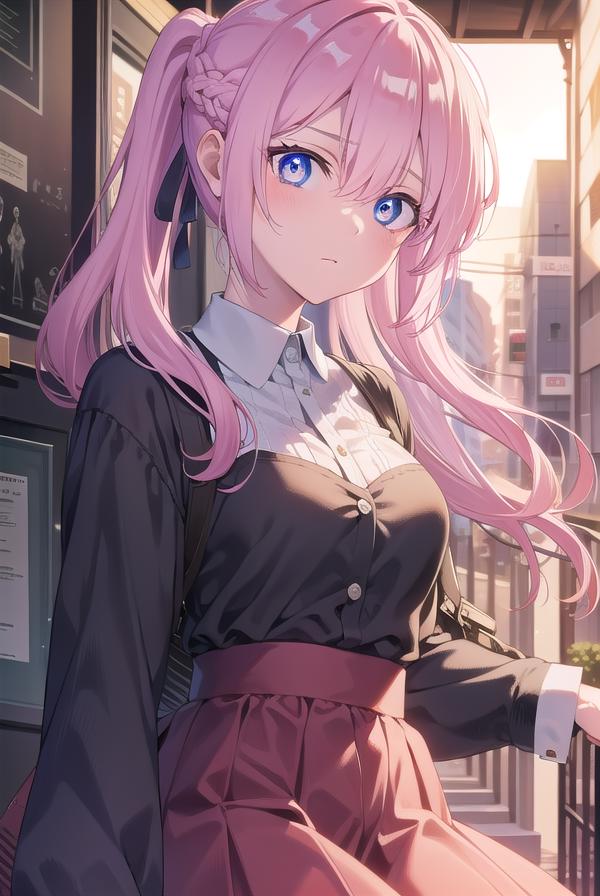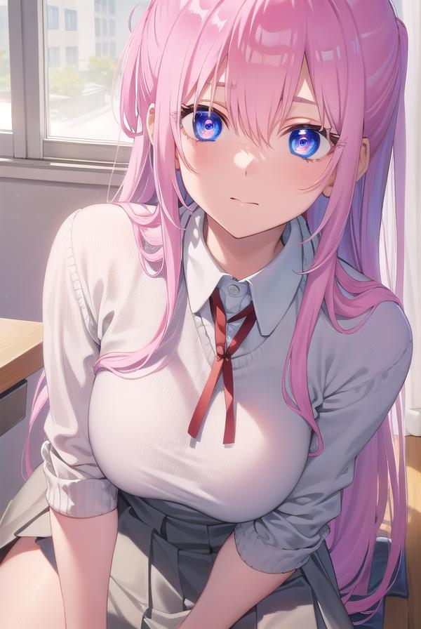 miyako shikimori, long hair, blue eyes, hair between eyes, pink hair,