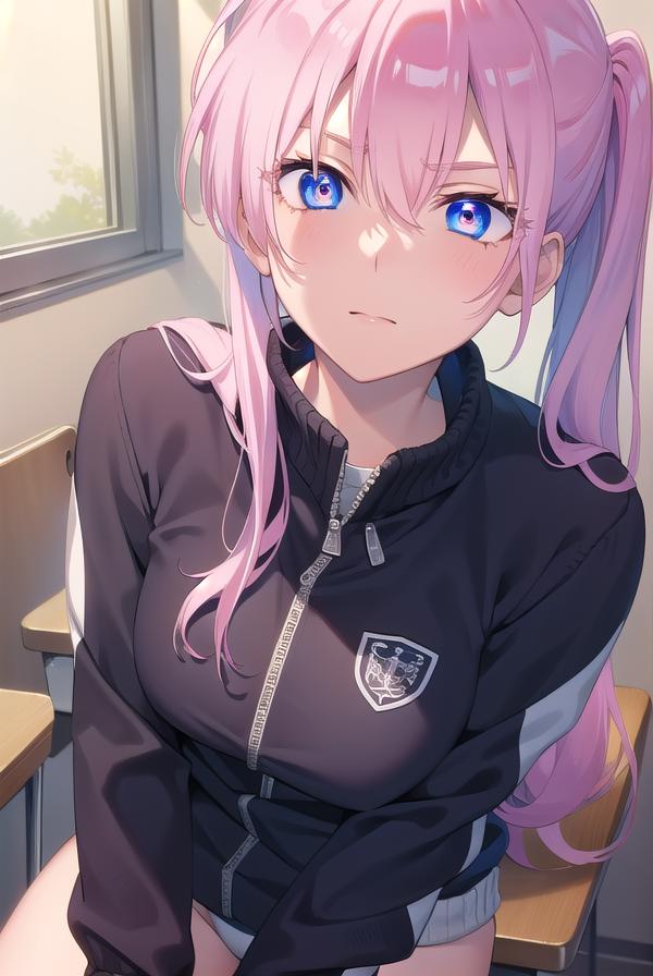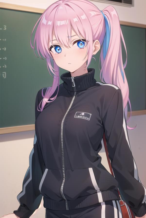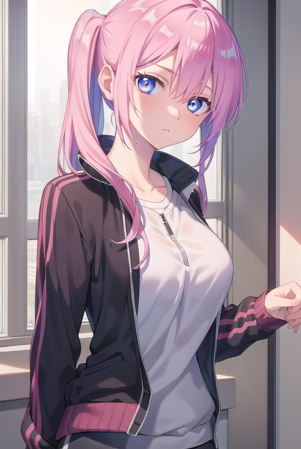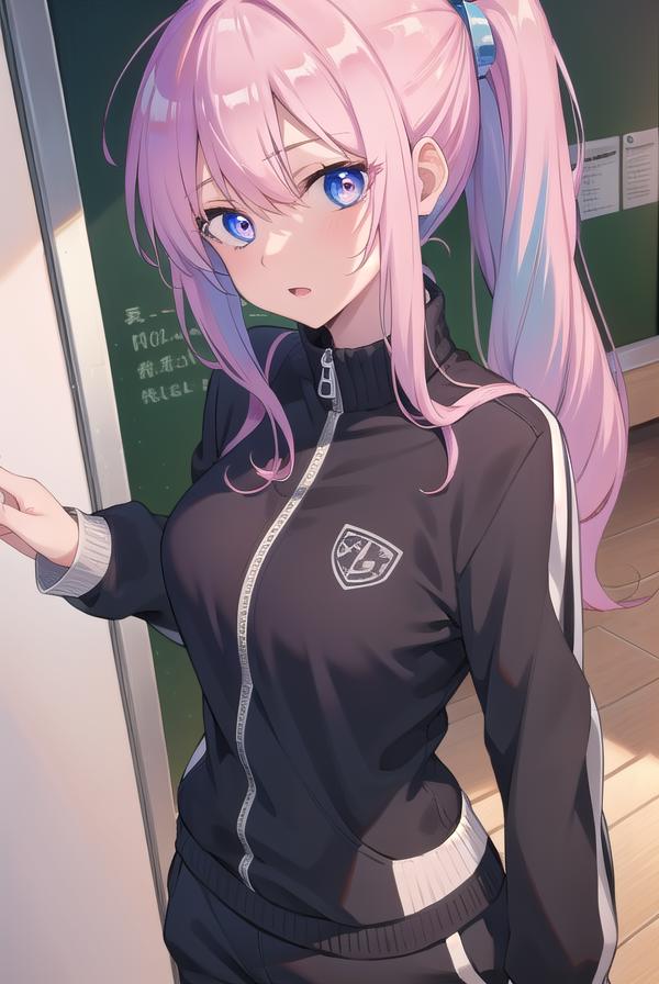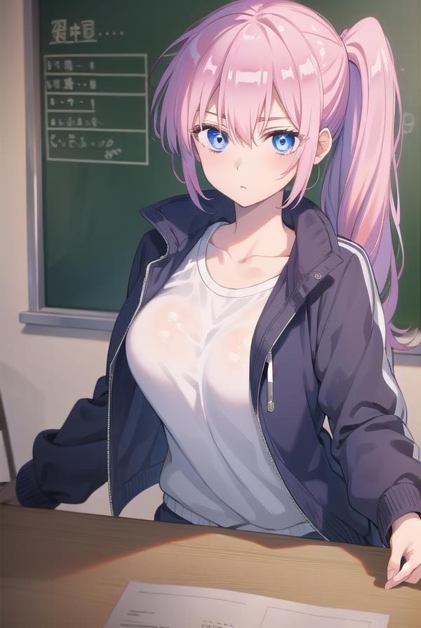 long sleeves, jacket, white shirt, side ponytail, blue jacket, track jacket, track suit,