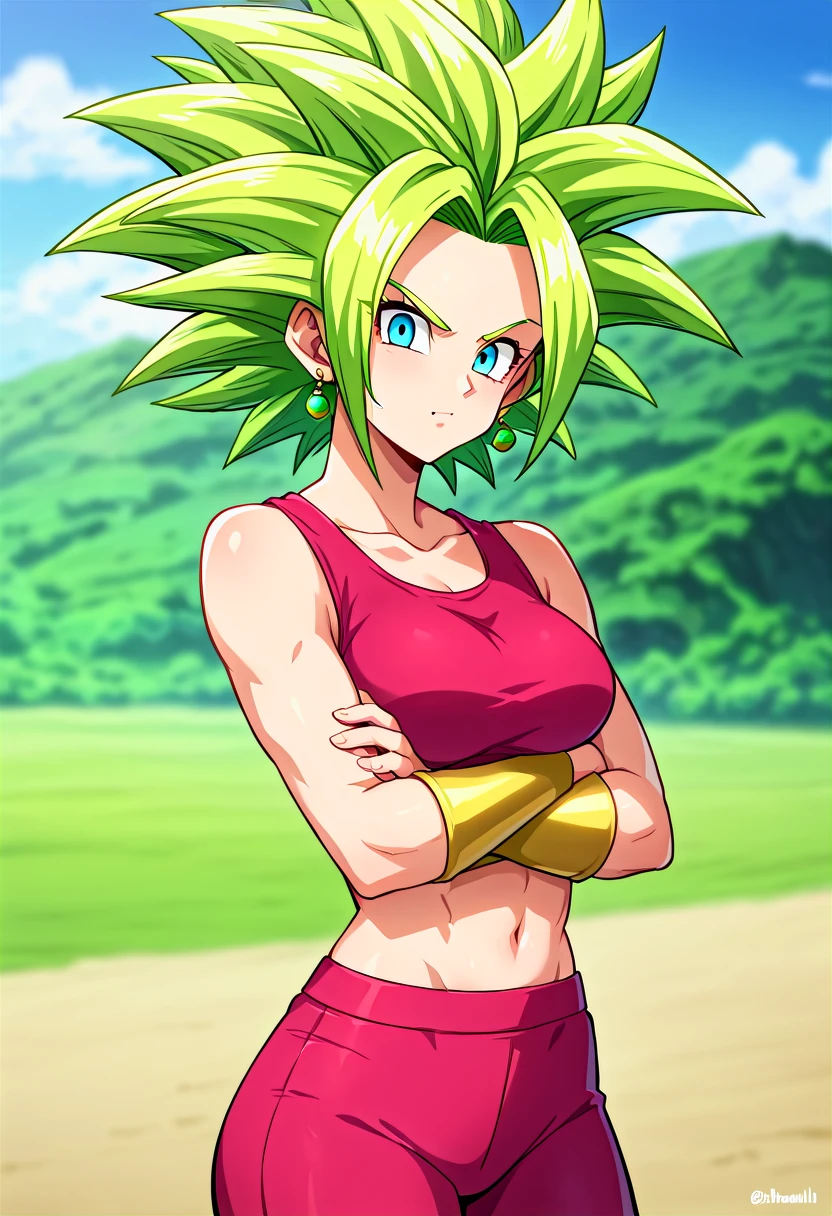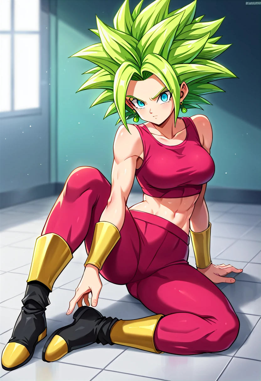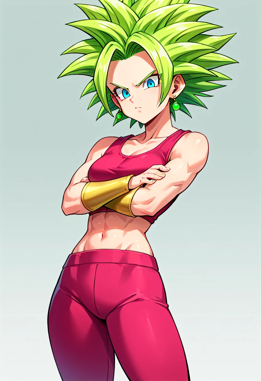 keflaDBS, 1girl, solo, super saiyan, blue eyes, green hair, spiked hair, potara earrings, jewelry, crop top, tank top, arm guards, midriff, yoga pants, shin guards, black boots,