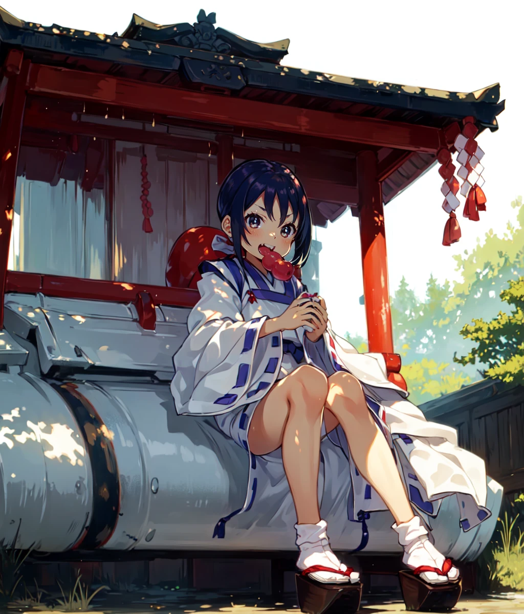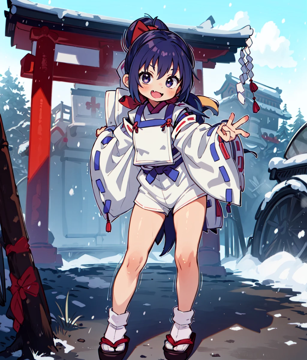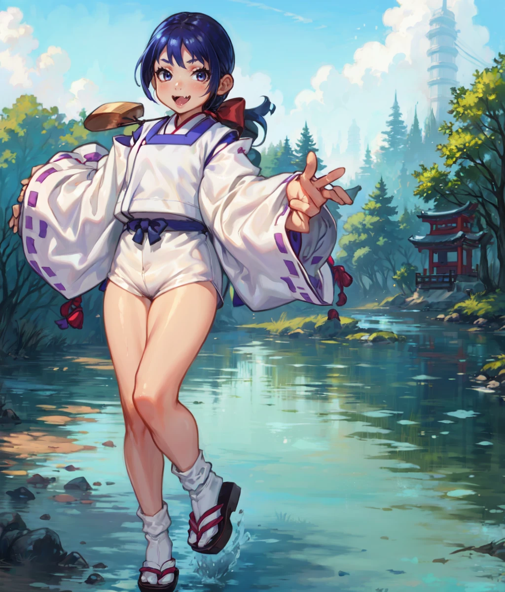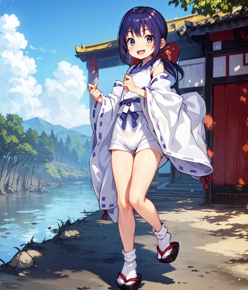 Notable tags: blue hair, low ponytail, ribbon, white outfit, japanese clothes, shorts, sandals, detached sleeves, long sleeves,