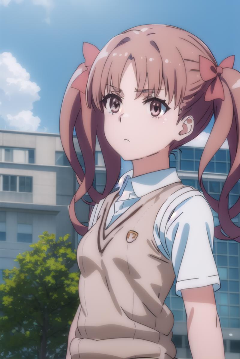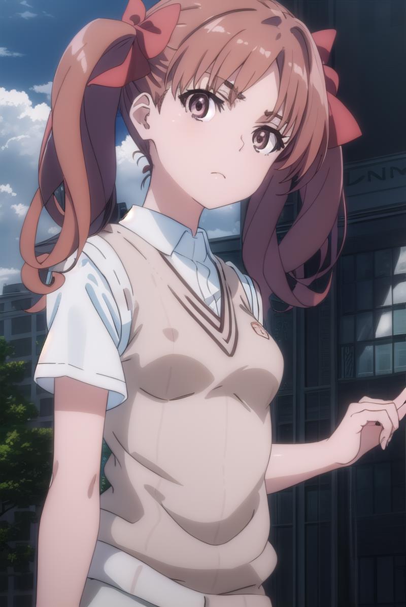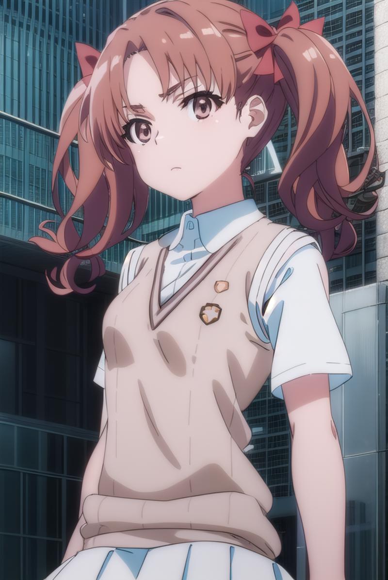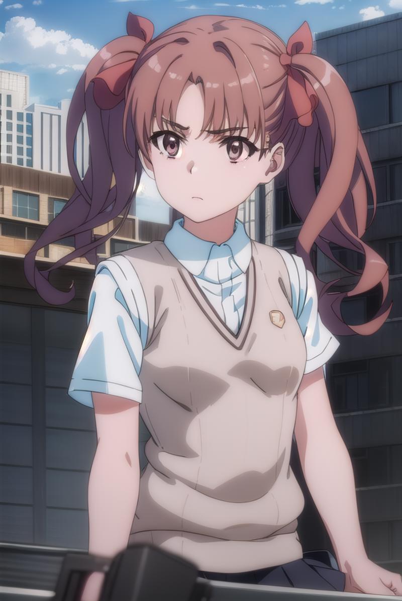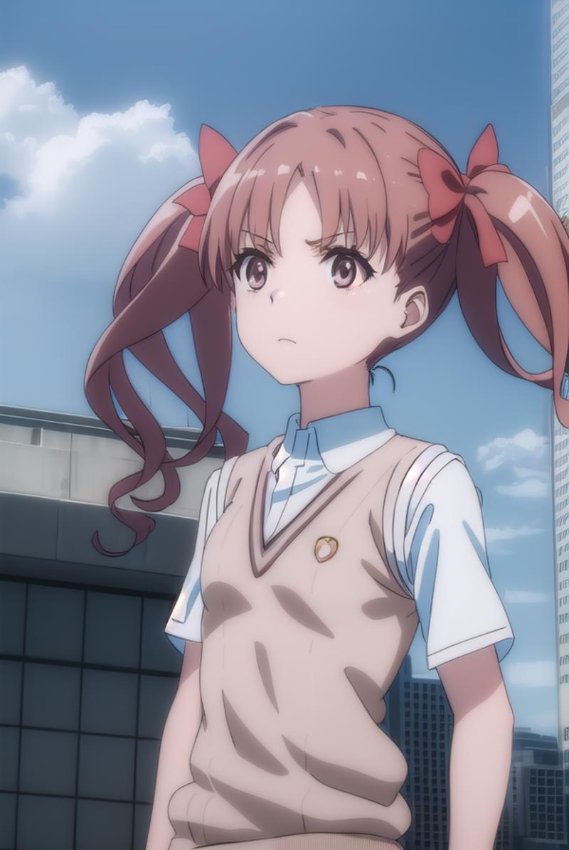 kuroko shirai, brown hair, long hair, (parted bangs:1.5), (brown eyes:1.7), ringlets, twintails, hair bow, bow, red bow,