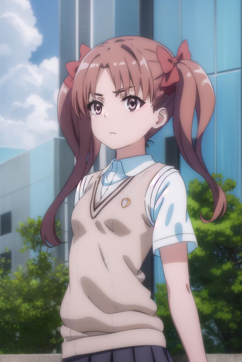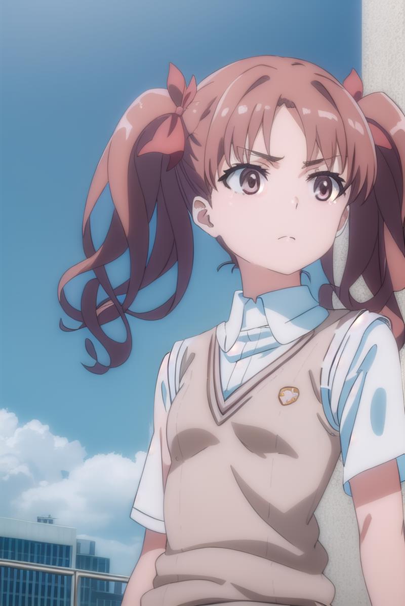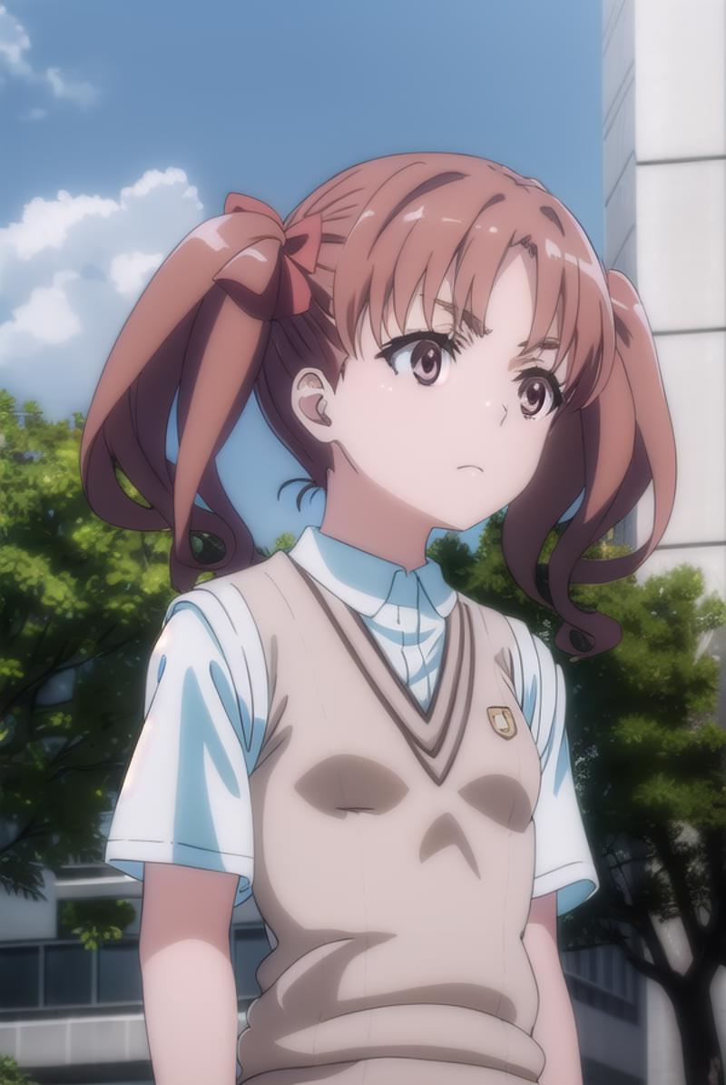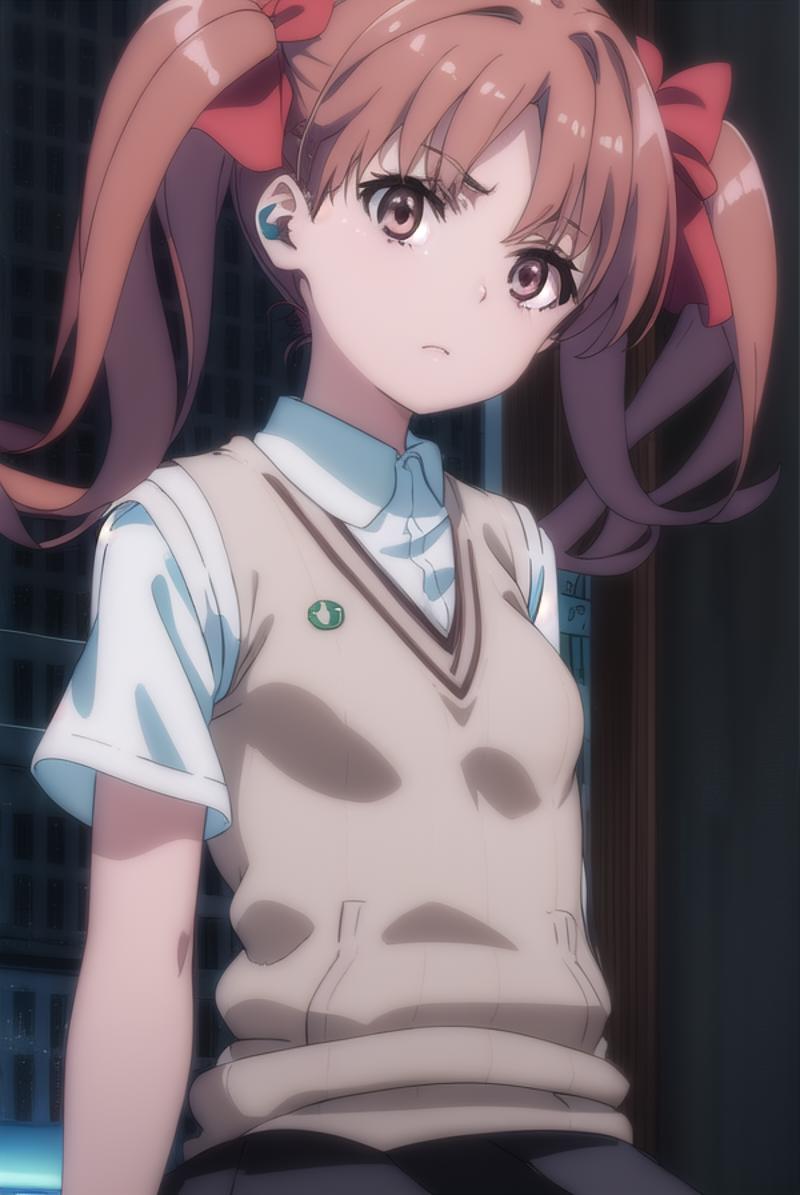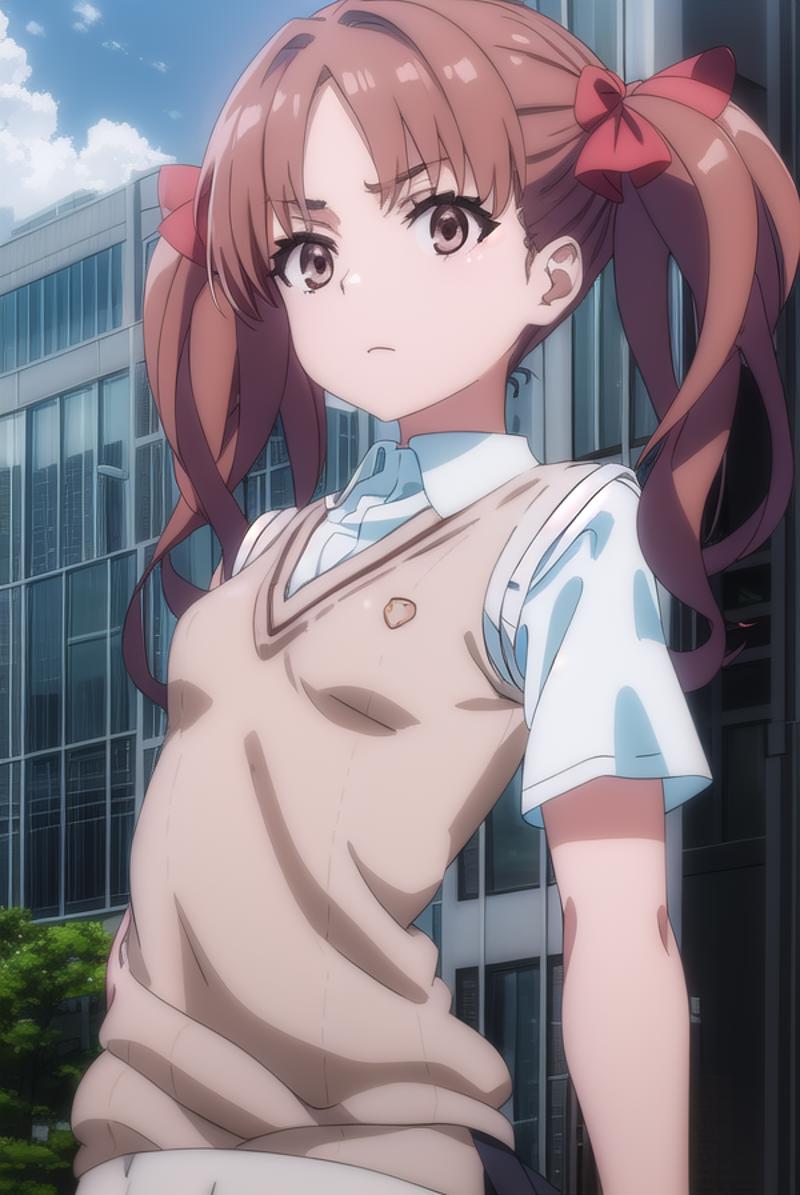 kuroko shirai, brown hair, long hair, (parted bangs:1.5), (brown eyes:1.7), ringlets, twintails, hair bow, bow, red bow,