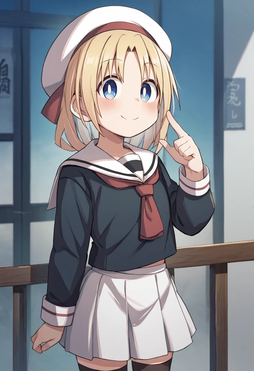 liliy-baker,blue eyes,blonde hair,white beret,medium hair,serafuku,black shirt,long sleeves,red neckerchief,white skirt,black thighhighs