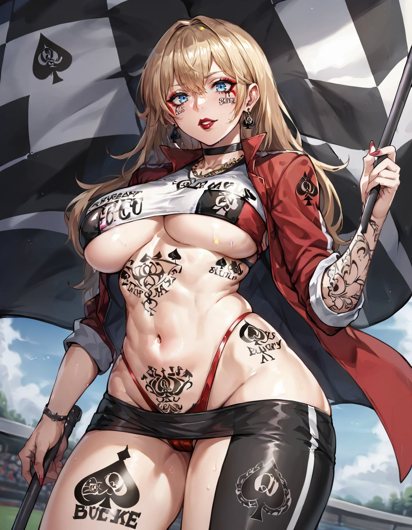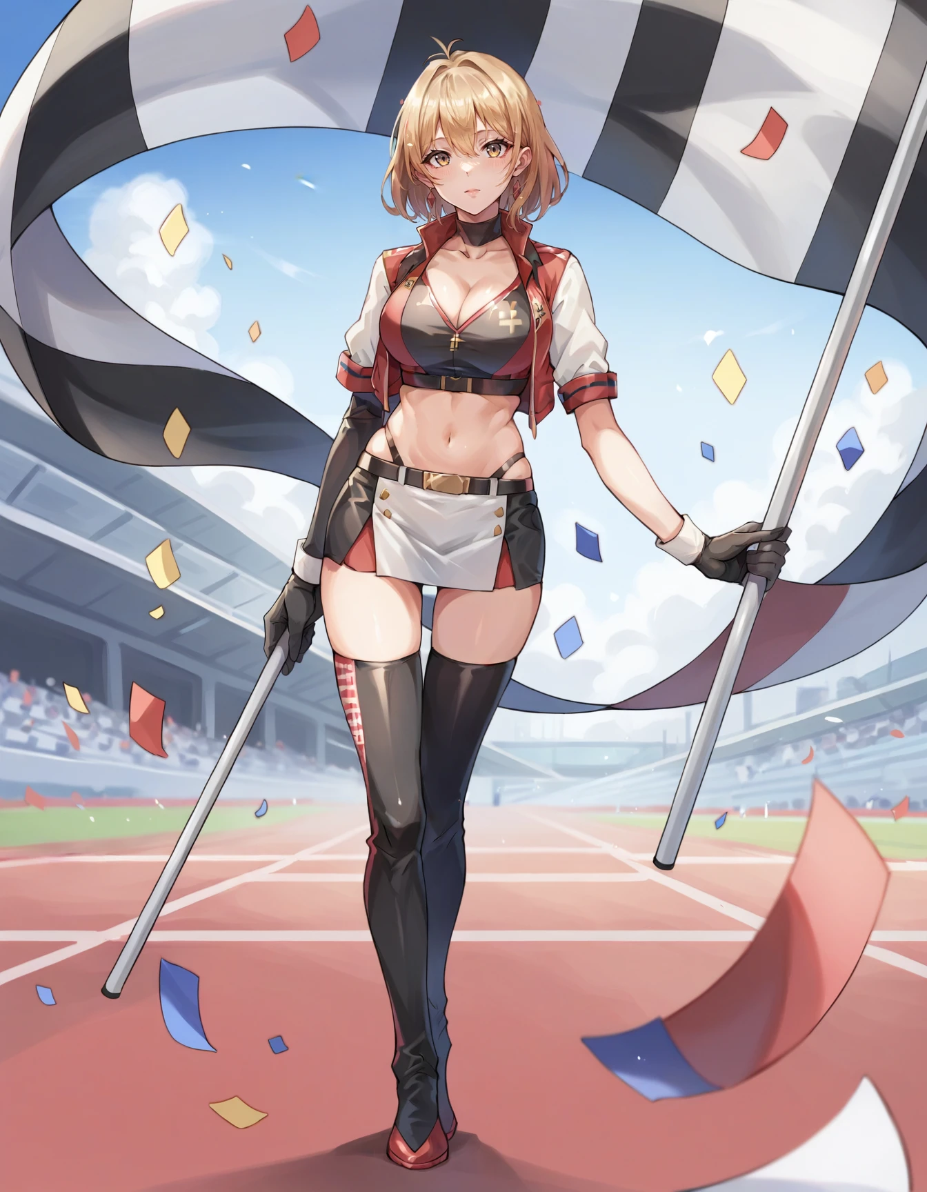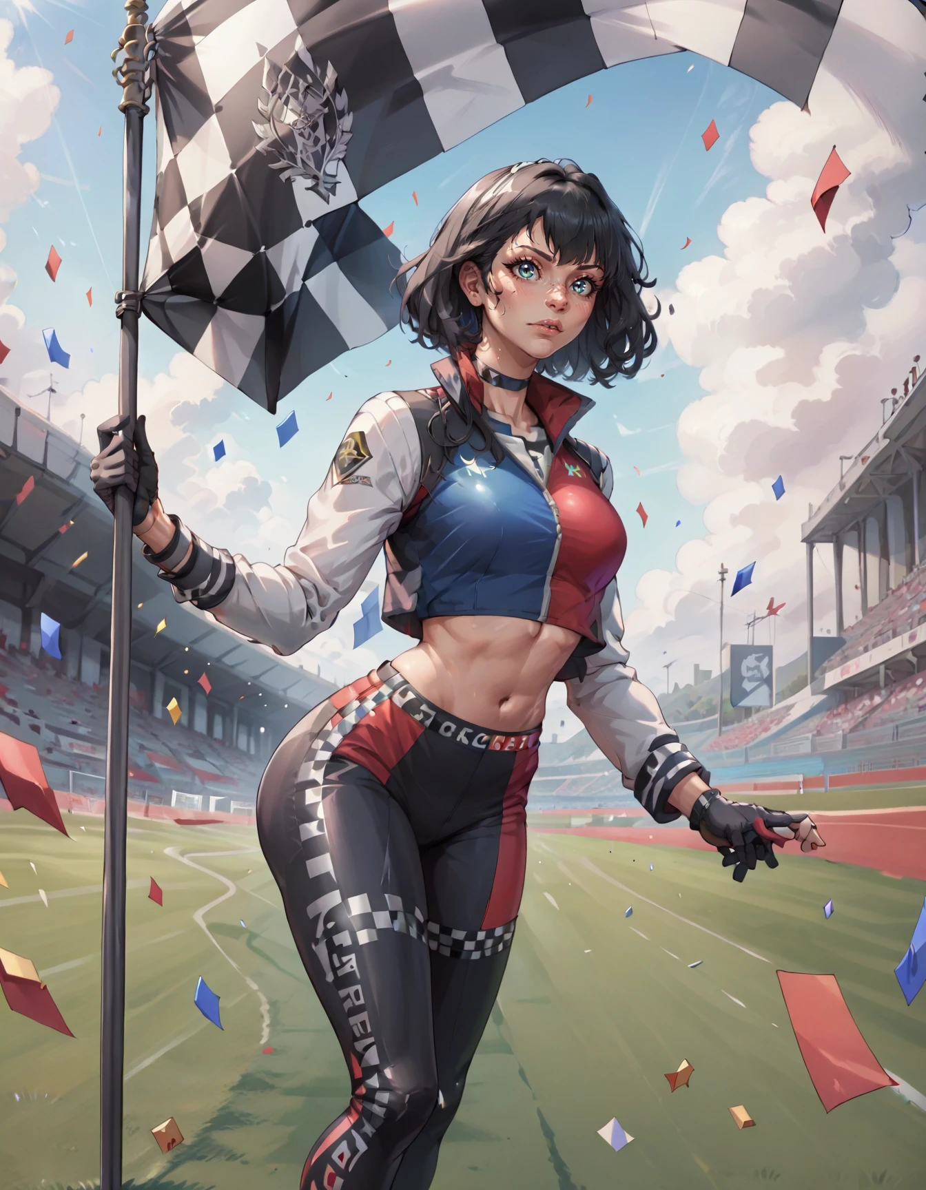 checkered flag, holding flag, racetrack - To add her waving the flag.