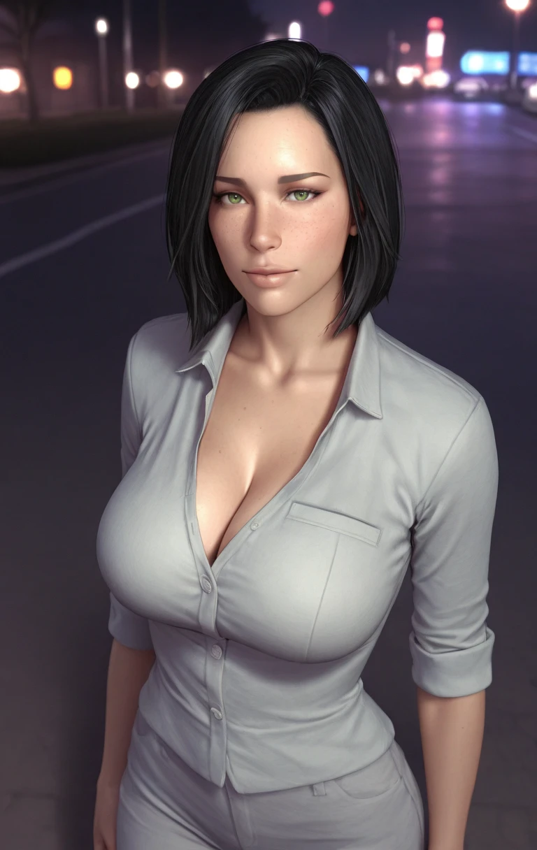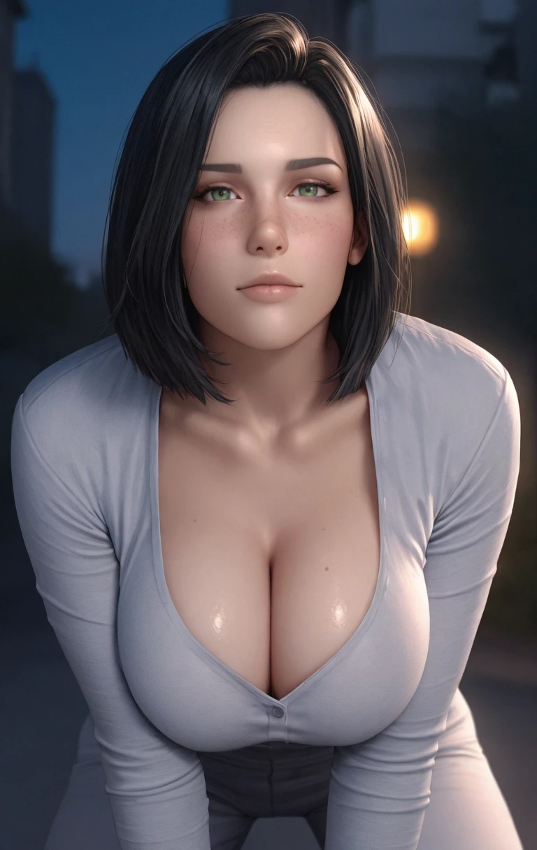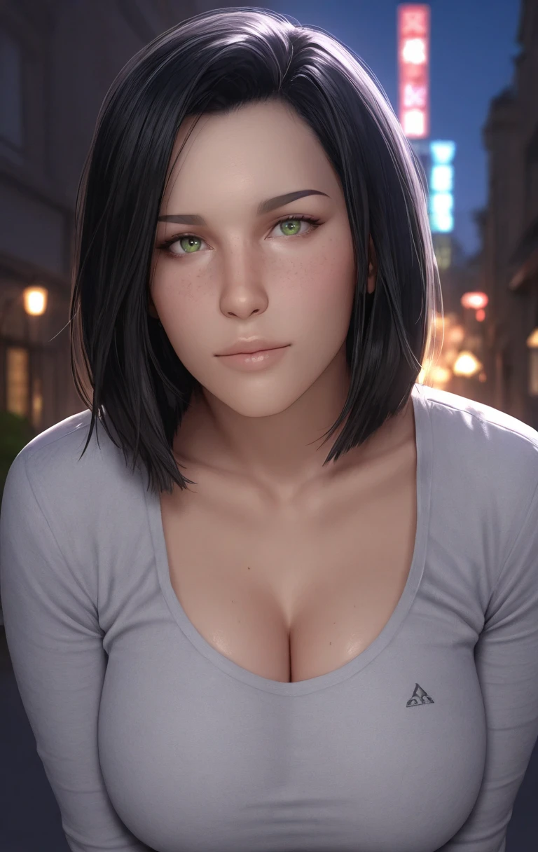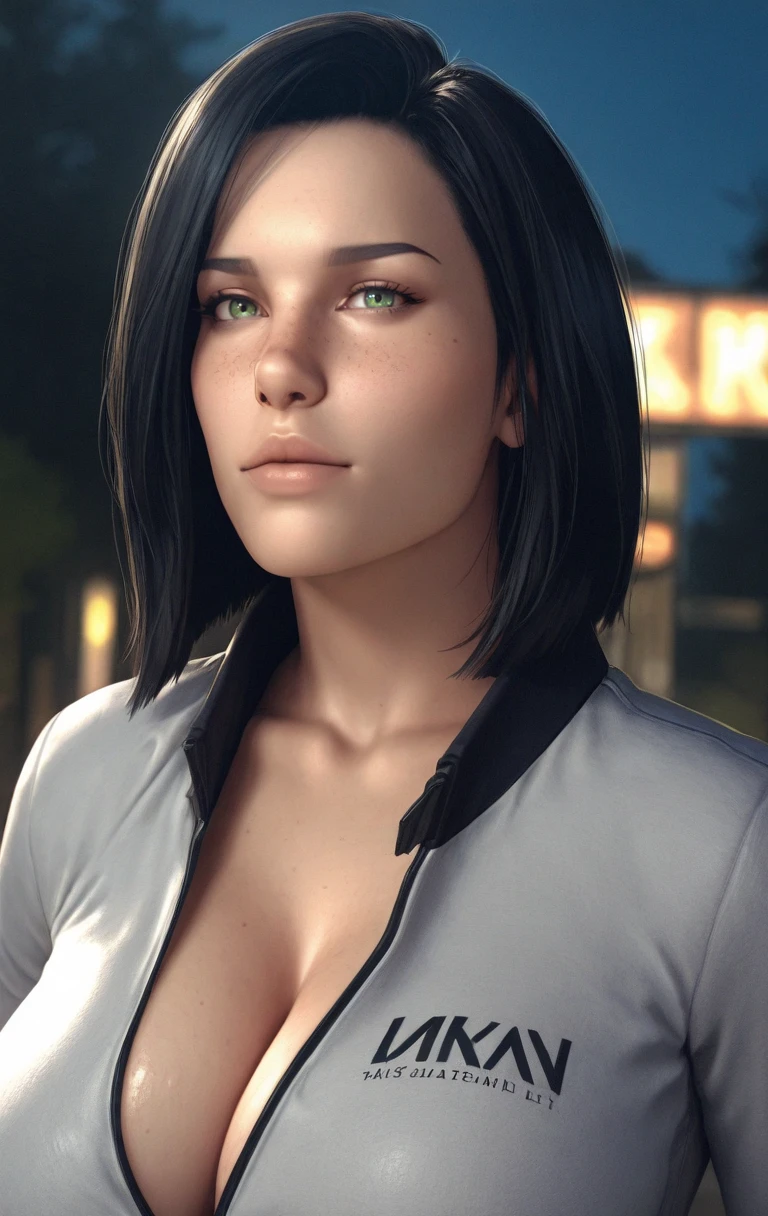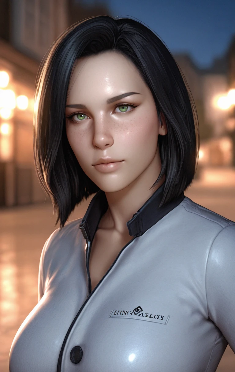 ak1r0ss, 1girl, solo, looking at viewer, short hair, black hair, green eyes, lips, jacket, freckles, nose, realistic