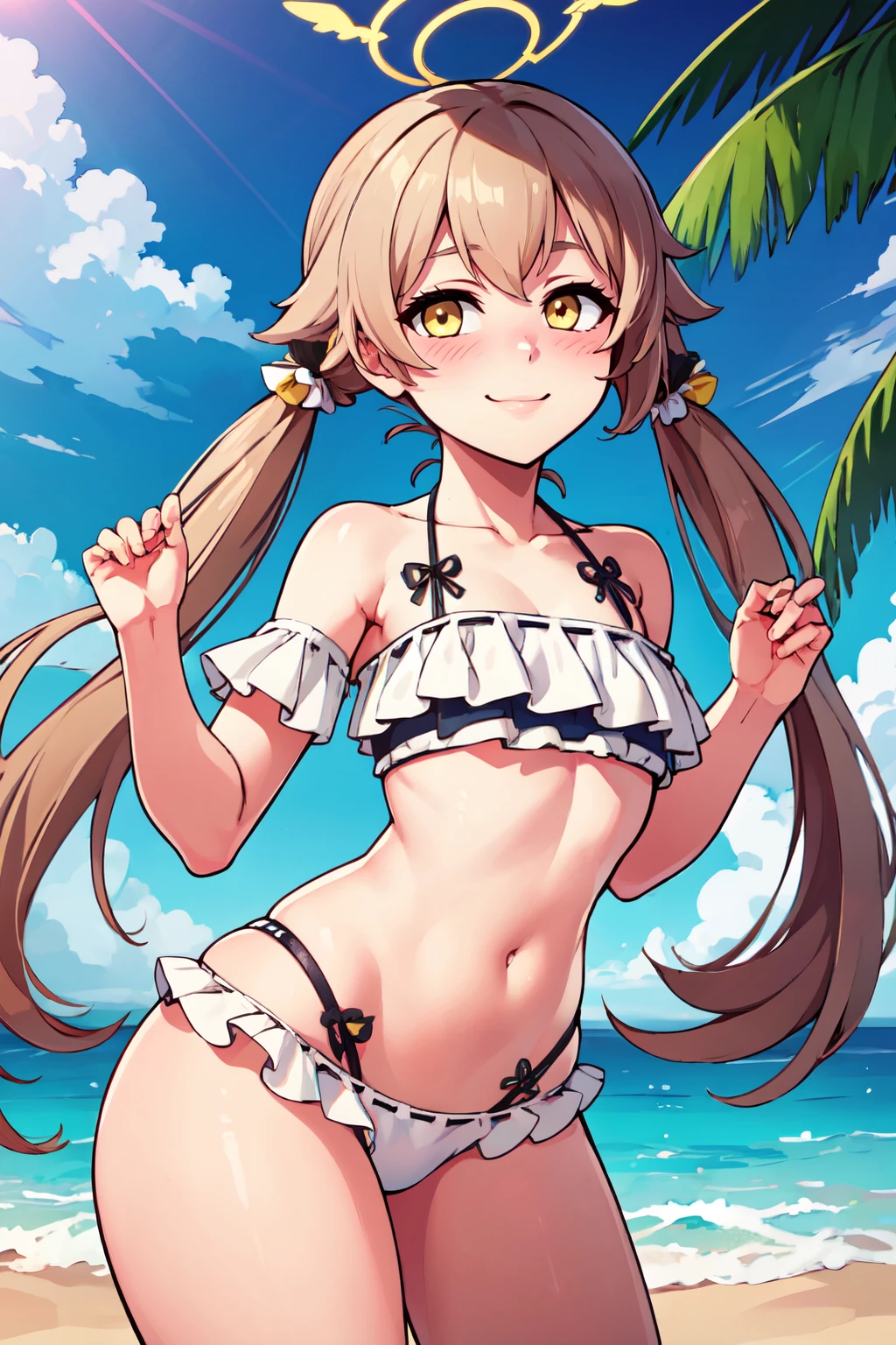 zzHifumi, yellow eyes, light brown hair, long hair, twintails, halo, breasts white cardigan, blue skirt, school uniform, pleated skirt, backpack, blue sailor collar,