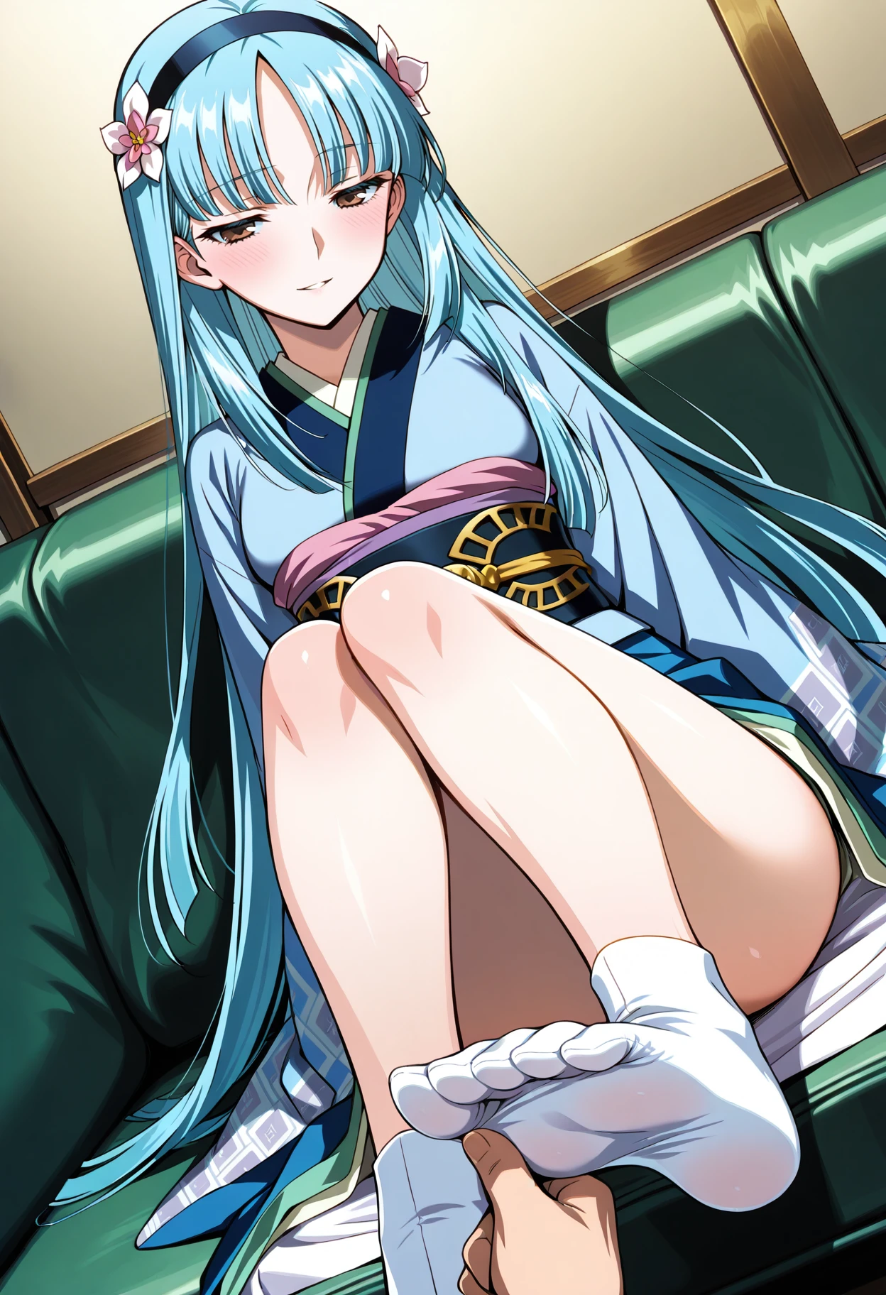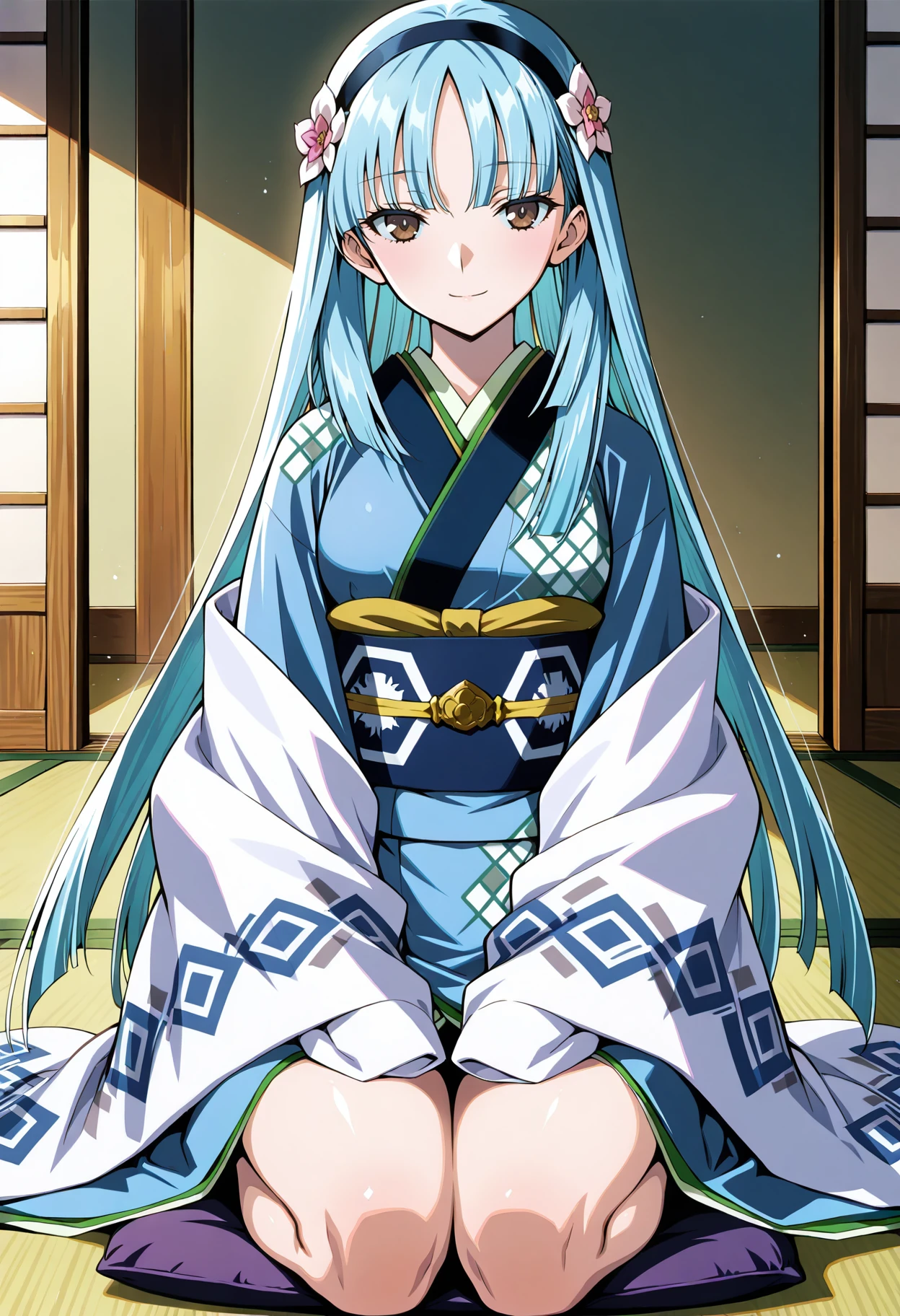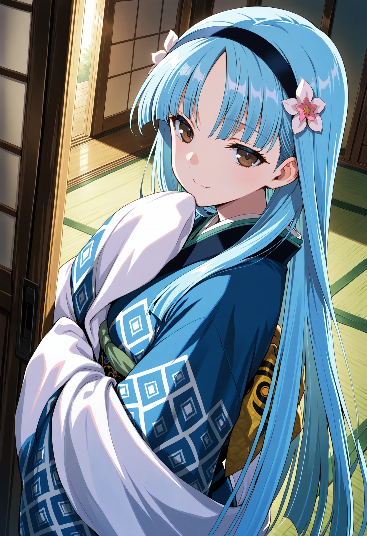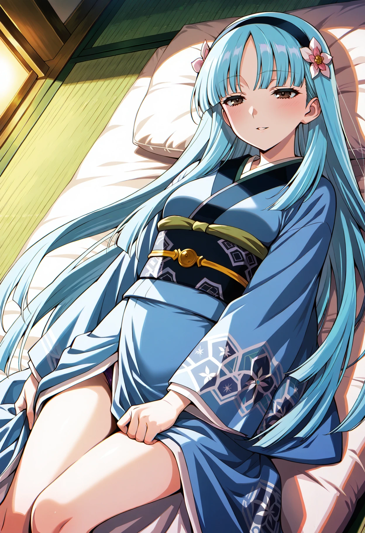 Base: ranceyukihime, 1girl, retro artstyle, solo, very long hair, aqua hair, straight hair, parted bangs, hairband, hair flower, brown eyes, yukihime blue kimono, japanese clothes, sash, obi, long sleeves,