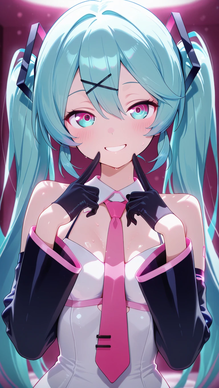 white dress,pink necktie,long sleeves,black sleeves,black gloves,black pantyhose