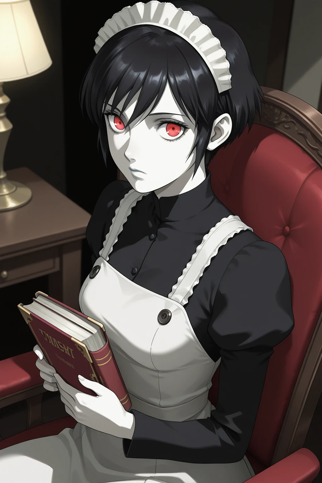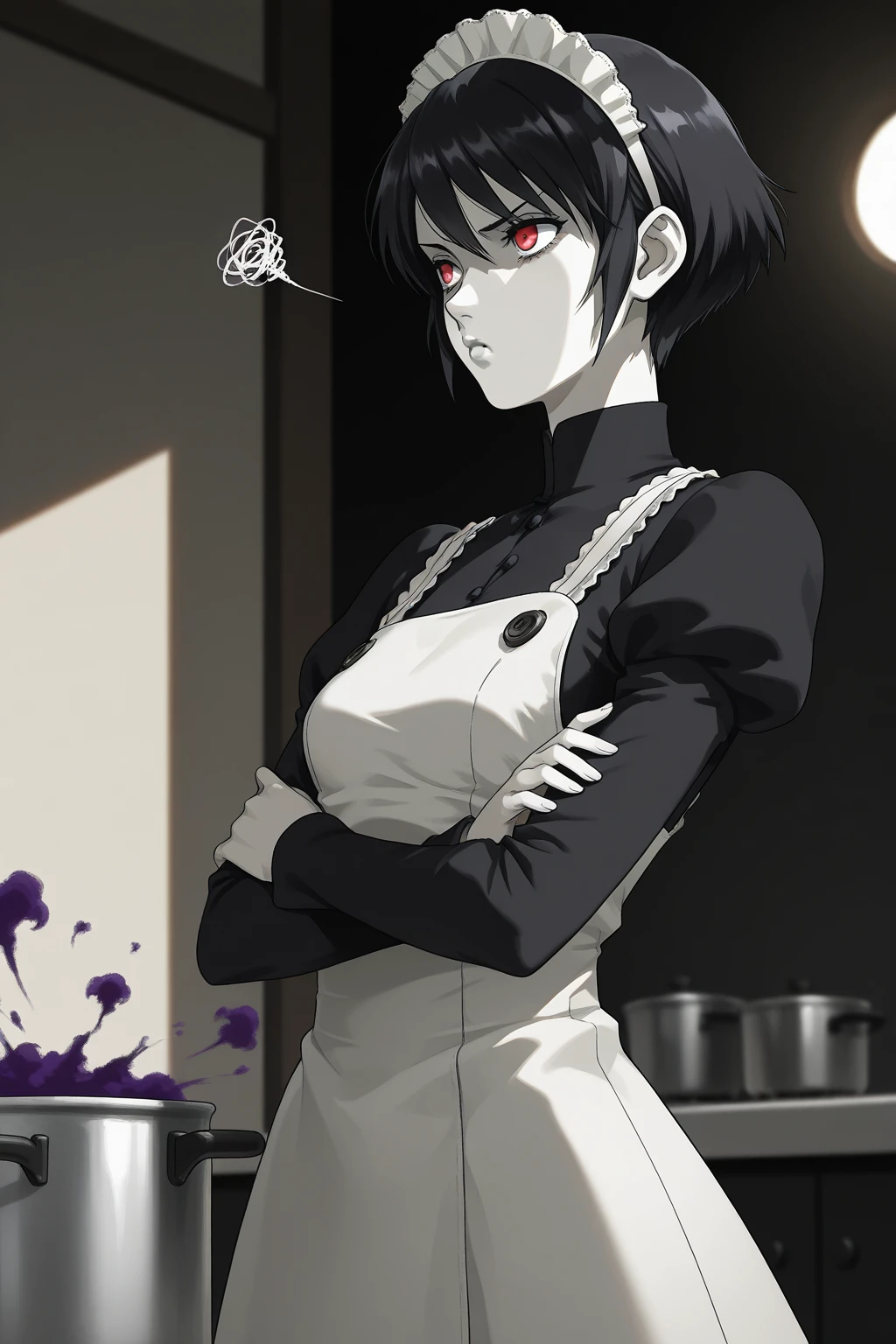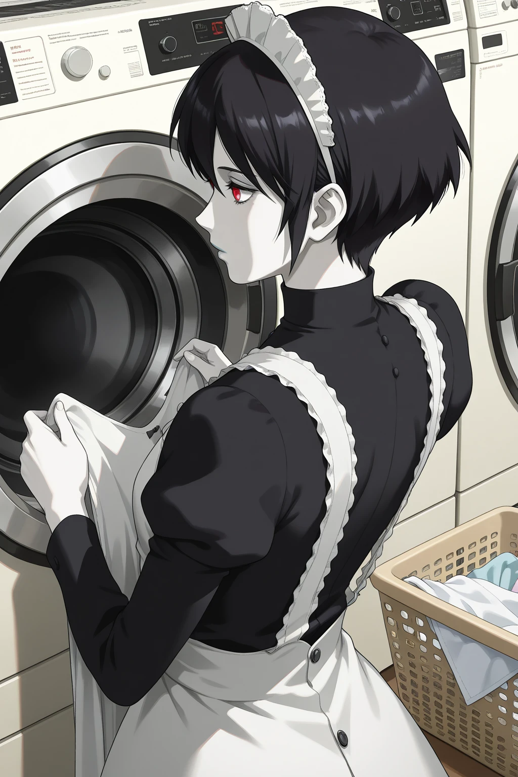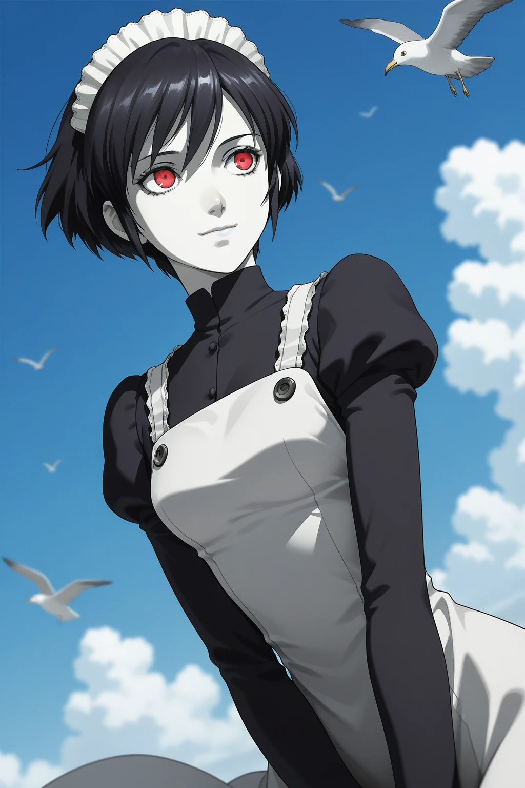 MYSH, short hair, black hair, red eyes, white lips, breasts, maid headdress, turtleneck, black shirt, juliet sleeves, long sleeves, maid apron, white apron, shoes