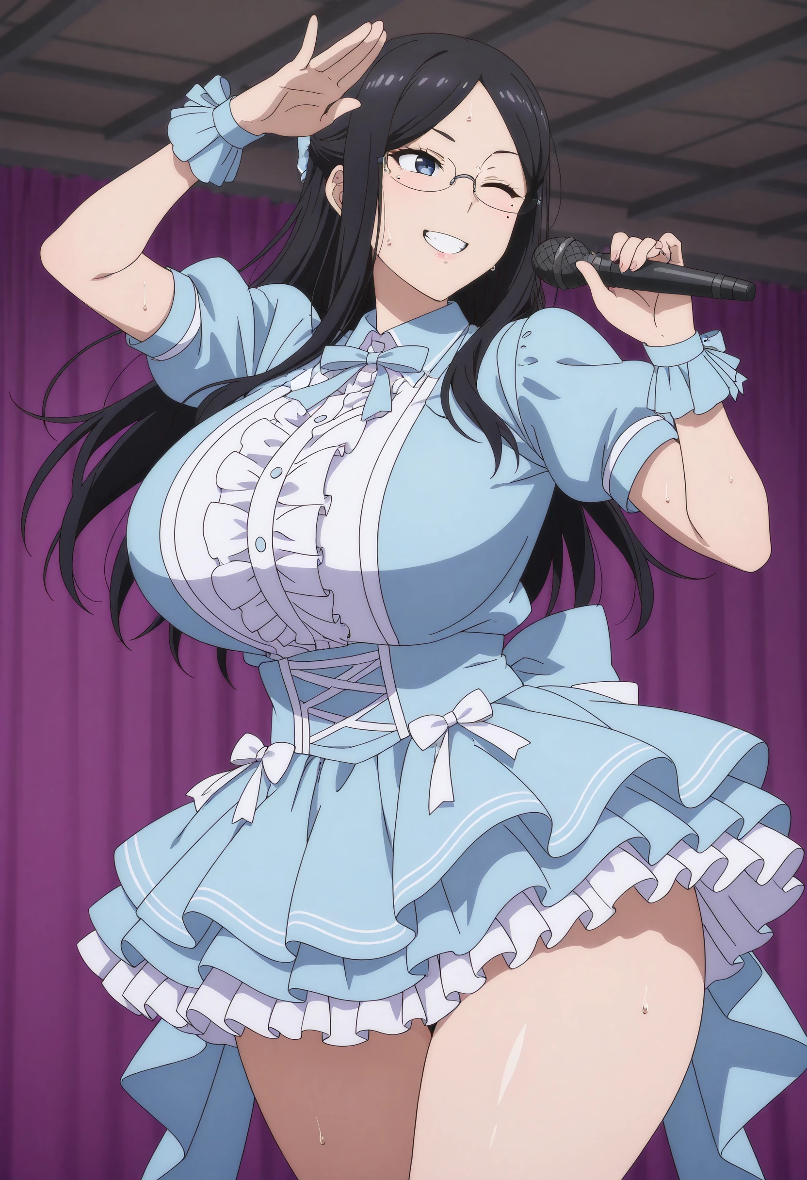 Essential keywords: Misaki Gundou, 1girl, solo, long hair, blue eyes, black hair, glasses, rimless eyewear, mole under eye | pantyhose, skirt, formal, suit, office lady, pencil skirt, jacket, black pantyhose, shirt