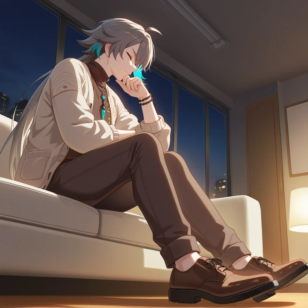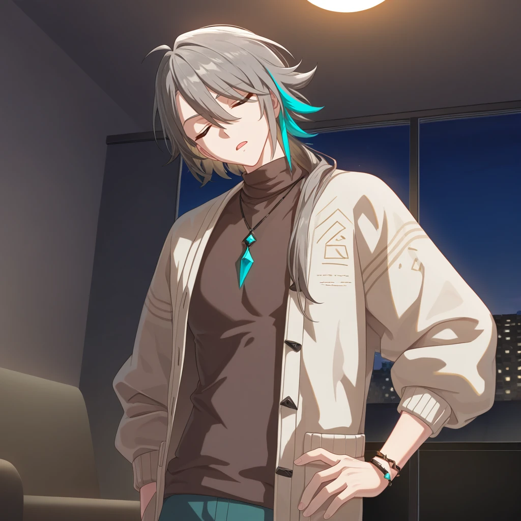 SuHi3, Su_Anm, grey hair, low ponytail, brown sweater, turtleneck, open cardigan, light brown cardigan, light brown sleeves, sleeves past elbows, puffy long sleeves, pendant, streaked hair, teal streaks, dark brown pants, alt pants, multiple bracelets,Su v1.0 (Pony)