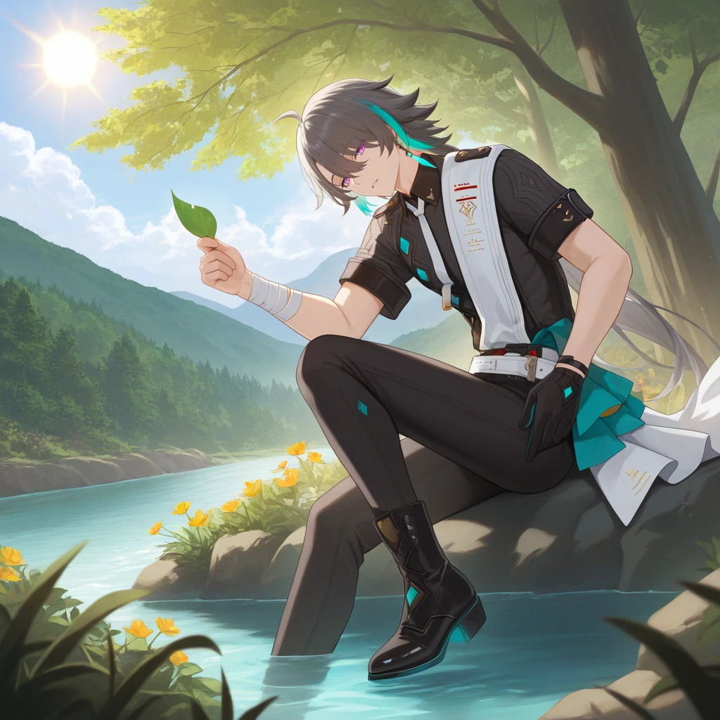 SuHi3, Su_Def, grey hair, low ponytail, black shirt, collared shirt, white necktie, white stole, short sleeves, black sleeve cuffs, black sleeves, single half glove, black gloves, bandaged wrist, waist cape, loose belt, white belt, black pants, pants, streaked hair, teal streaks, earrings, teal trim, white sash,Summer Outfit: