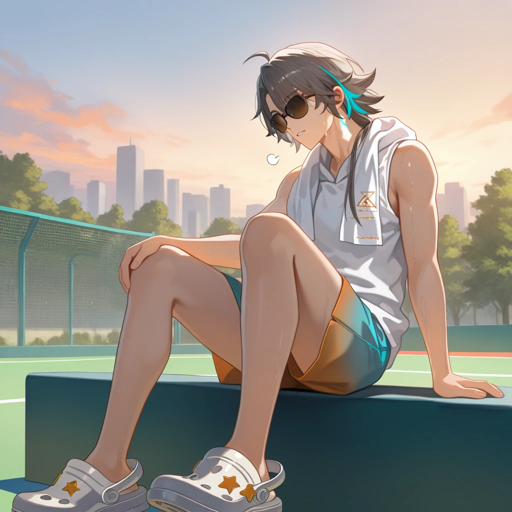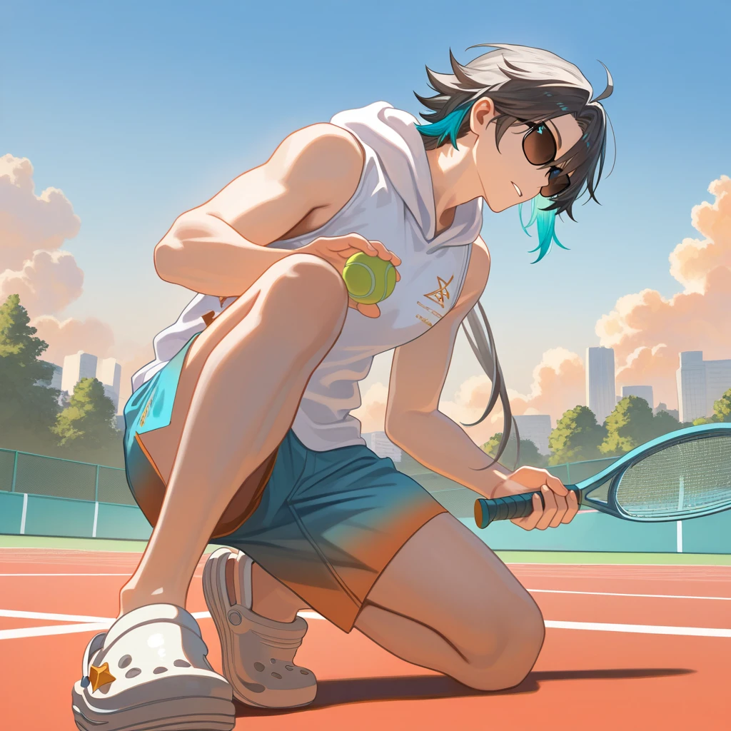 SuHi3, Su_Sum, grey hair, low ponytail, sleeveless hoodie, white hoodie, gradient shorts, light blue shorts, crocs, white footwear, streaked hair, teal streaks, eyewear removed, sunglasses,Animation Outfit: