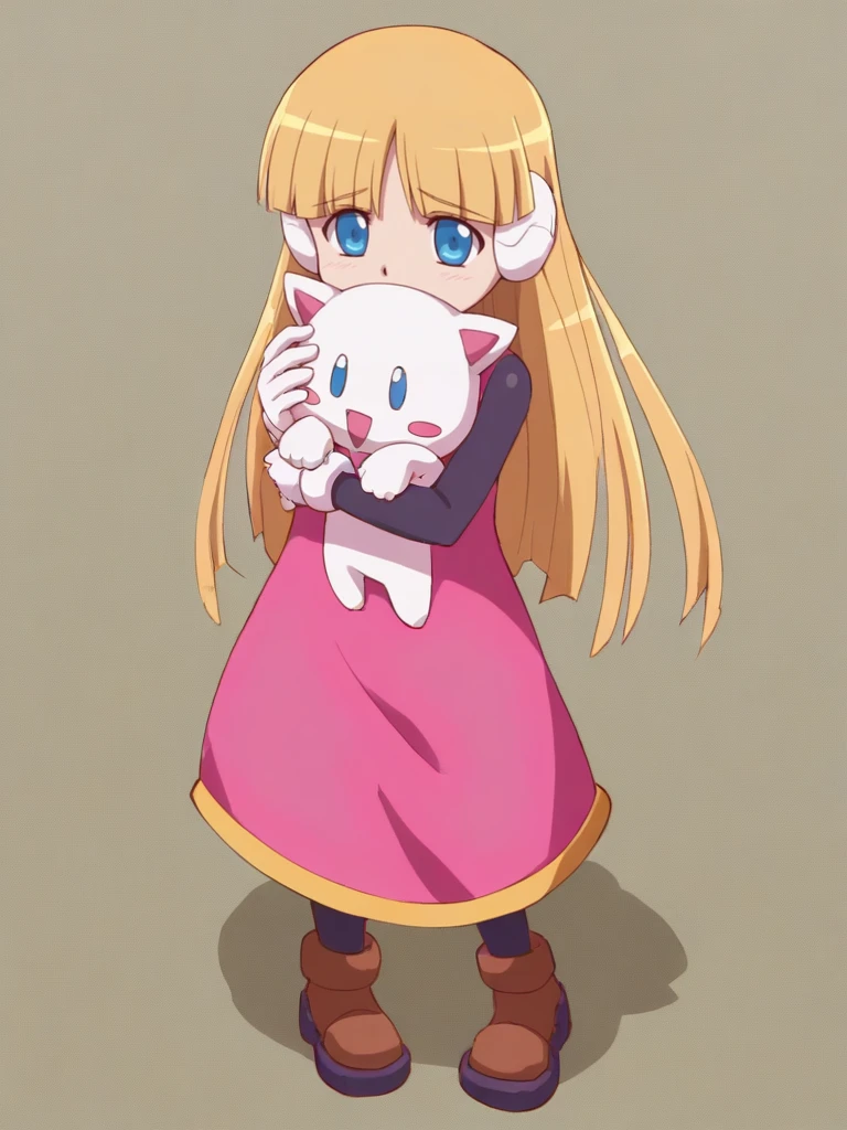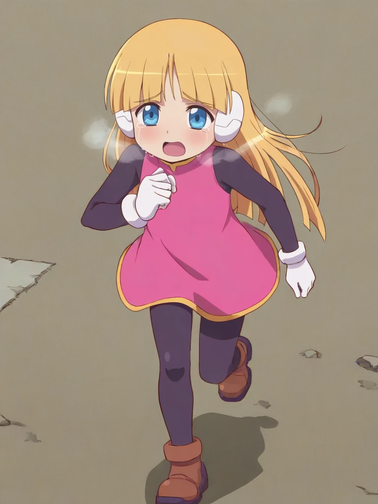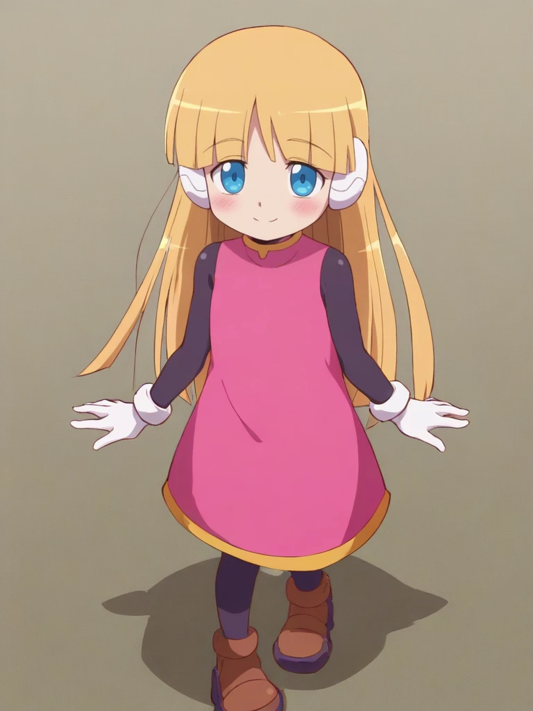blonde hair, long hair, blue eyes, brown shoes, pink dress, black bodysuit, gloves, robot ears